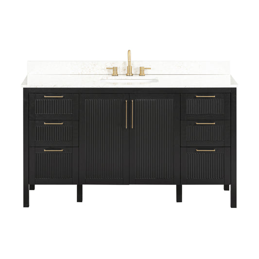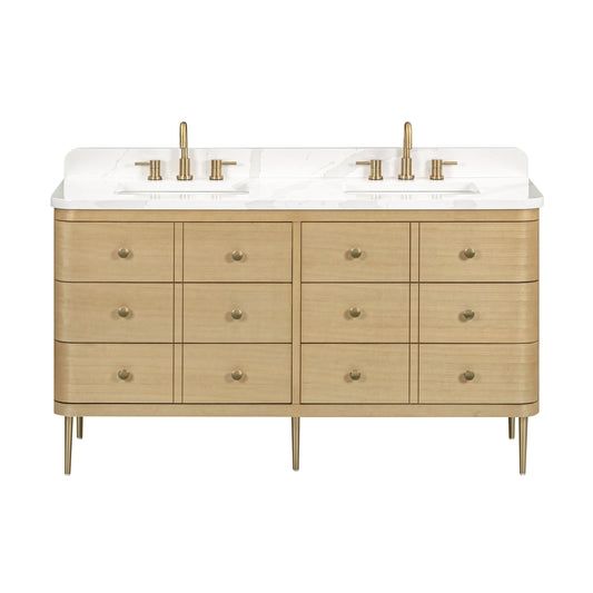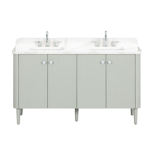 showcases a light green finish with reeded-texture doors, adding depth and elegance. Rounded corners create a soft, fluid profile, while the solid wood frame enhances durability and adds design contrast. Integrated power strip with USB outlets included for convenience. A perfect fusion of artistry and practicality, Hayley brings smart sophistication to any bathroom space.