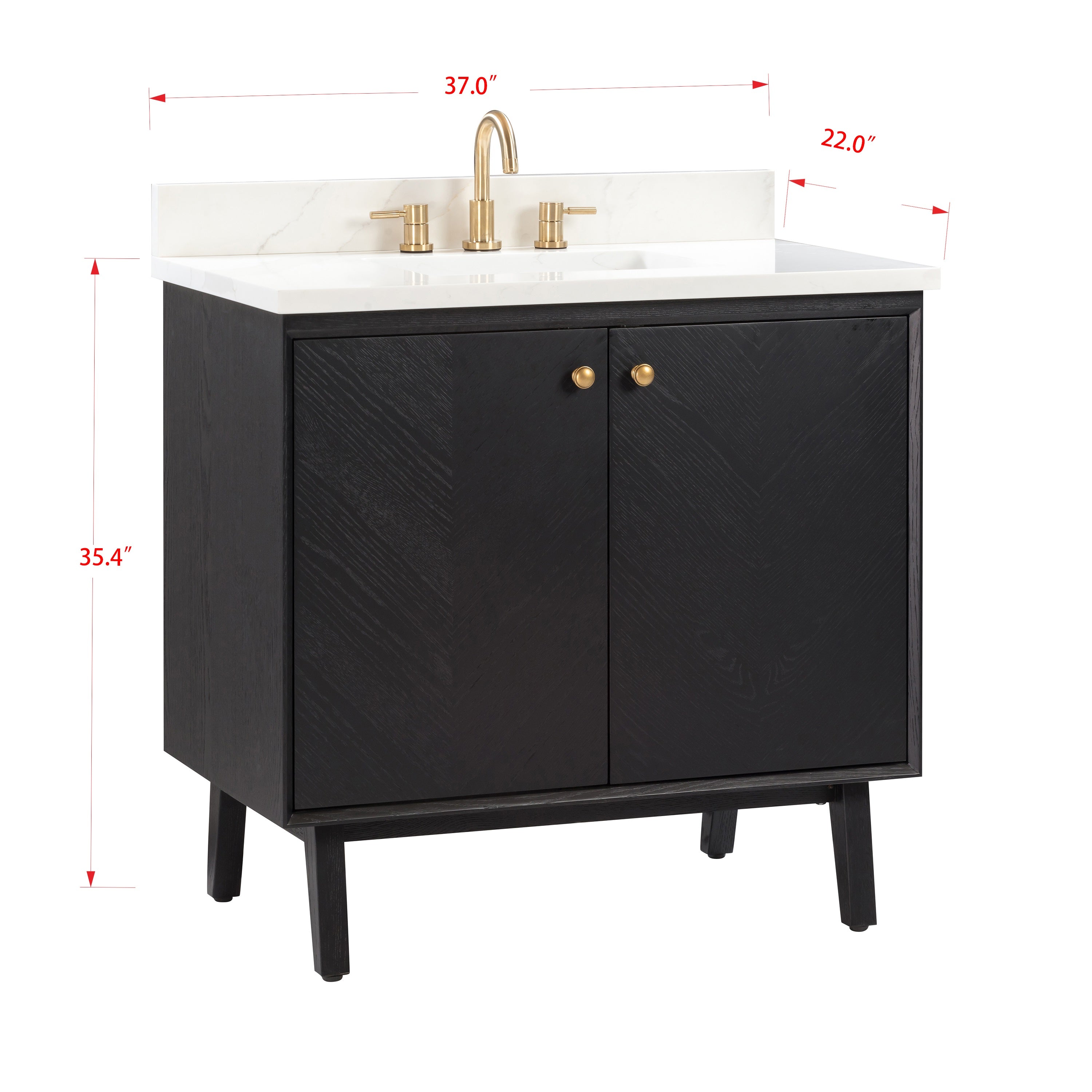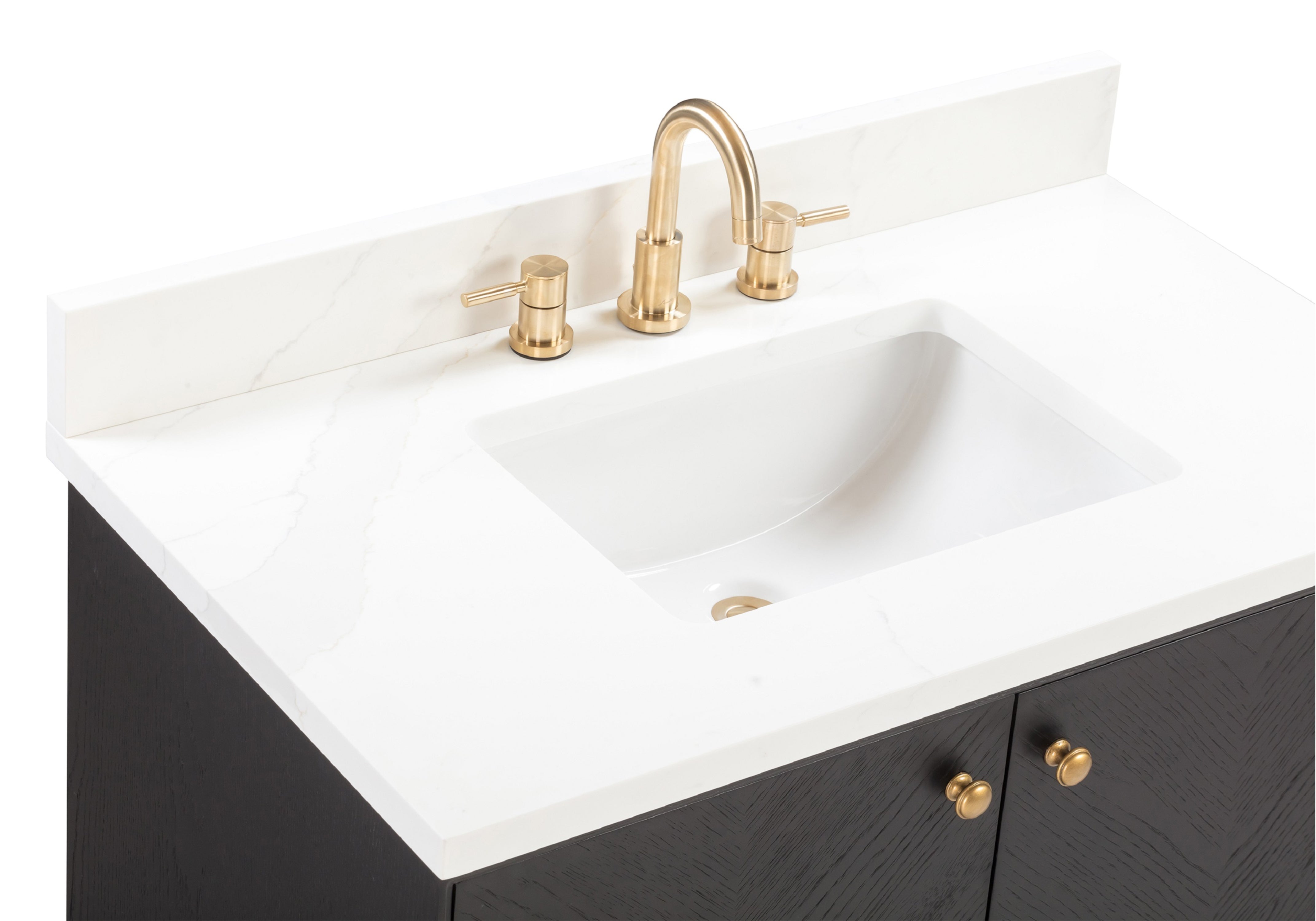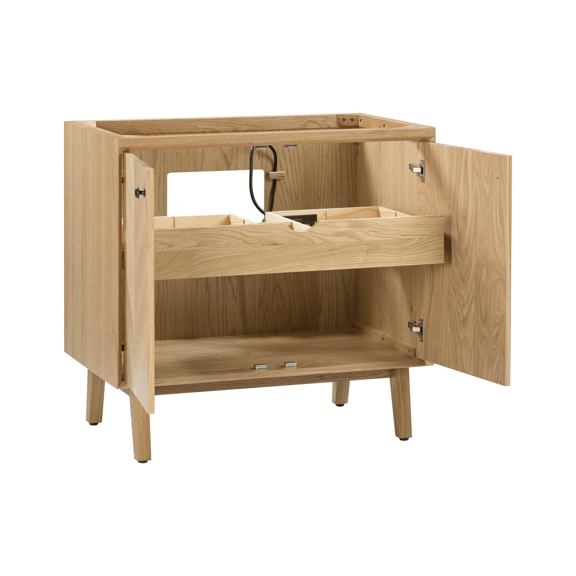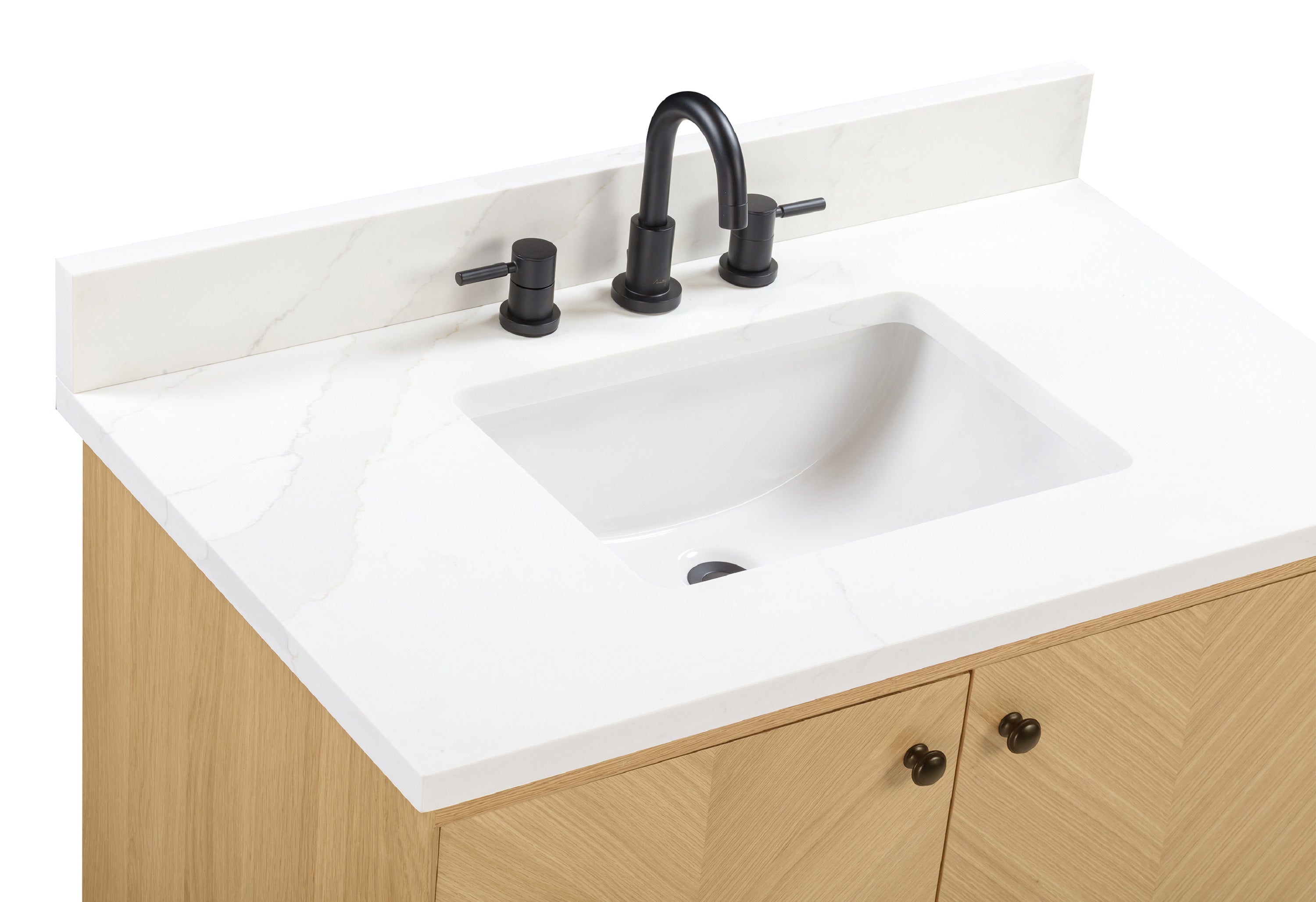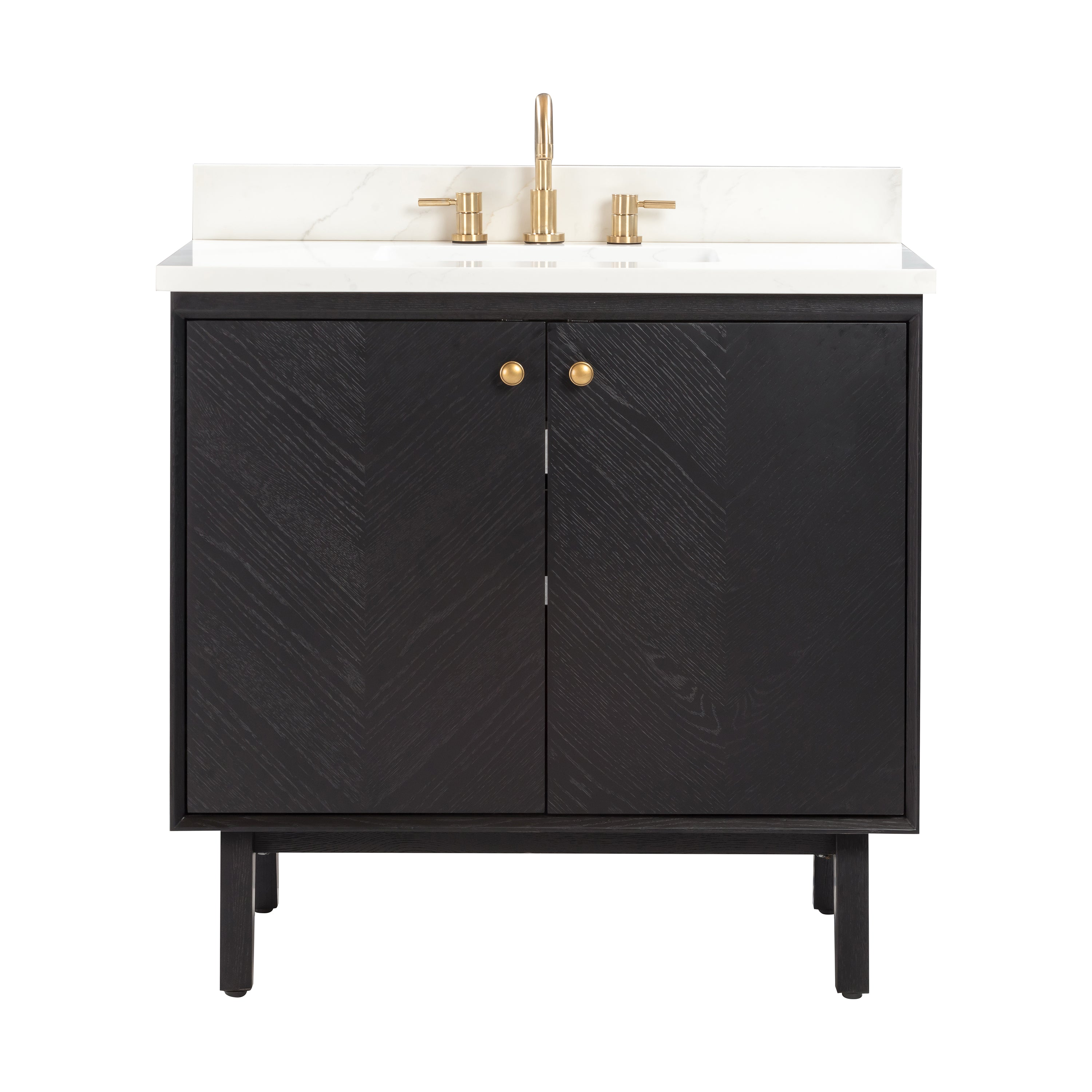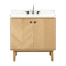 Add allure to your bathroom with the Adele 36-inch vanity by Avanity. The cabinet features a gorgeous oak finish with subtle chevron patterns gracing the flat-panel doors. The solid wood frame provides durability, and the pre-installed brass hardware complements the beauty of the real wood grain. The spacious cabinet and interior drawer provide ample storage for your toiletries and accessories, while the soft-close hinges and glides ensure smooth and quiet operation. An integrated power strip contains dual electrical and USB. Whether you want to create a rustic, farmhouse, or modern look, Adele will dazzle in any bathroom style you choose.