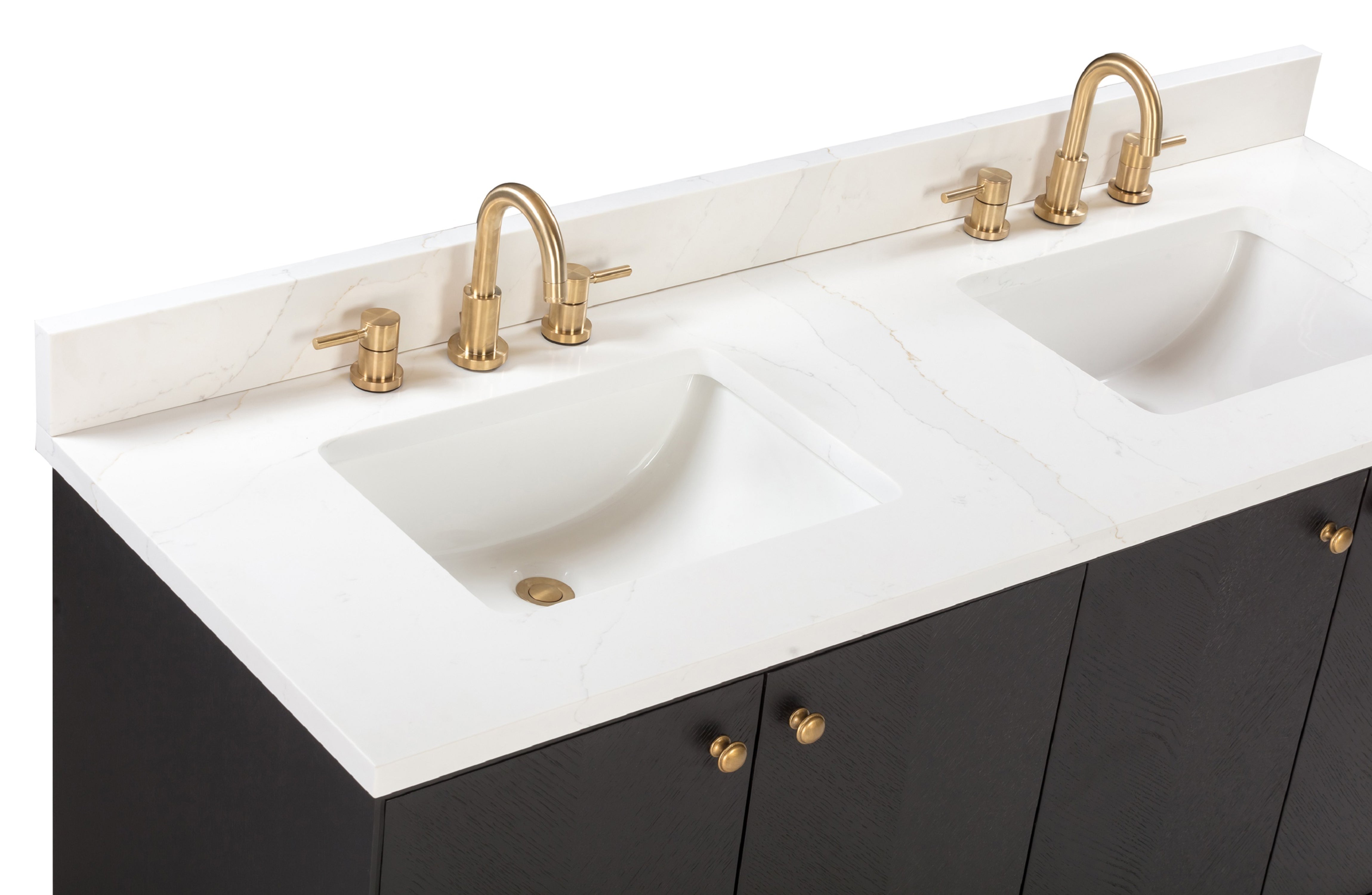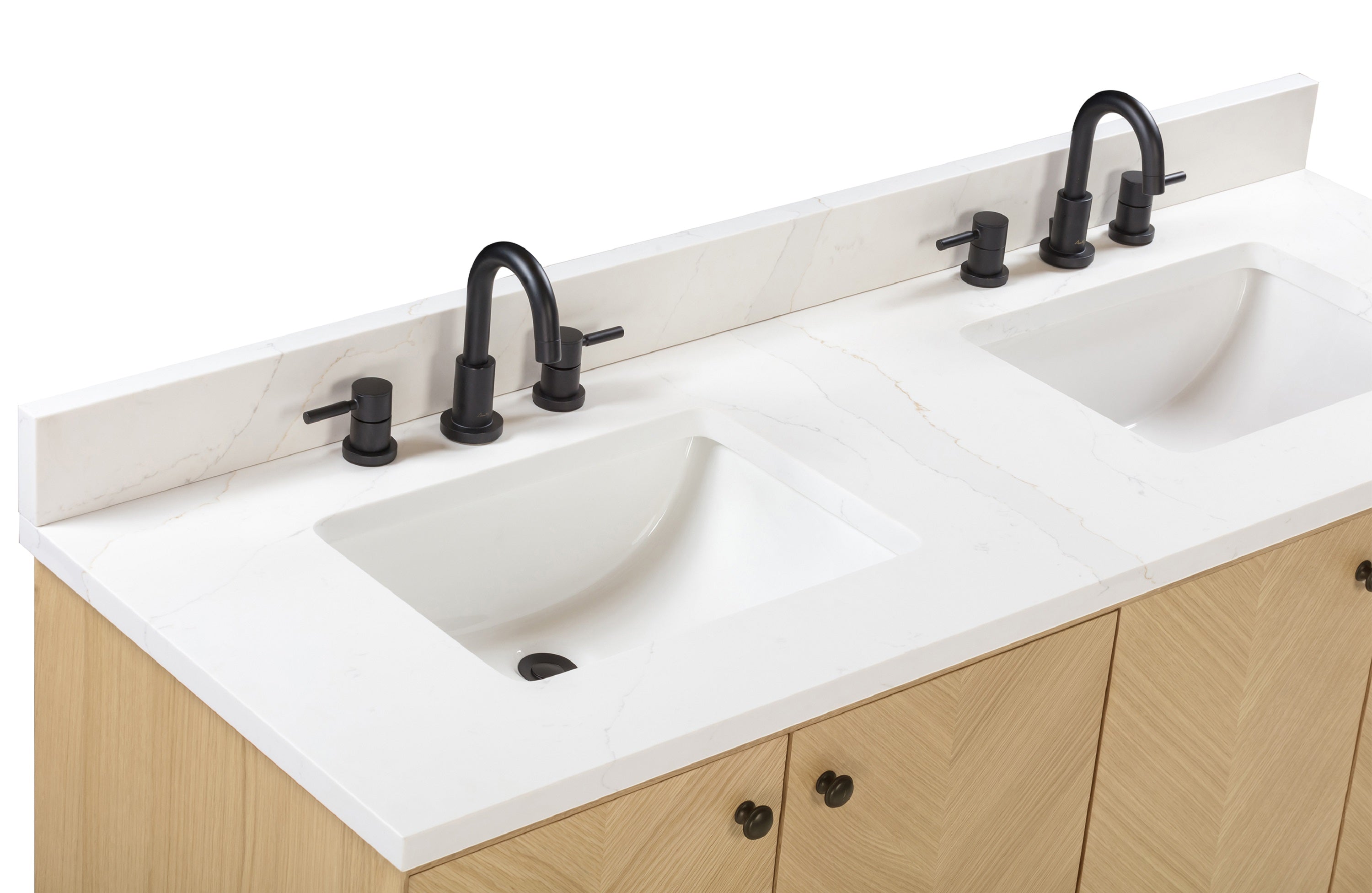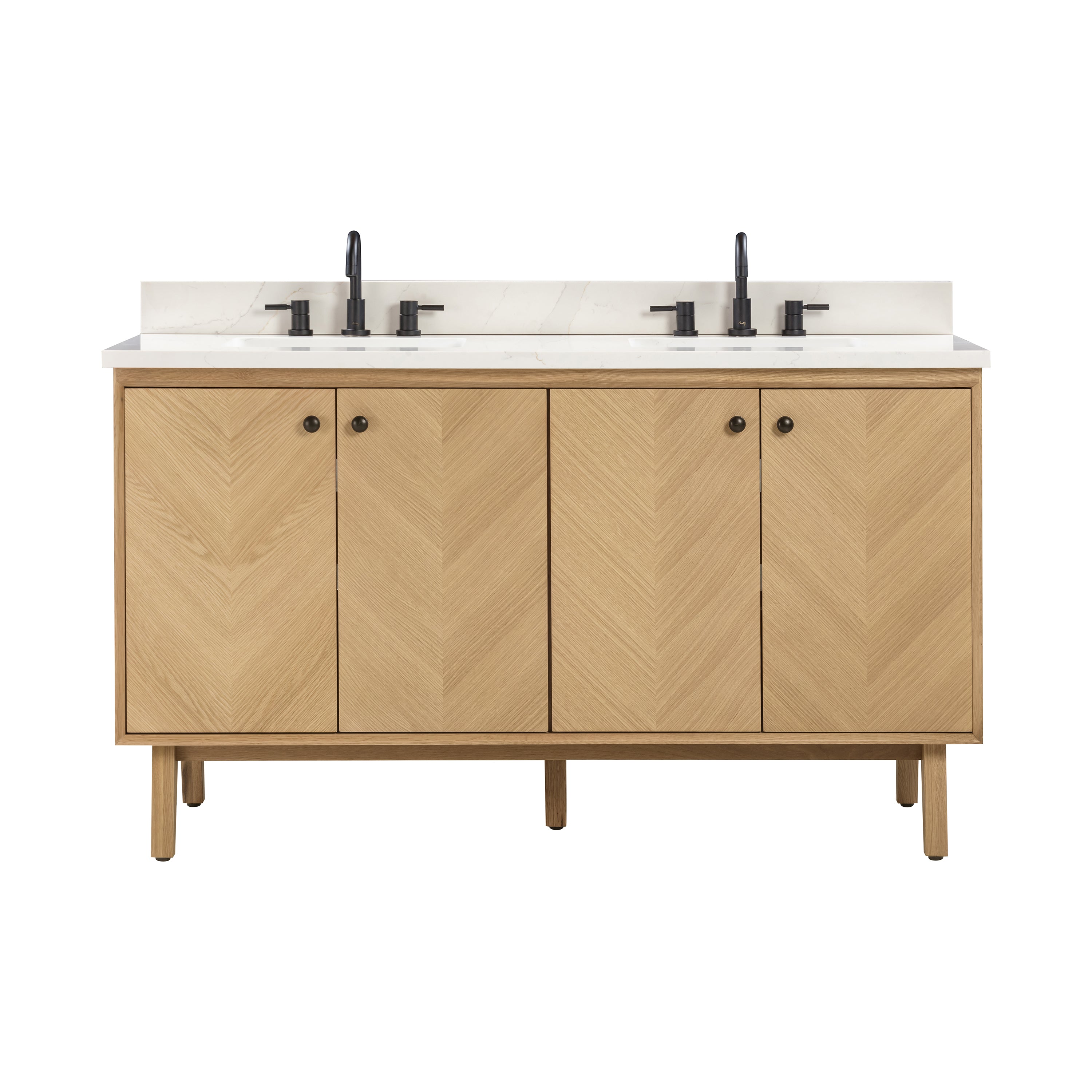 Add allure to your bathroom with the Adele 60-inch double vanity by Avanity. The cabinet features a gorgeous oak finish with subtle chevron patterns gracing the flat-panel doors. The solid wood frame provides durability, and the pre-installed brass hardware complements the beauty of the real wood grain. The spacious cabinet and two interior drawers provide ample storage for your toiletries and accessories, while the soft-close hinges and glides ensure smooth and quiet operation. An integrated power strip contains dual electrical and USB. Whether you want to create a rustic, farmhouse, or modern look, Adele will dazzle in any bathroom style you choose.