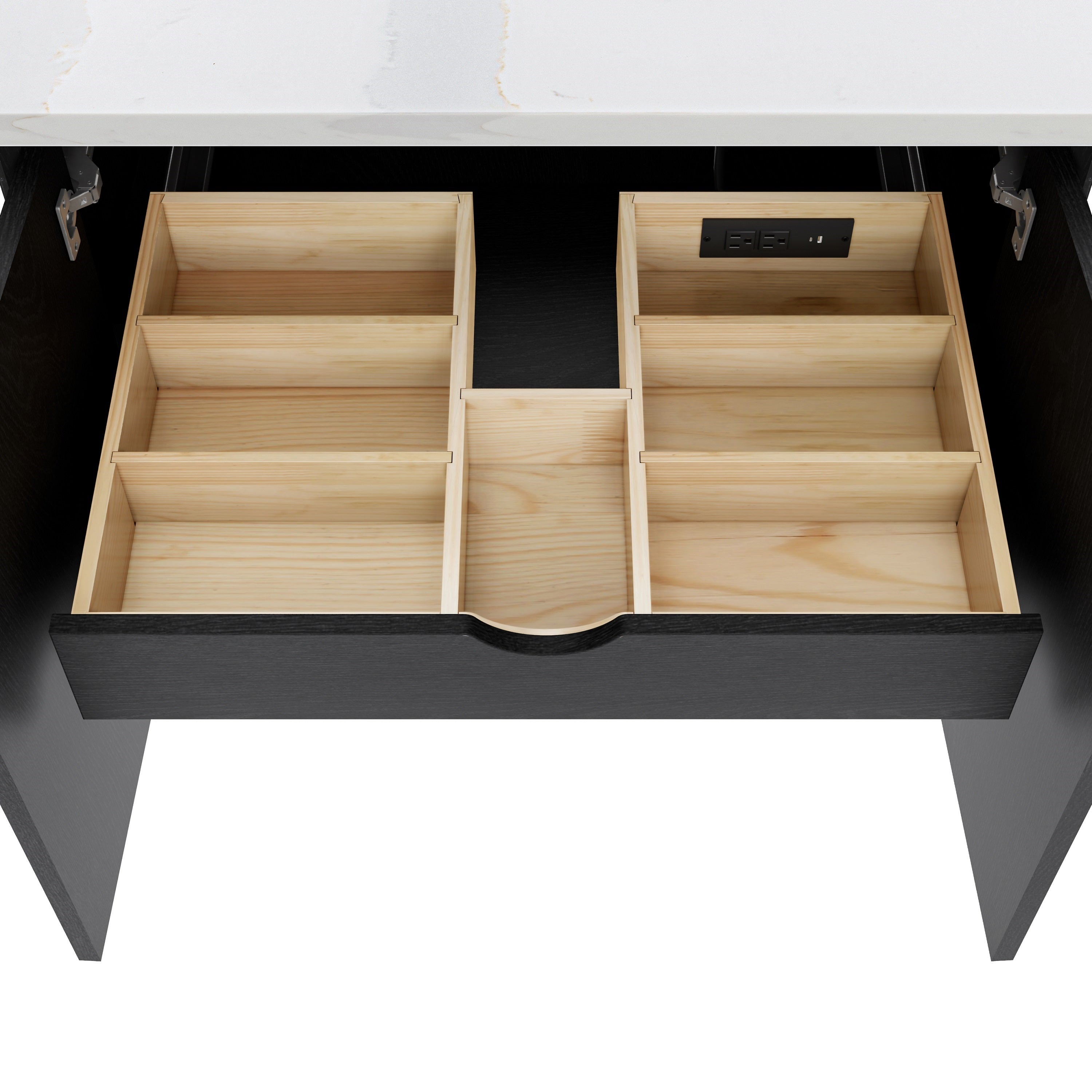 - The soft-close interior drawer features an integrated power strip with electrical and USB outlets