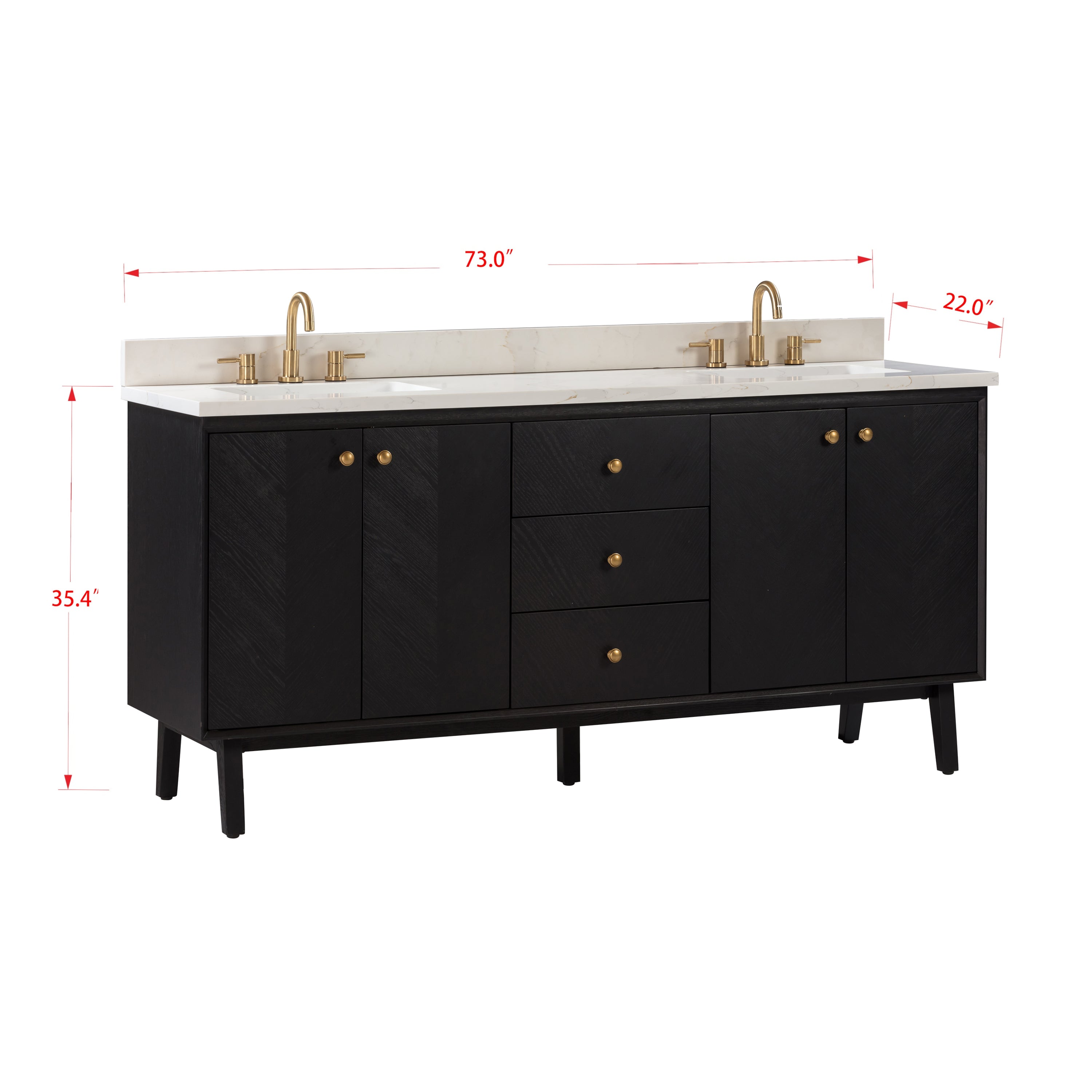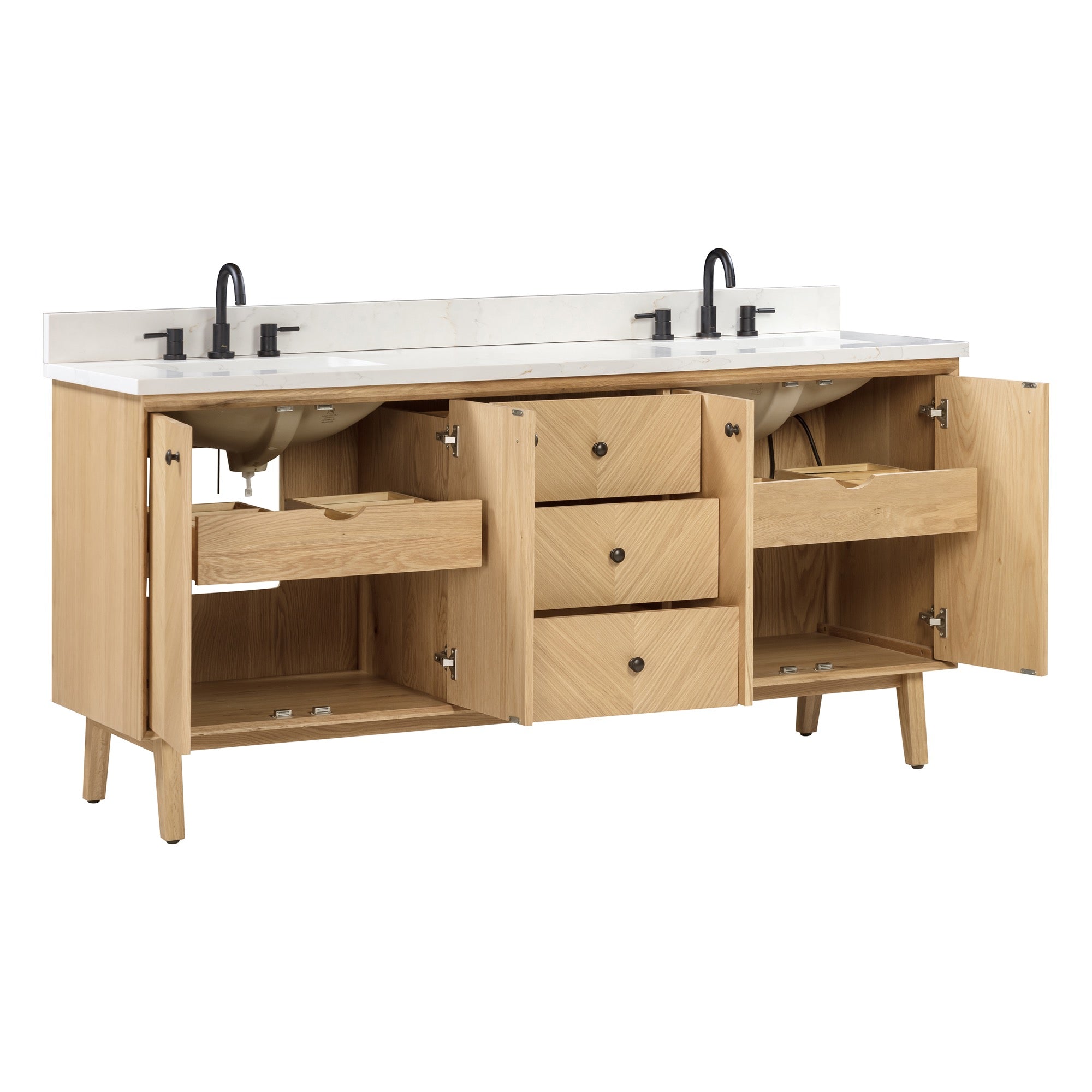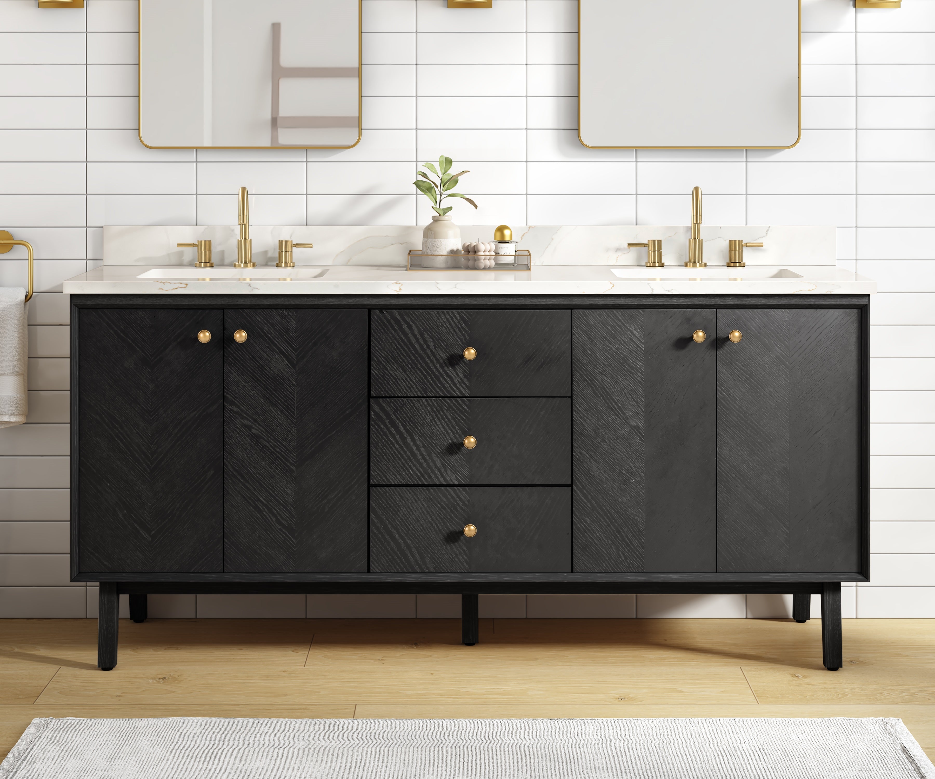 Add allure to your bathroom with the Adele 72-inch double vanity by Avanity. The cabinet features a gorgeous oak finish with subtle chevron patterns gracing the flat-panel doors. The solid wood frame provides durability, and the pre-installed brass hardware complements the beauty of the real wood grain. The spacious cabinet, three pull out drawers, and two interior drawers provide ample storage for your toiletries and accessories, while the soft-close hinges and glides ensure smooth and quiet operation. An integrated power strip contains dual electrical and USB. Whether you want to create a rustic, farmhouse, or modern look, Adele will dazzle in any bathroom style you choose.