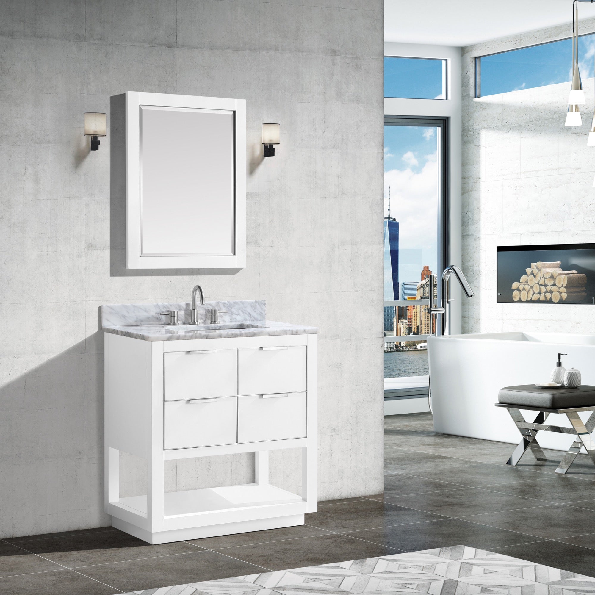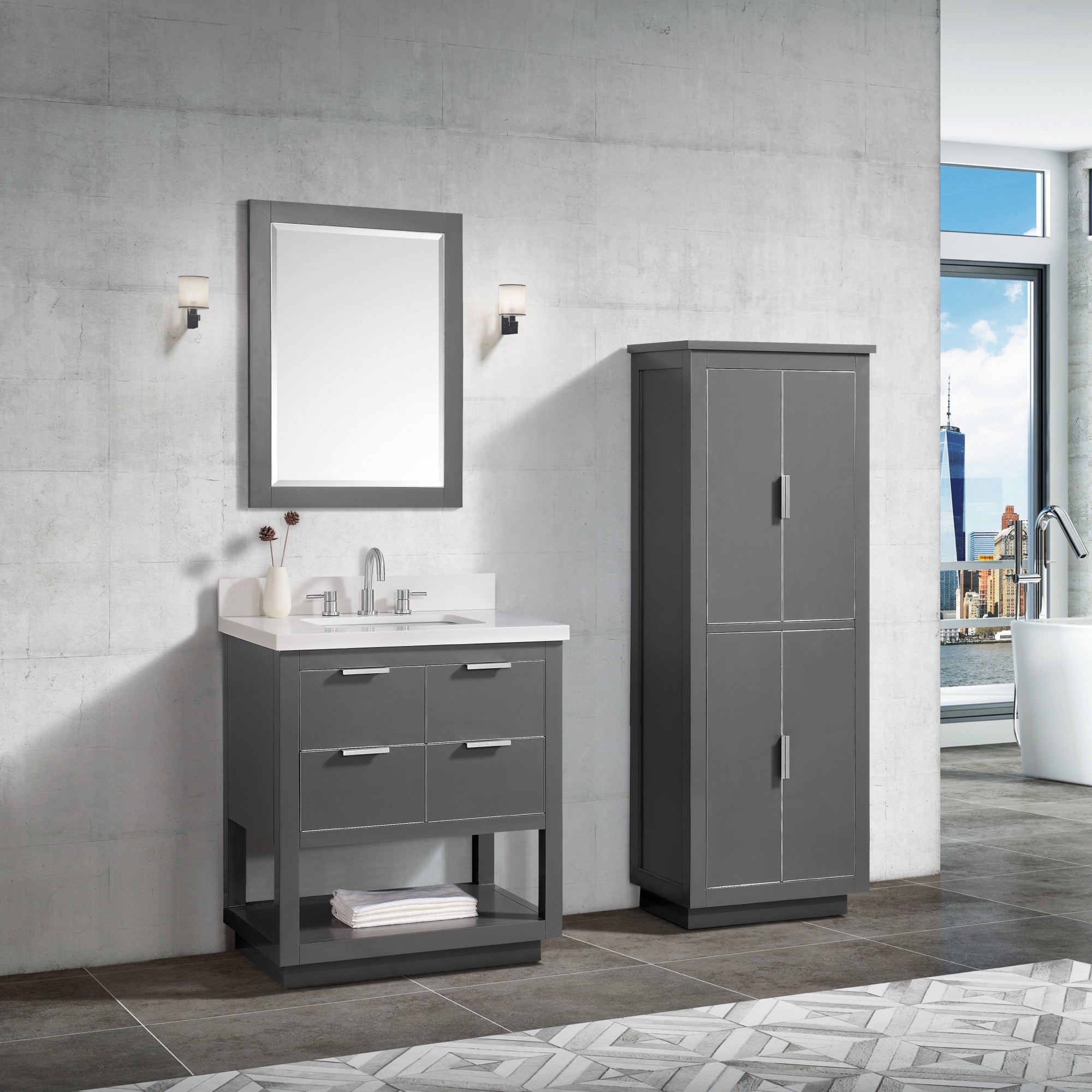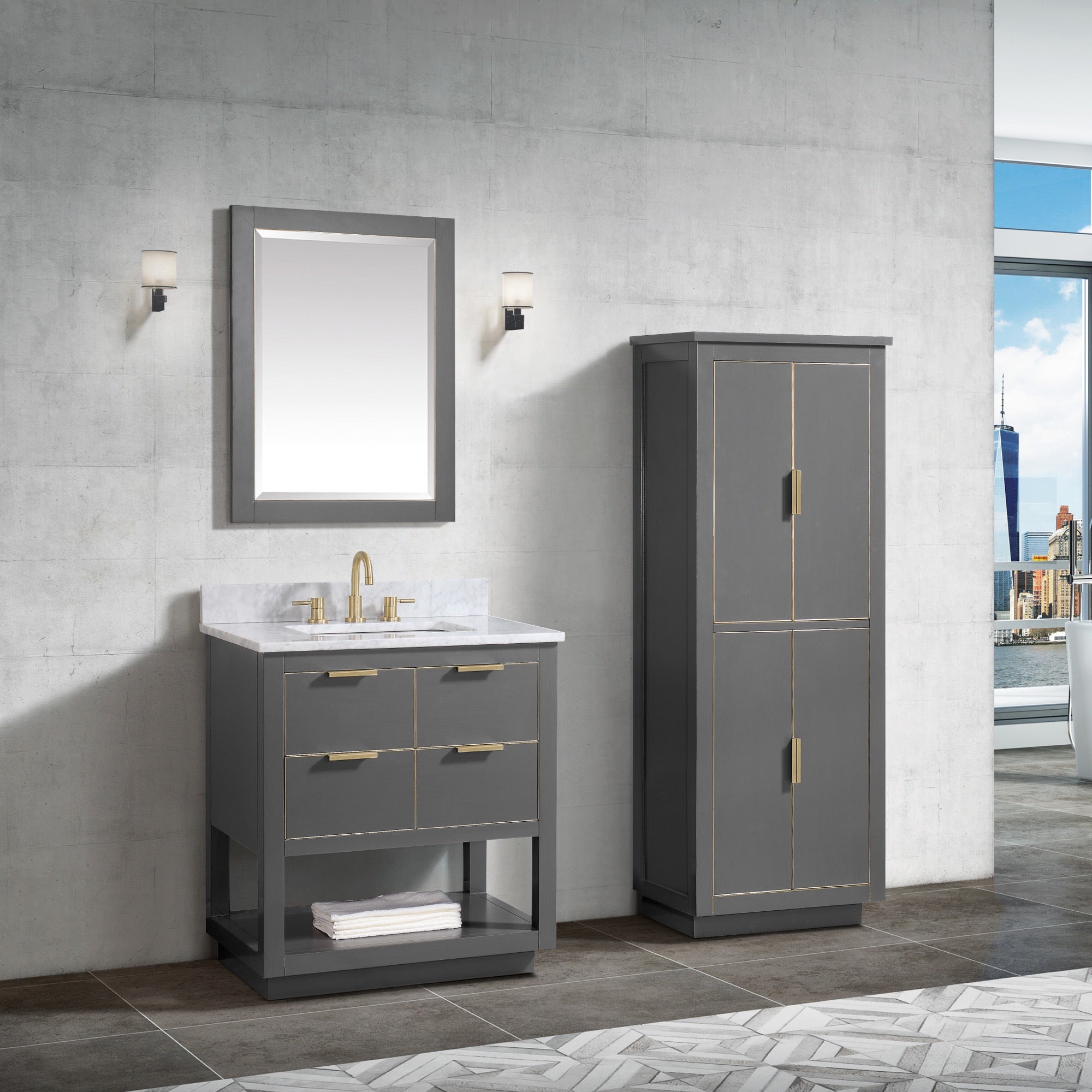 The Allie 30 in. vanity brings to you good looks and generous storage. An uncomplicated design scheme gains luster from the sophisticated Twilight Gray or White finish with matte gold/silver trim and hardware. A solid wood frame, plywood drawer boxes, dovetail joints, a convenient toe kick, and soft-close glides and hinges testify to the quality of construction. A large open shelf provides ample storage. Complete the look with matching mirror, mirror cabinet, and linen tower. Allie is all you need to make your bathroom amazing.
