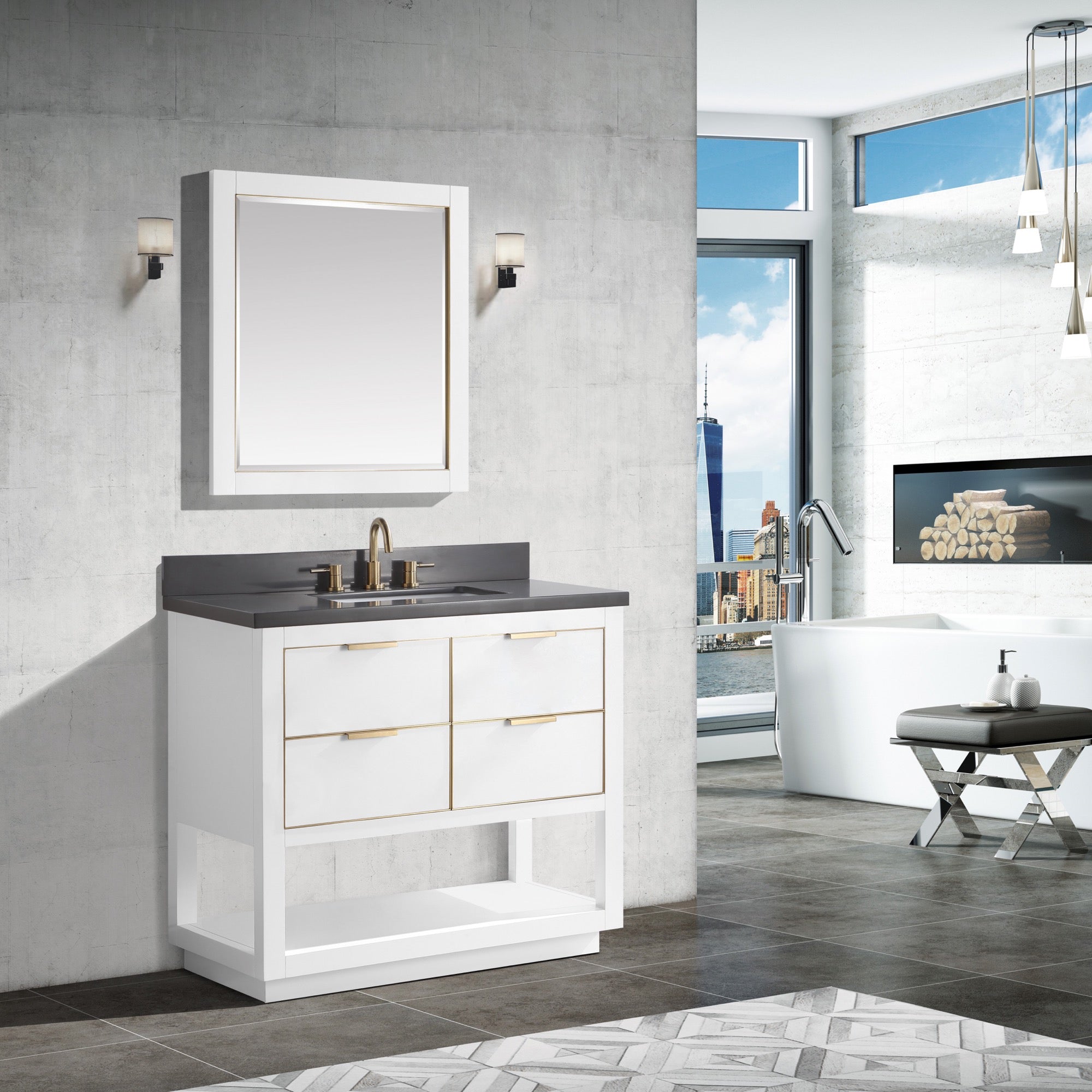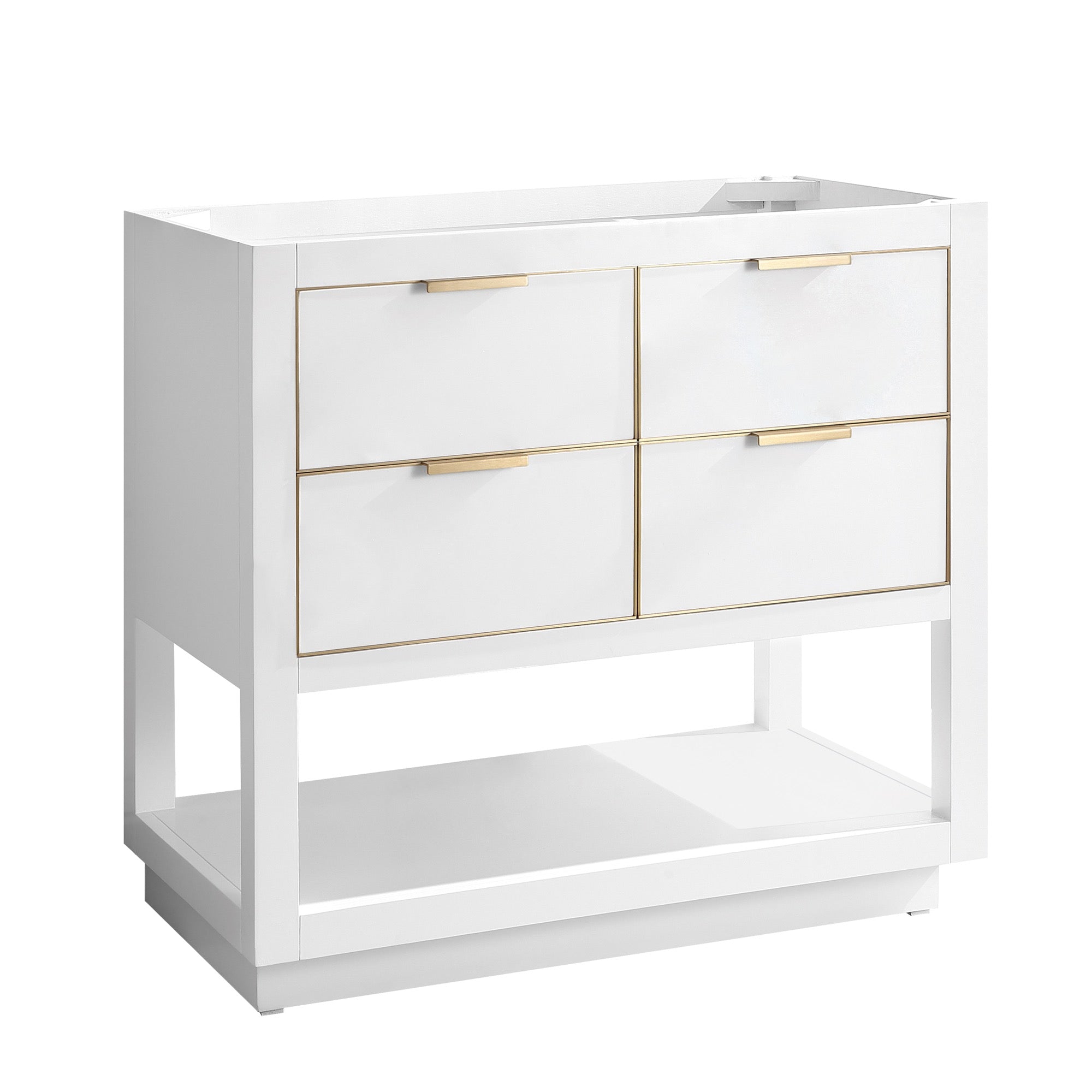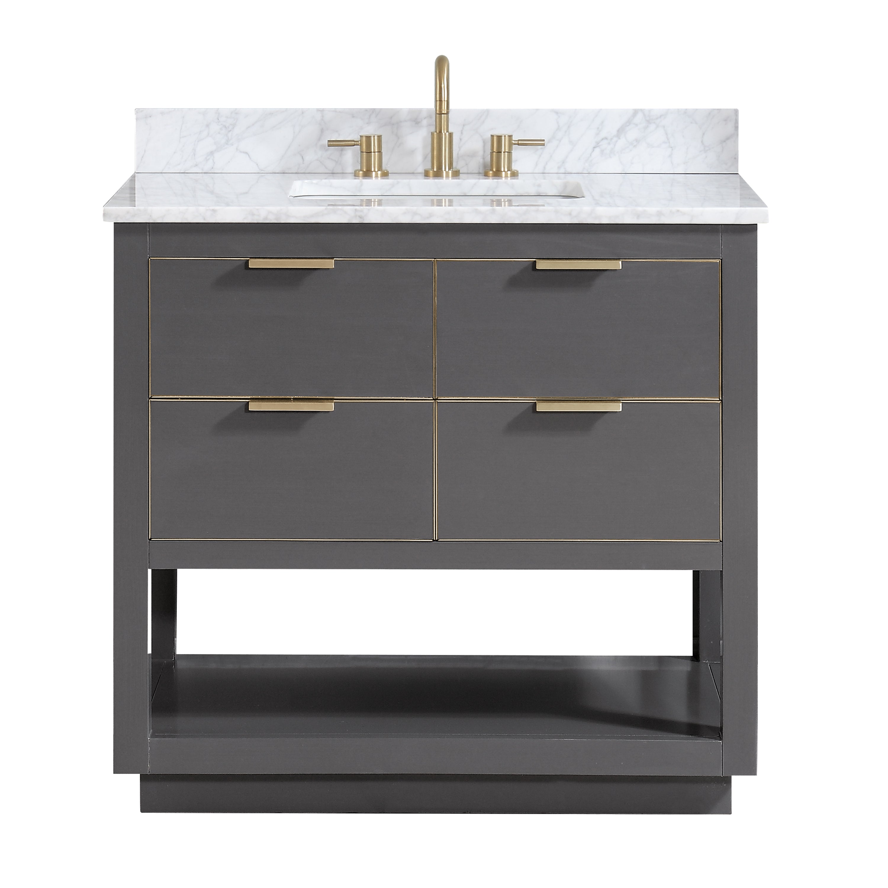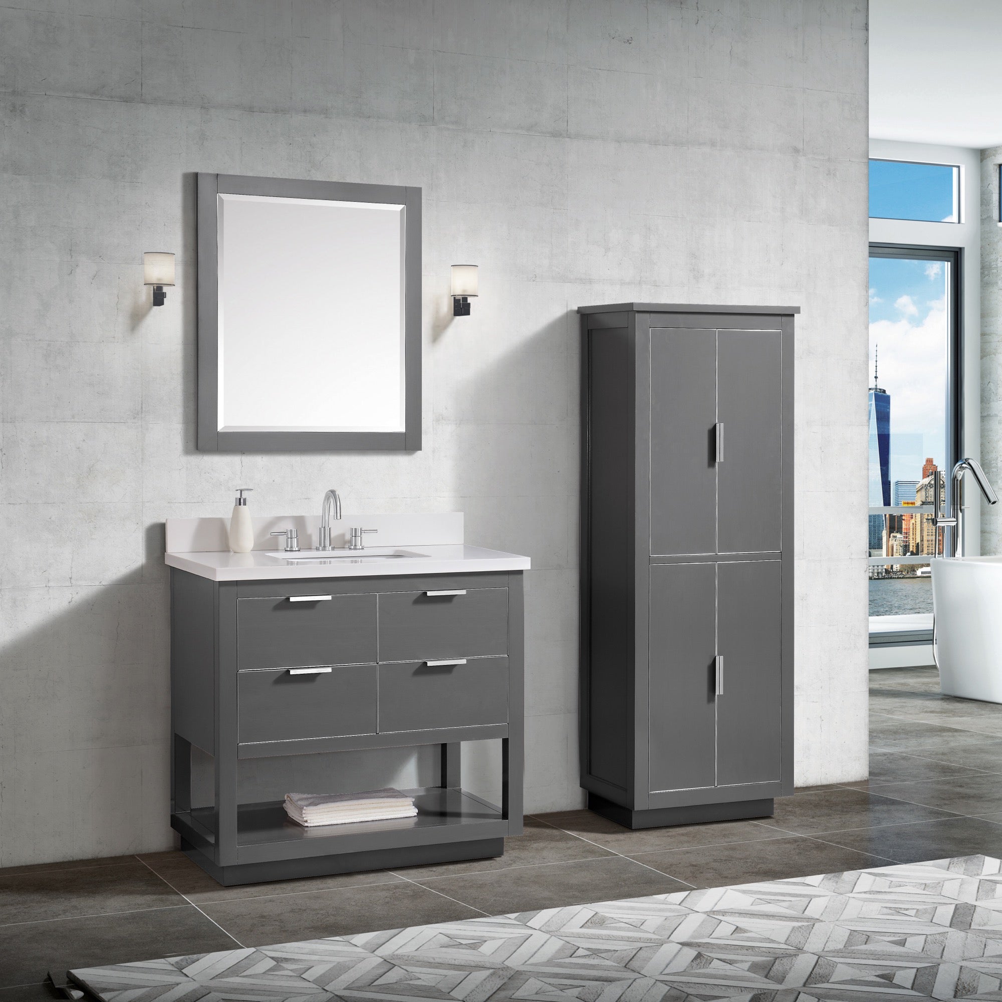 The Allie 36 in. vanity brings to you good looks and generous storage. An uncomplicated design scheme gains luster from the sophisticated Twilight Gray or White finish with matte gold/silver trim and hardware. A solid wood frame, plywood drawer boxes, dovetail joints, a convenient toe kick, and soft-close glides and hinges testify to the quality of construction. A large open shelf provides ample storage. Complete the look with matching mirror, mirror cabinet, and linen tower. Allie is all you need to make your bathroom amazing.