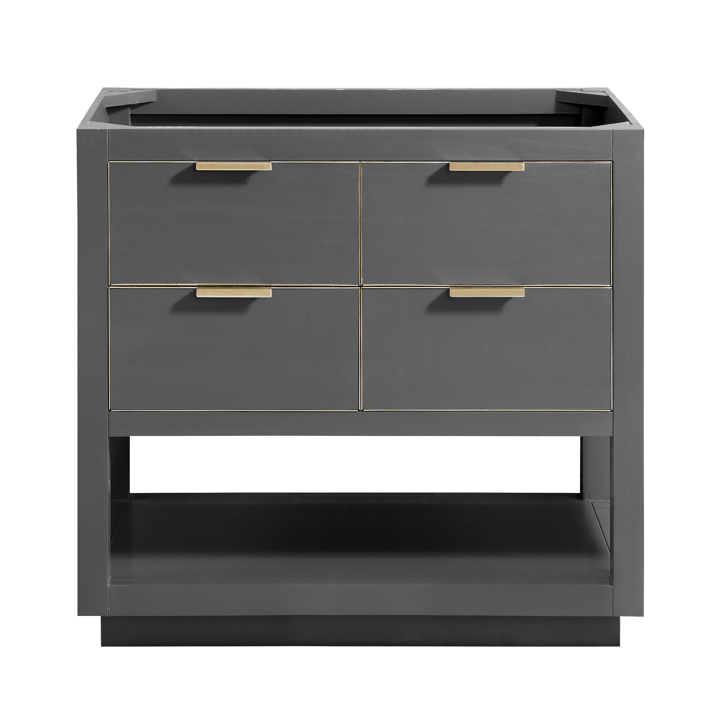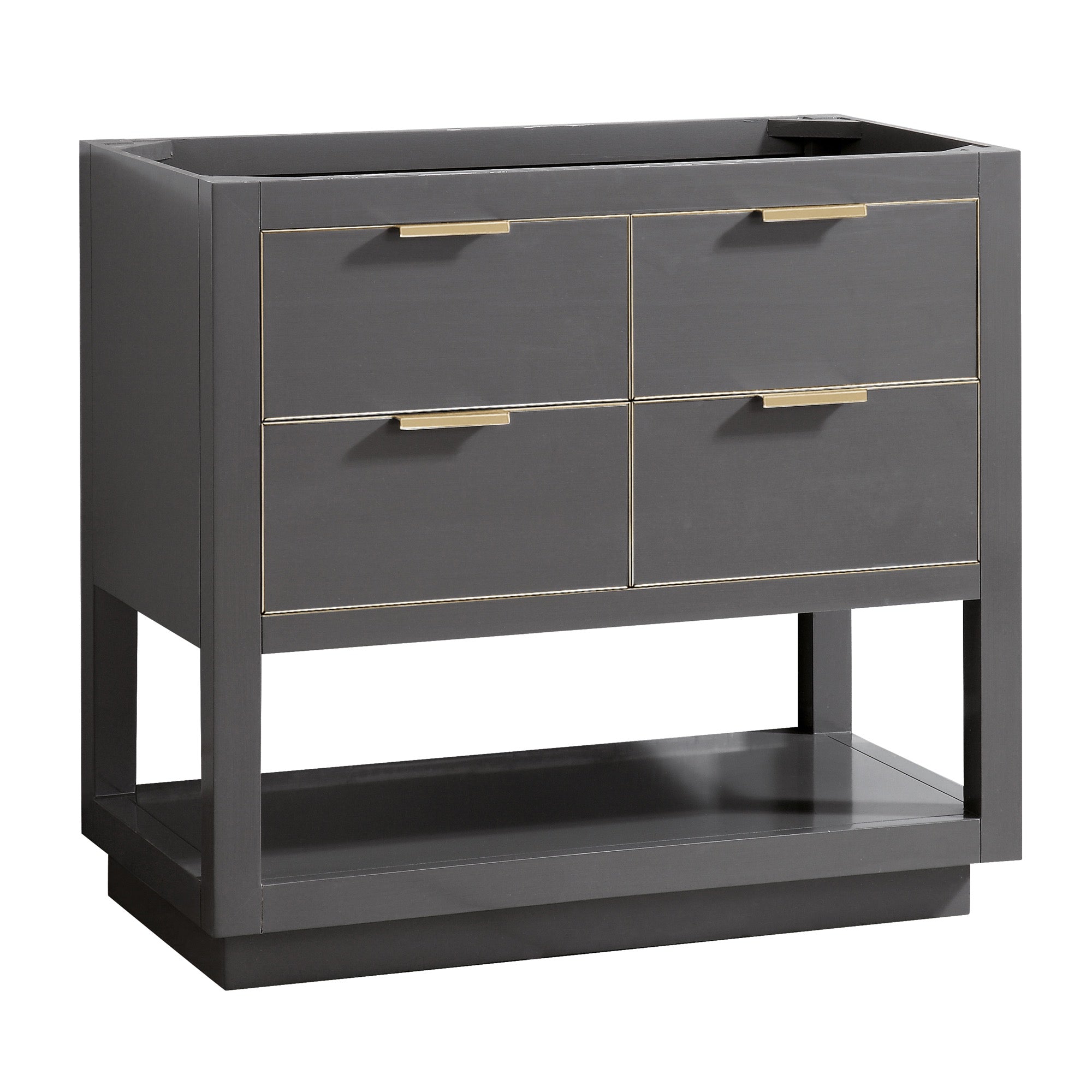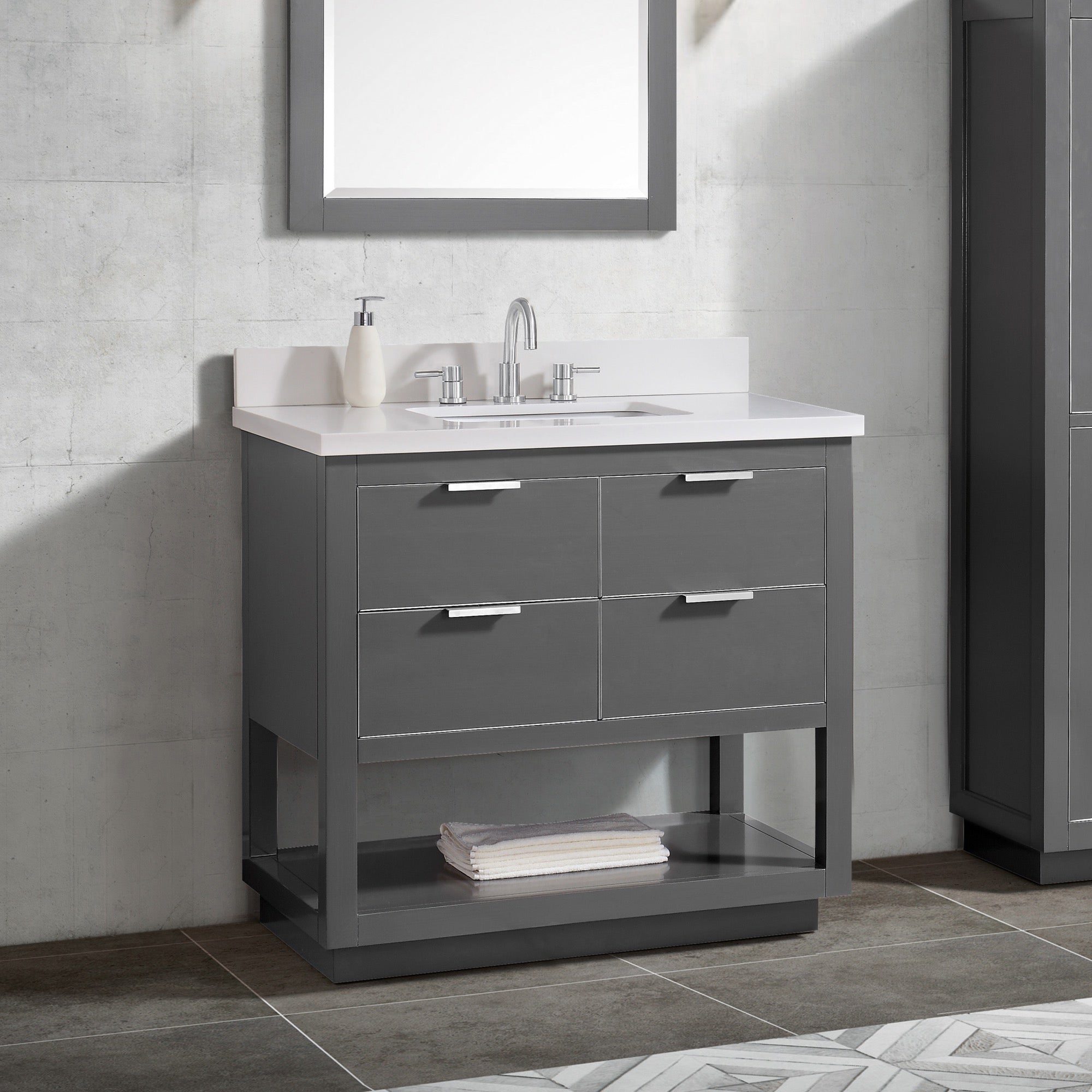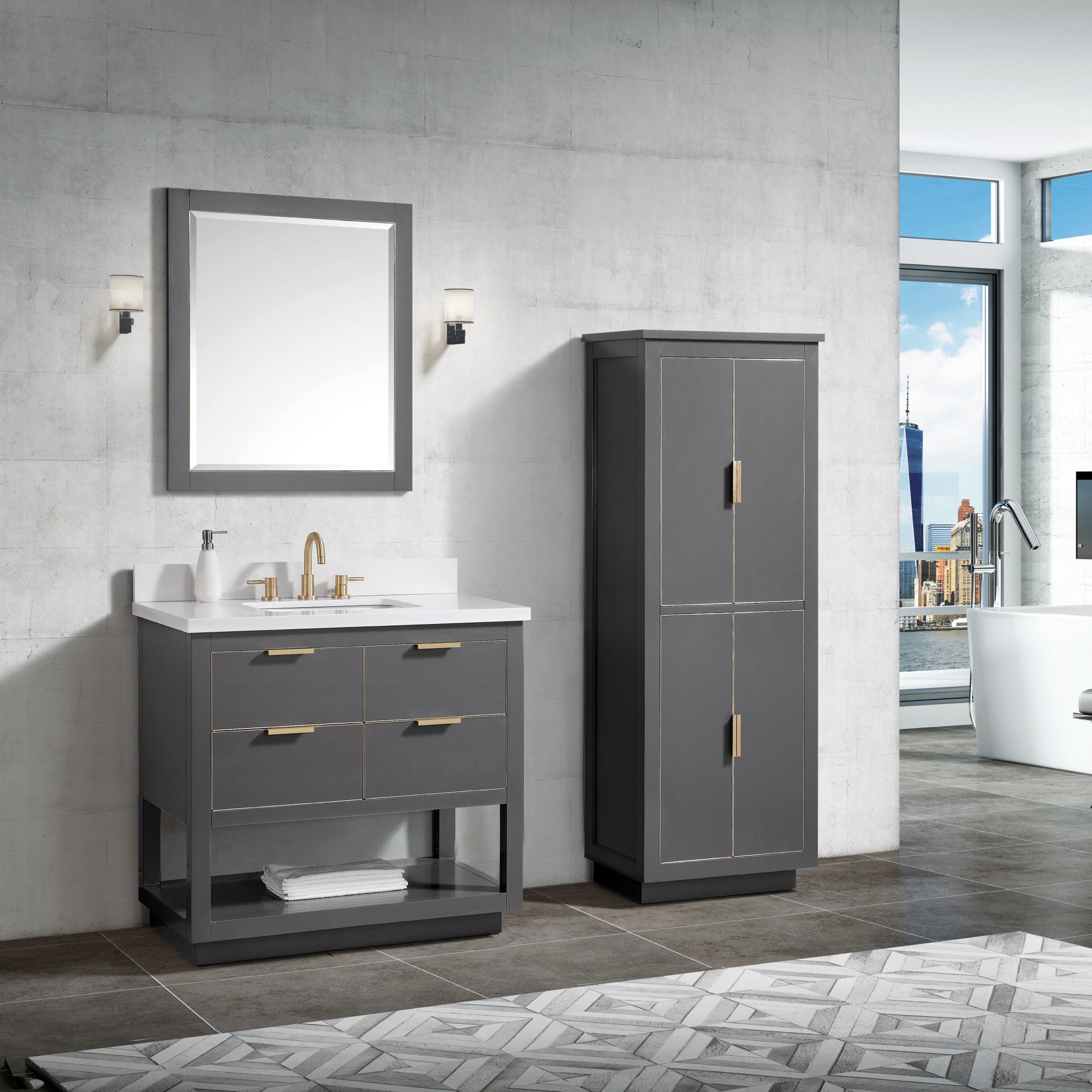 The Allie 36 in. vanity brings to you good looks and generous storage. An uncomplicated design scheme gains luster from the sophisticated Twilight Gray or White finish with matte gold/silver trim and hardware. A solid wood frame, plywood drawer boxes, dovetail joints, a convenient toe kick, and soft-close glides and hinges testify to the quality of construction. A large open shelf provides ample storage. Complete the look with matching mirror, mirror cabinet, and linen tower. Allie is all you need to make your bathroom amazing.