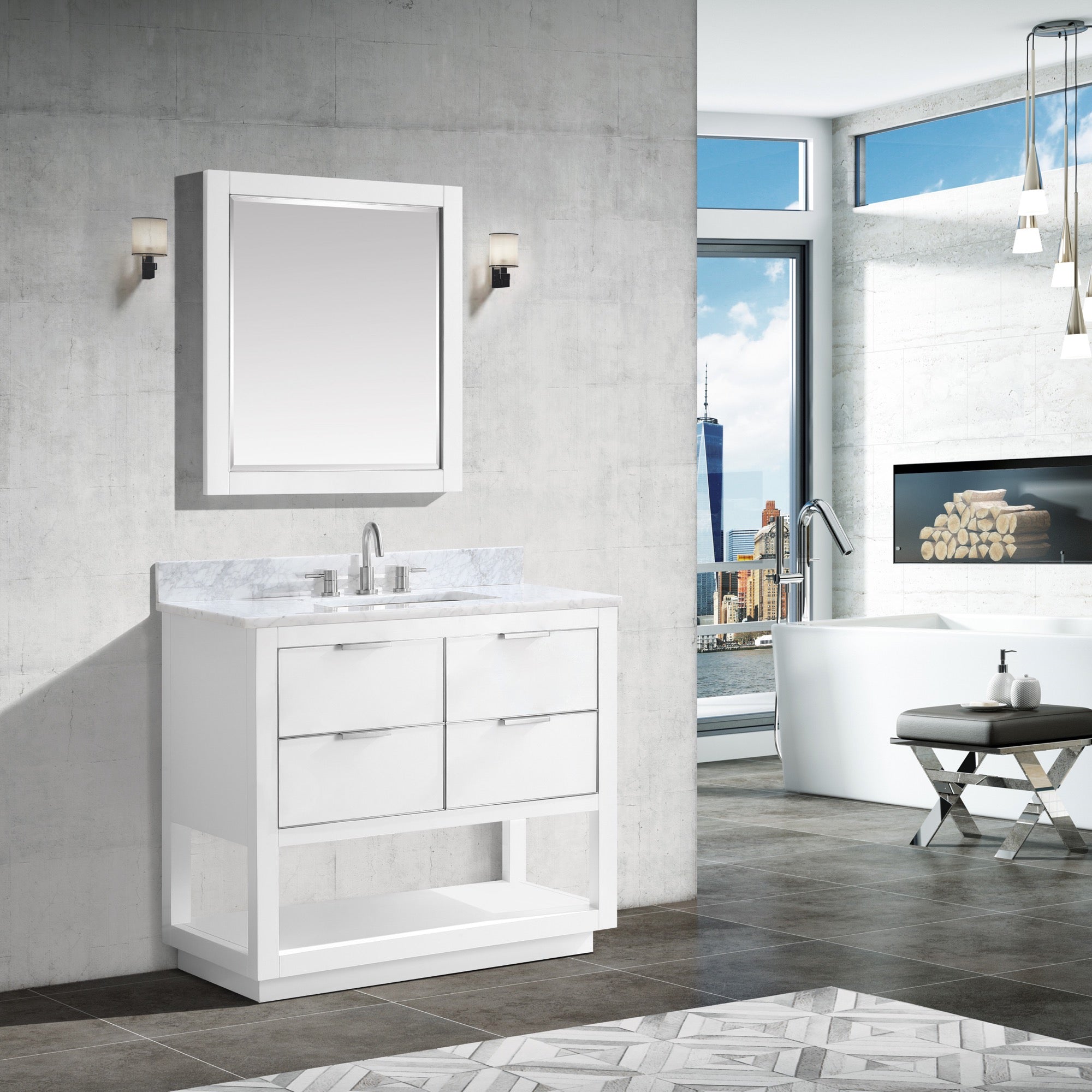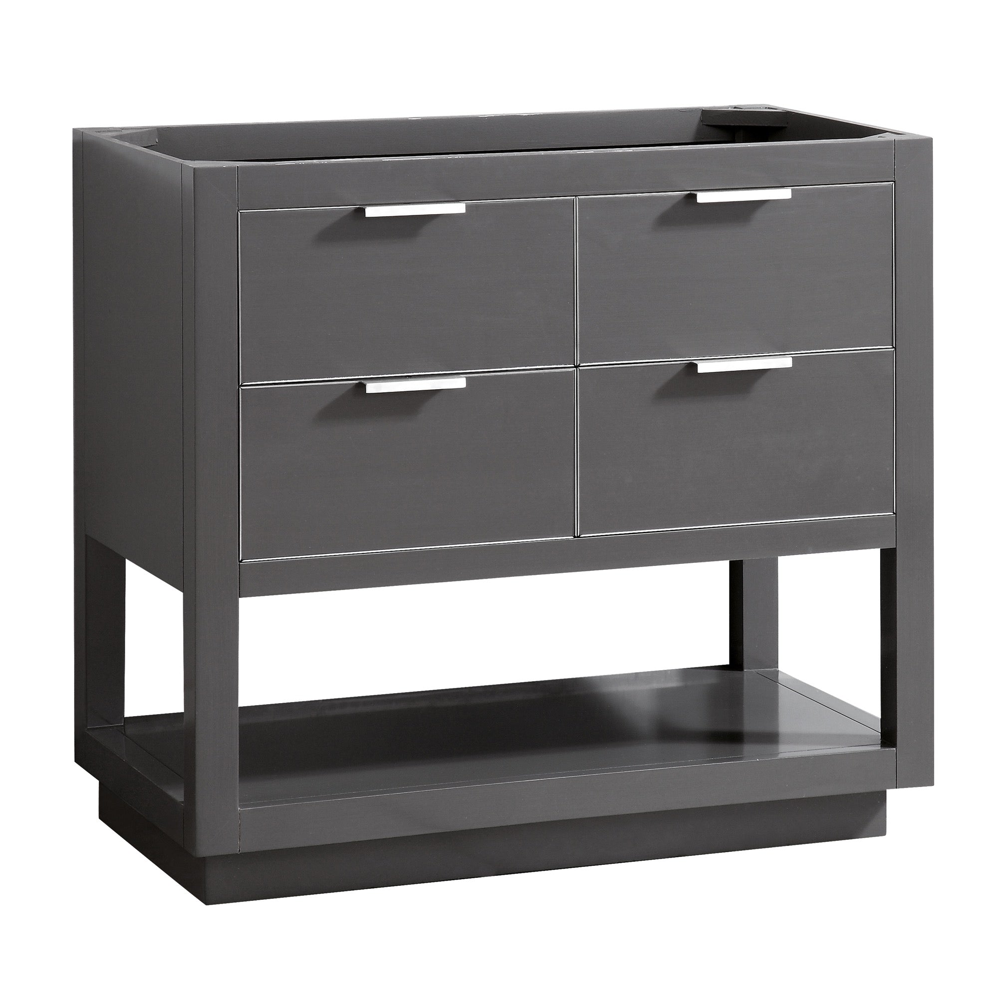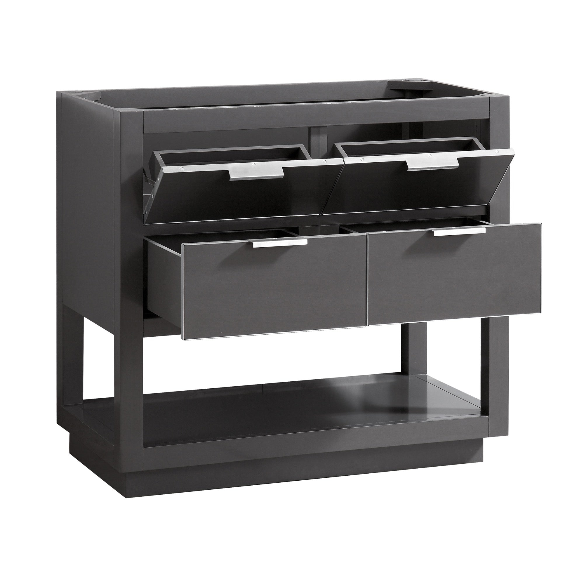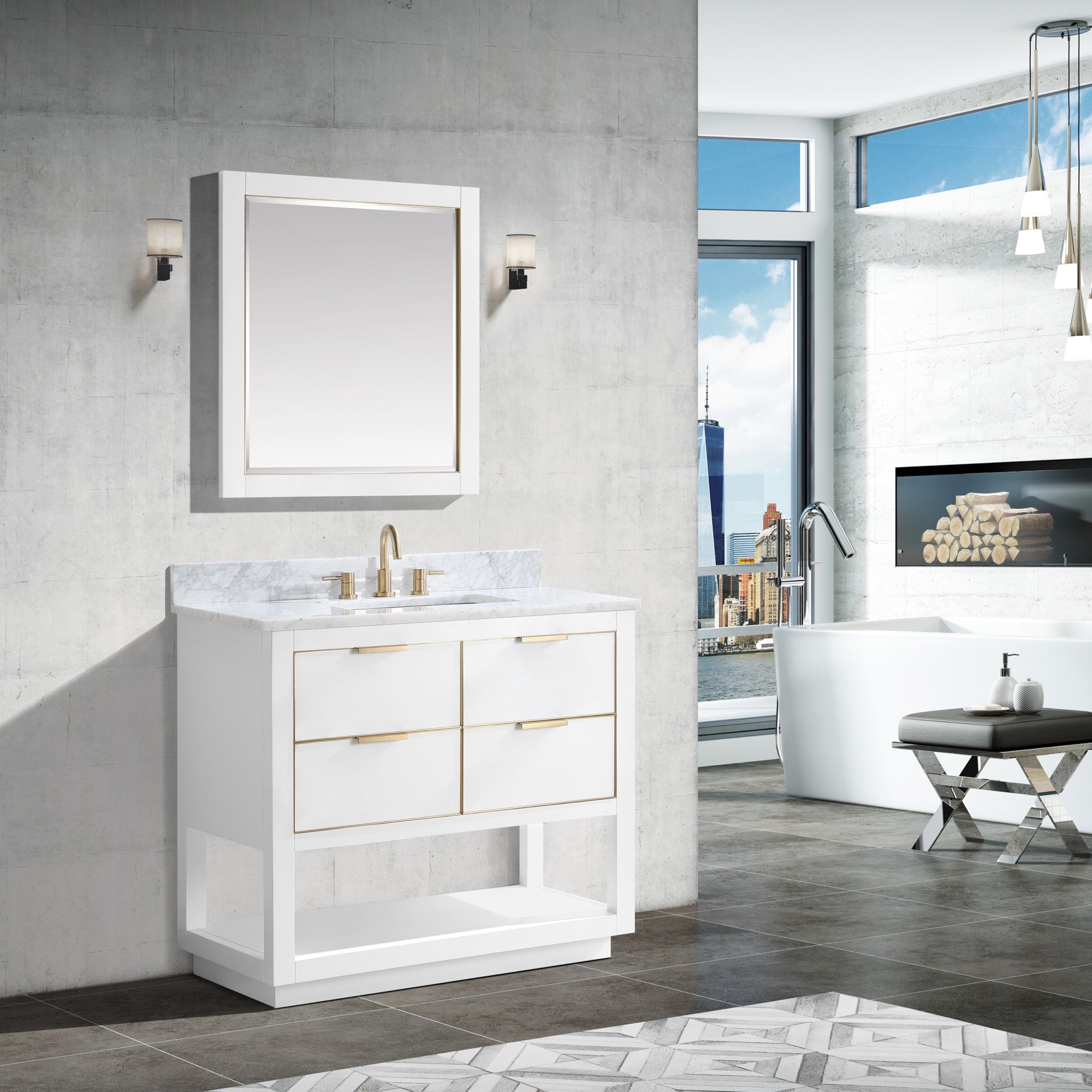 The Allie 36 in. vanity brings to you good looks and generous storage. An uncomplicated design scheme gains luster from the sophisticated Twilight Gray or White finish with matte gold/silver trim and hardware. A solid wood frame, plywood drawer boxes, dovetail joints, a convenient toe kick, and soft-close glides and hinges testify to the quality of construction. A large open shelf provides ample storage. Complete the look with matching mirror, mirror cabinet, and linen tower. Allie is all you need to make your bathroom amazing.
