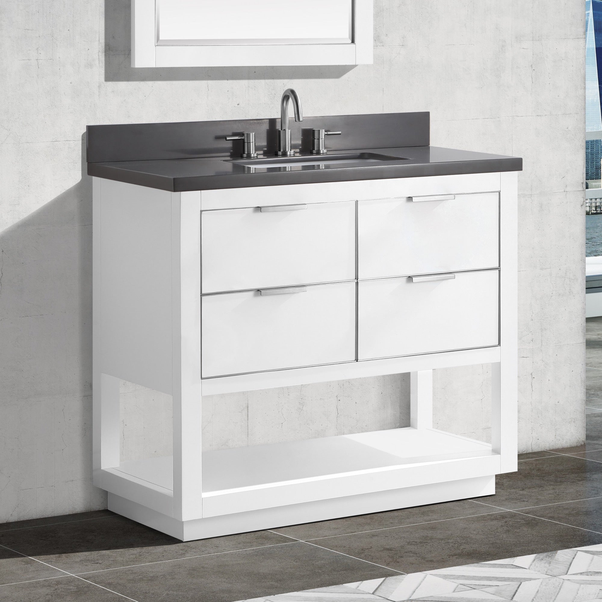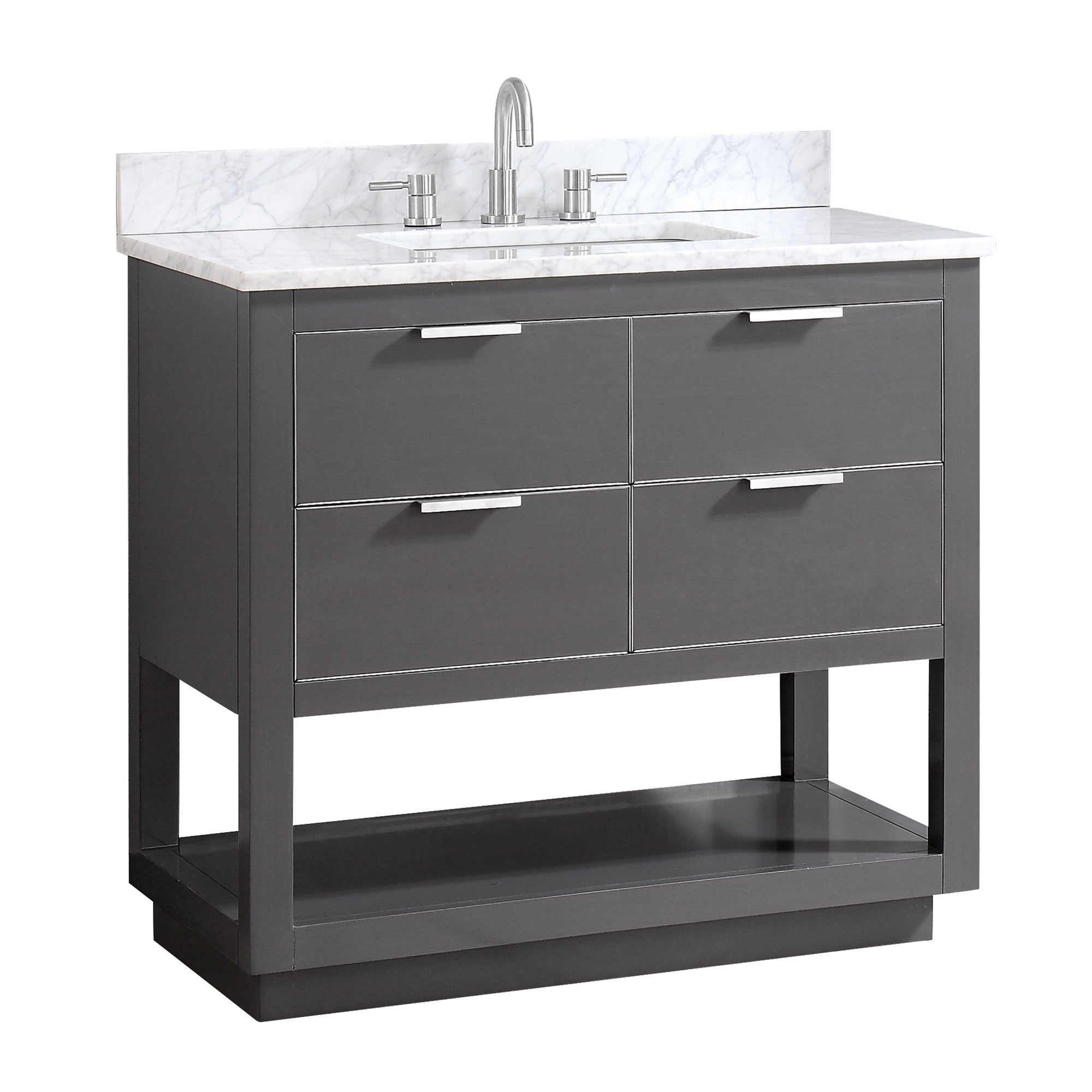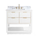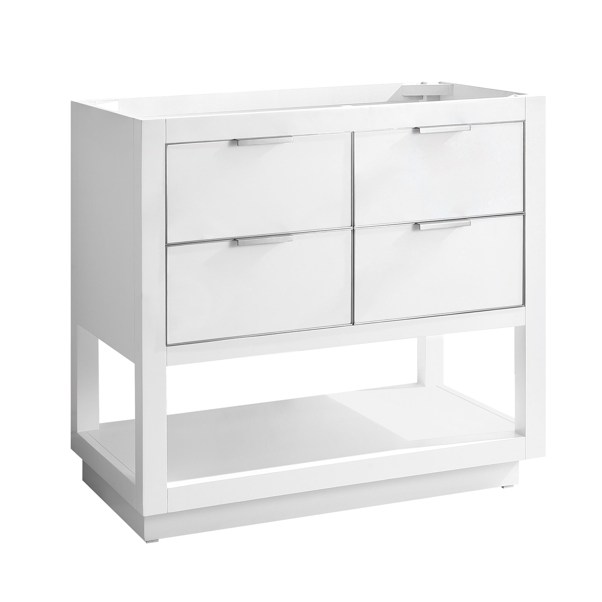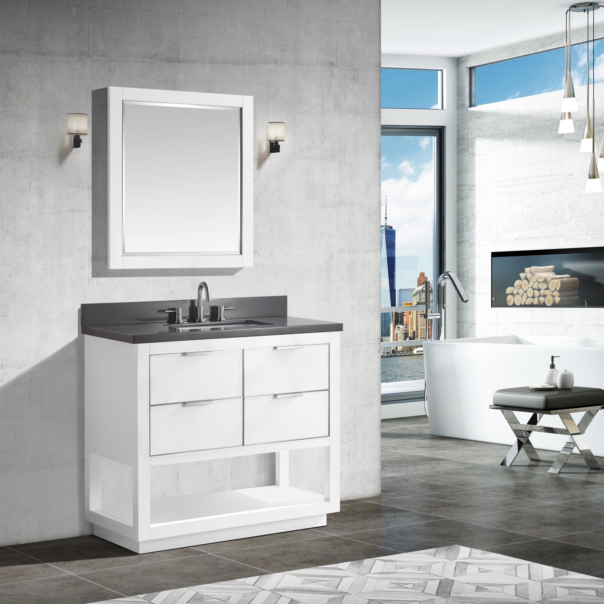 The Allie 36 in. vanity brings to you good looks and generous storage. An uncomplicated design scheme gains luster from the sophisticated Twilight Gray or White finish with matte gold/silver trim and hardware. A solid wood frame, plywood drawer boxes, dovetail joints, a convenient toe kick, and soft-close glides and hinges testify to the quality of construction. A large open shelf provides ample storage. Complete the look with matching mirror, mirror cabinet, and linen tower. Allie is all you need to make your bathroom amazing.