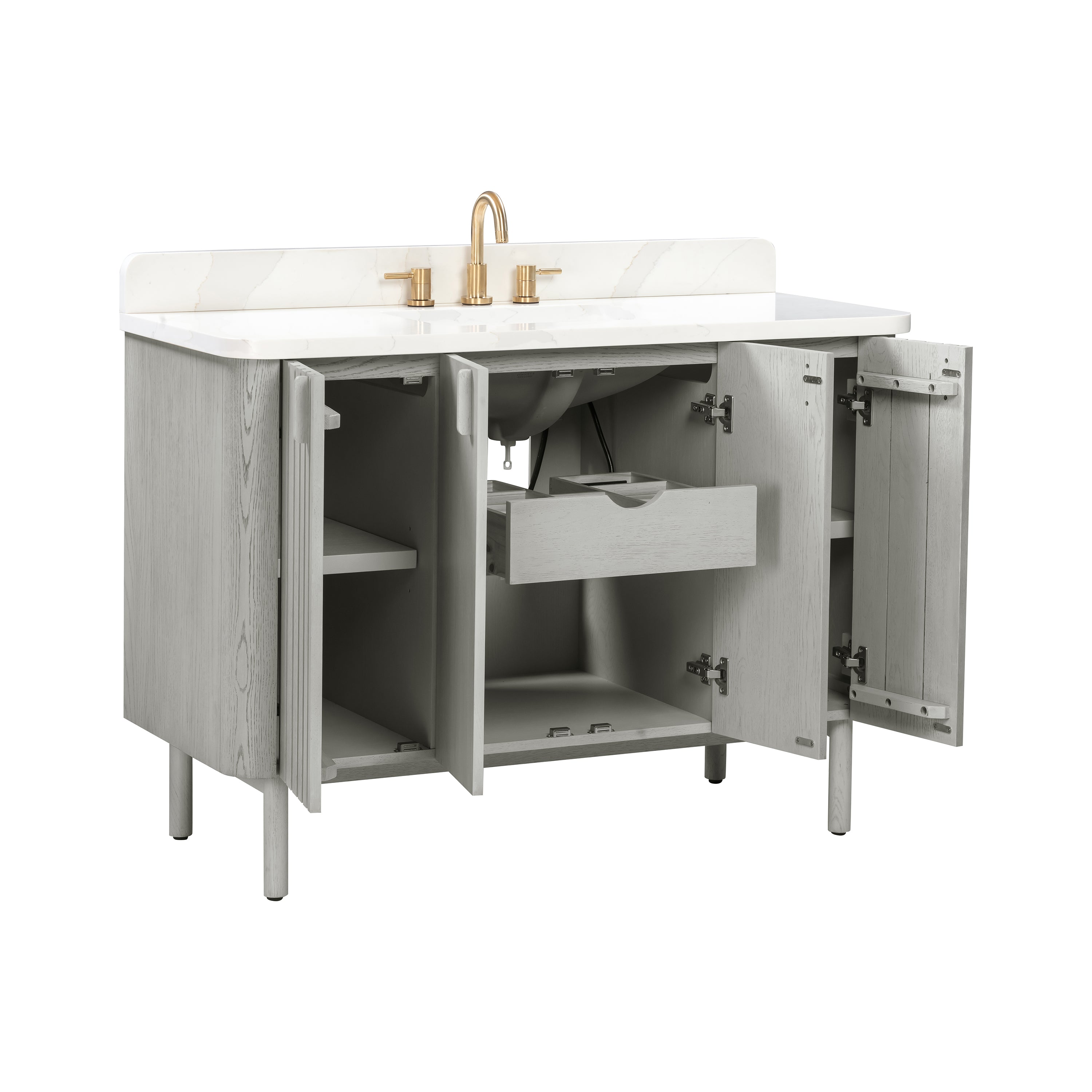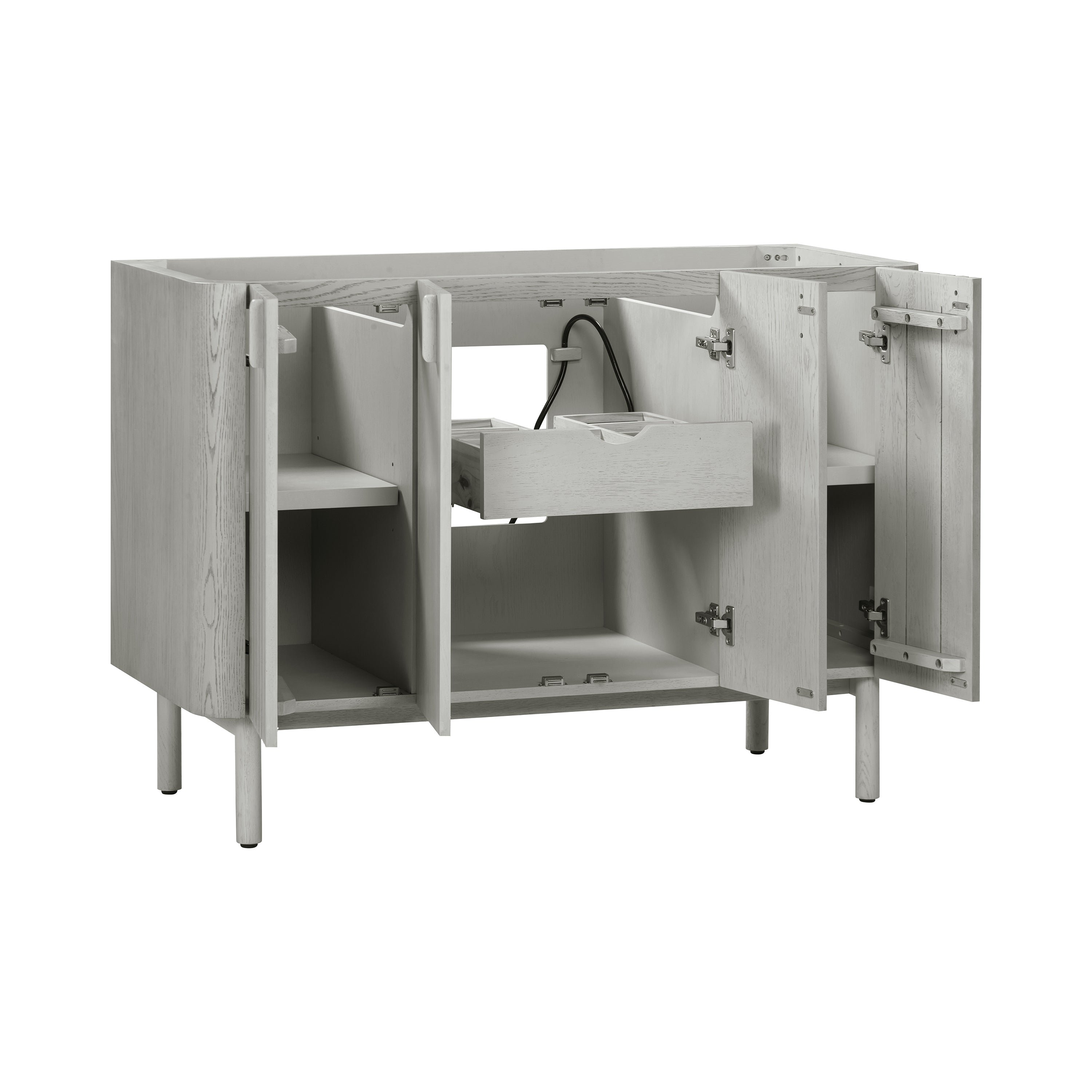 - Ample storage with 1 pull-out drawer with dividers, 4 soft-close doors, and 2 adjustable interior shelves