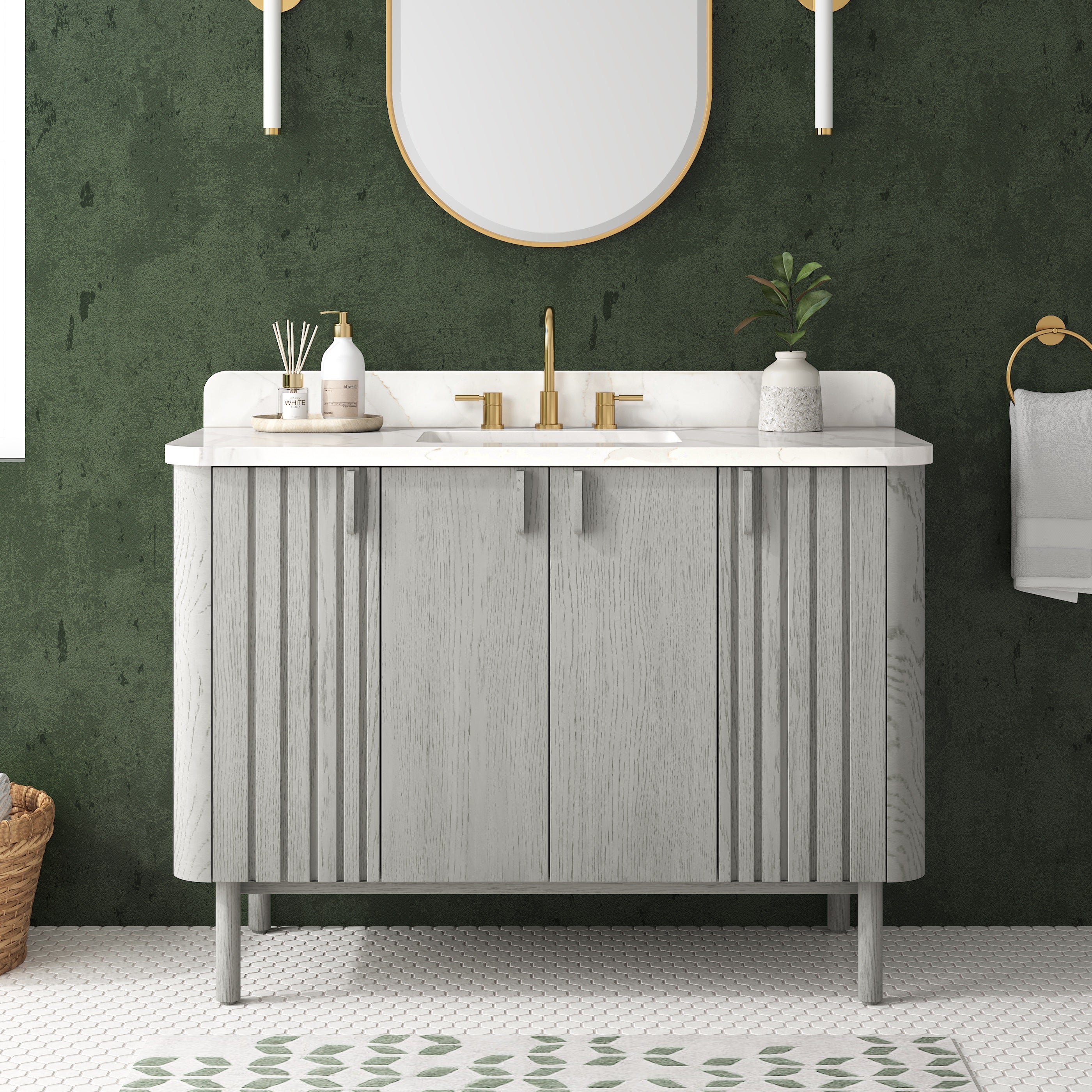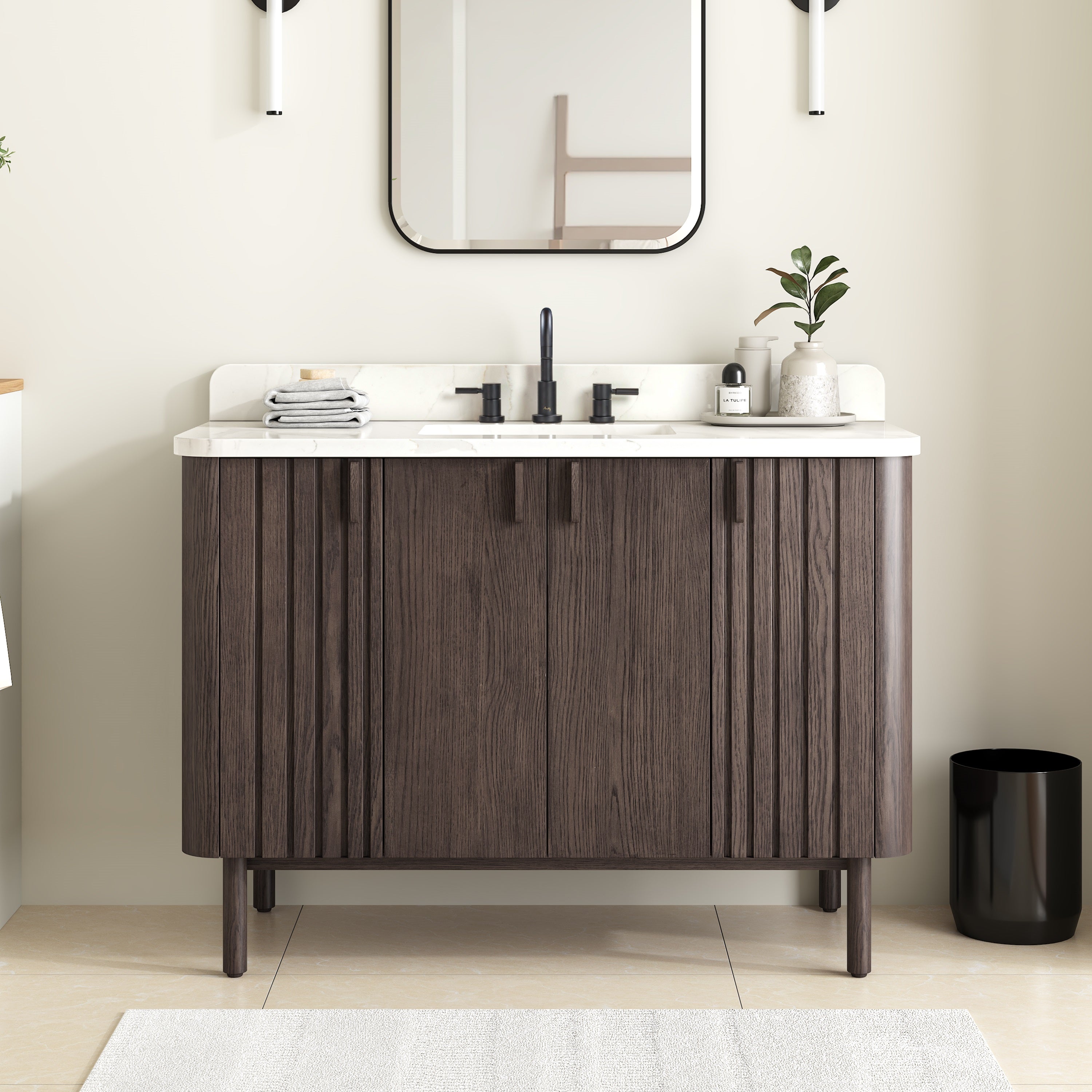 Make your bathroom beautiful with the Blakely 48-inch vanity by Avanity. The cabinet features a gorgeous oak finish with both flat panel and beaded doors to striking effect. The solid wood frame provides durability, and the oak hardware blends with the wood grain, creating a minimalist look. The spacious cabinet, interior drawer and two interior shelves provide ample storage for your toiletries and accessories, while the soft-close hinges and glides ensure smooth and quiet operation. An integrated power strip contains dual electrical and USB. Whether you want to create a rustic or contemporary look, Blakely will be the bedrock in any bathroom style you choose.