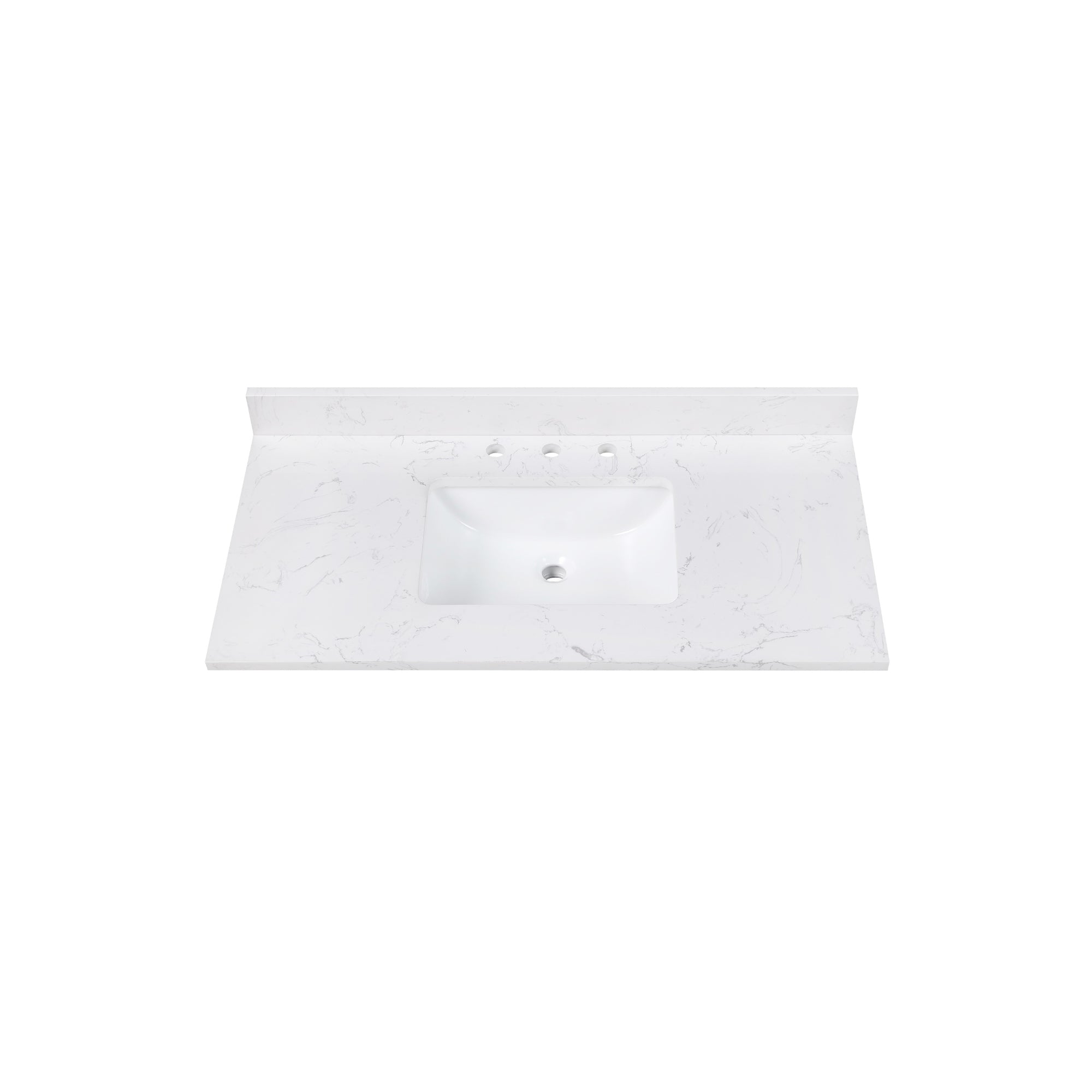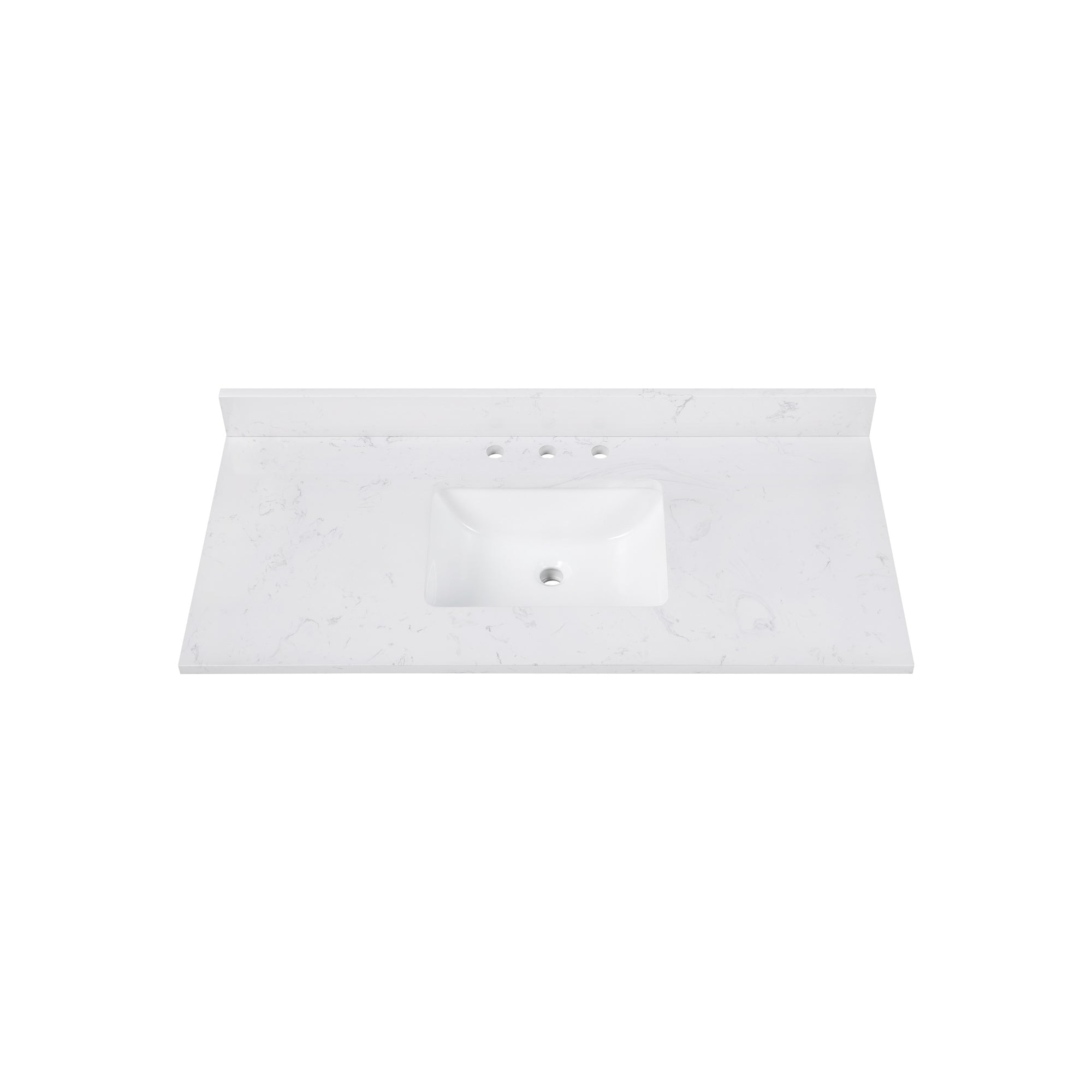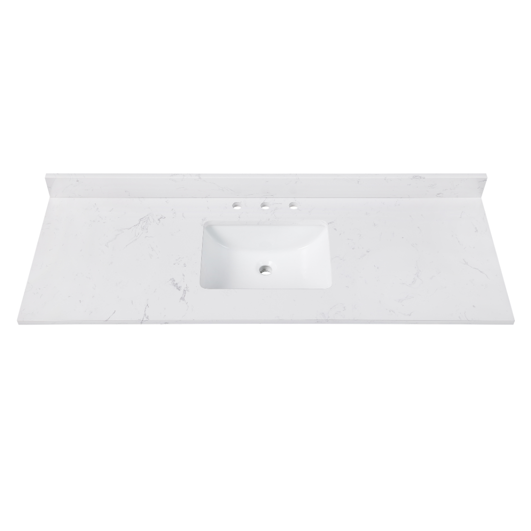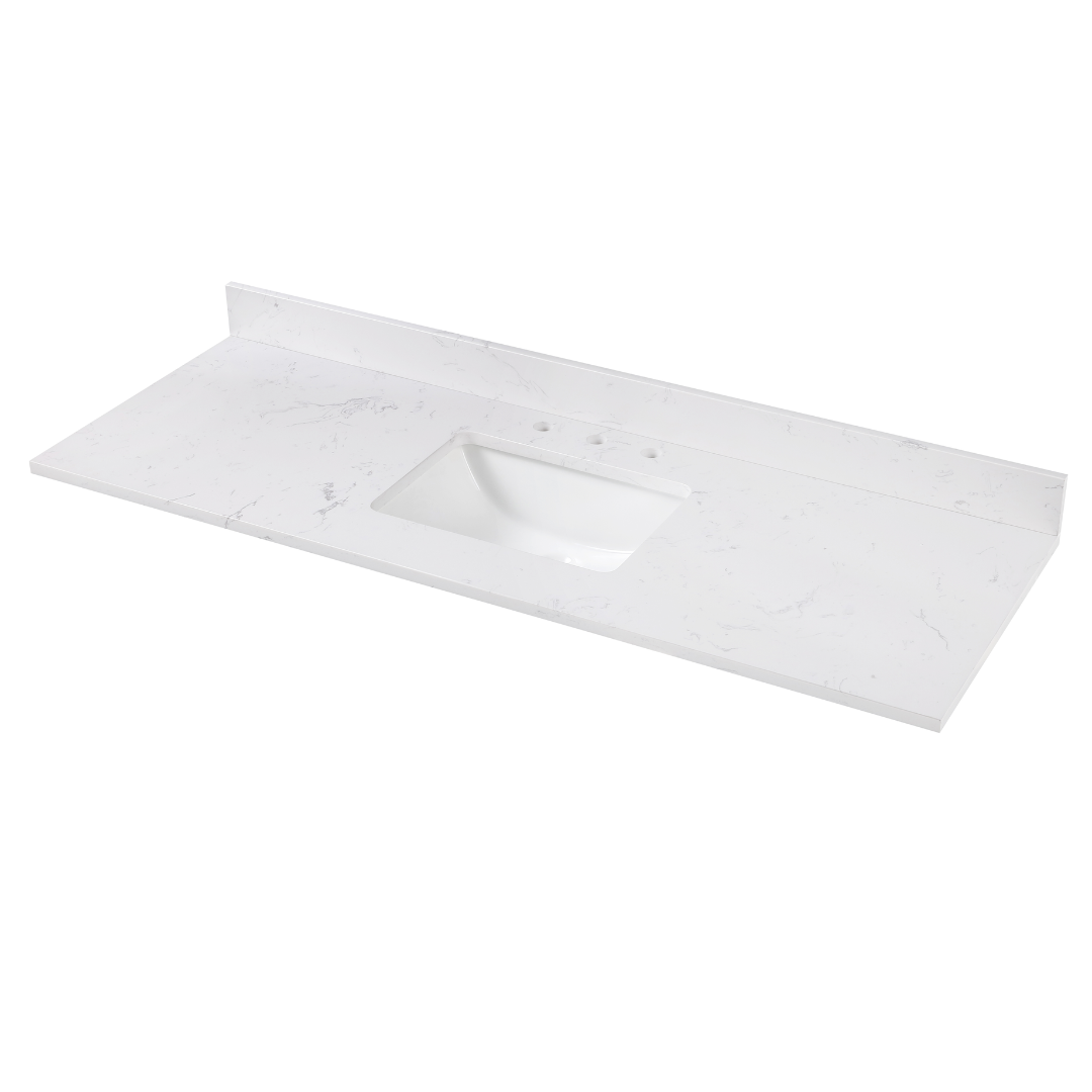 Cala white engineered stone bathroom vanity top will provide you a stunning and clean bathroom with a modern straight edge profile. Easy installation and low maintenance, it also comes with gray veining that mimics Carrara White marble. The vanity top includes a 4-in high back splash and a single rectangular sink. Side splash is sold separately and it can be installed on either left side or right side.