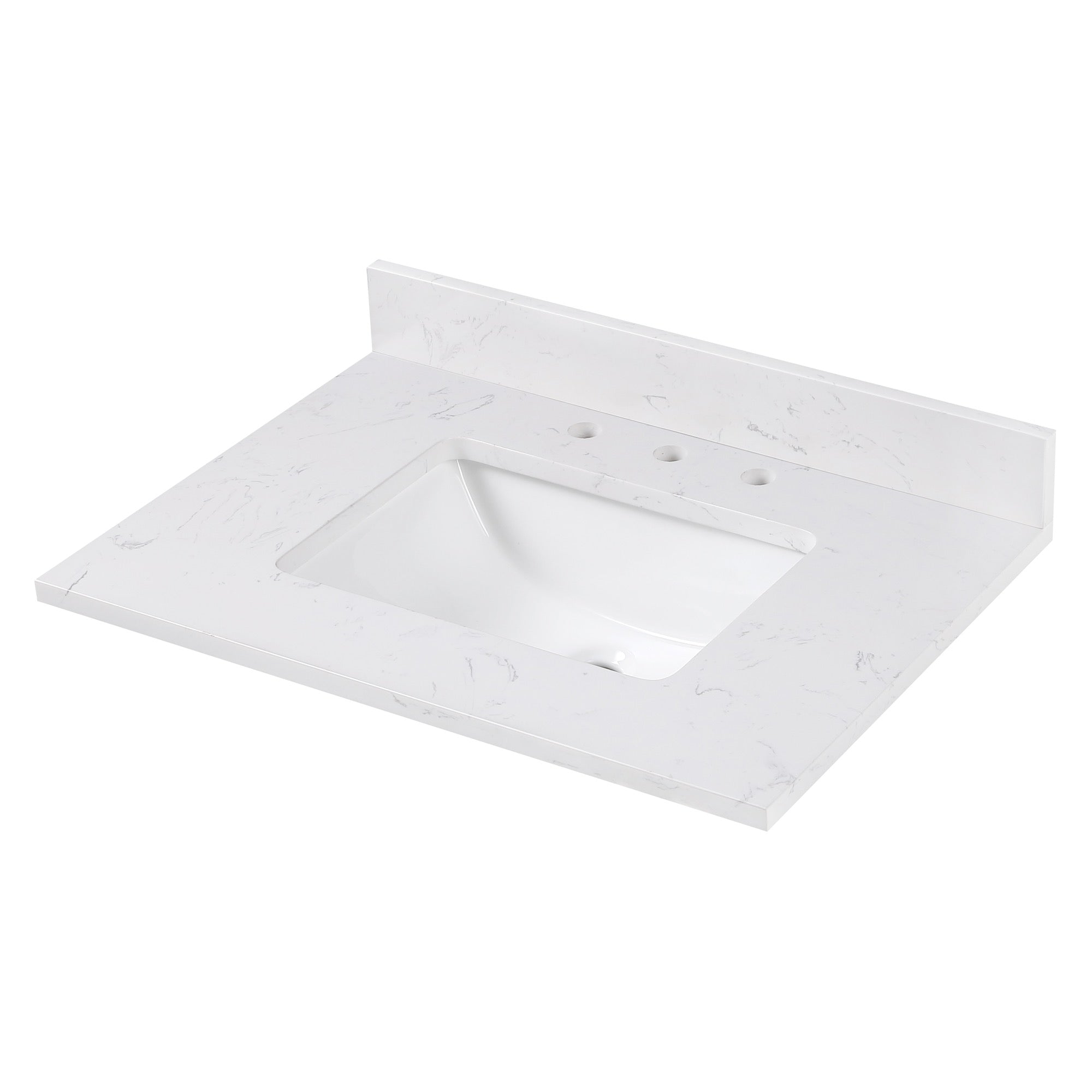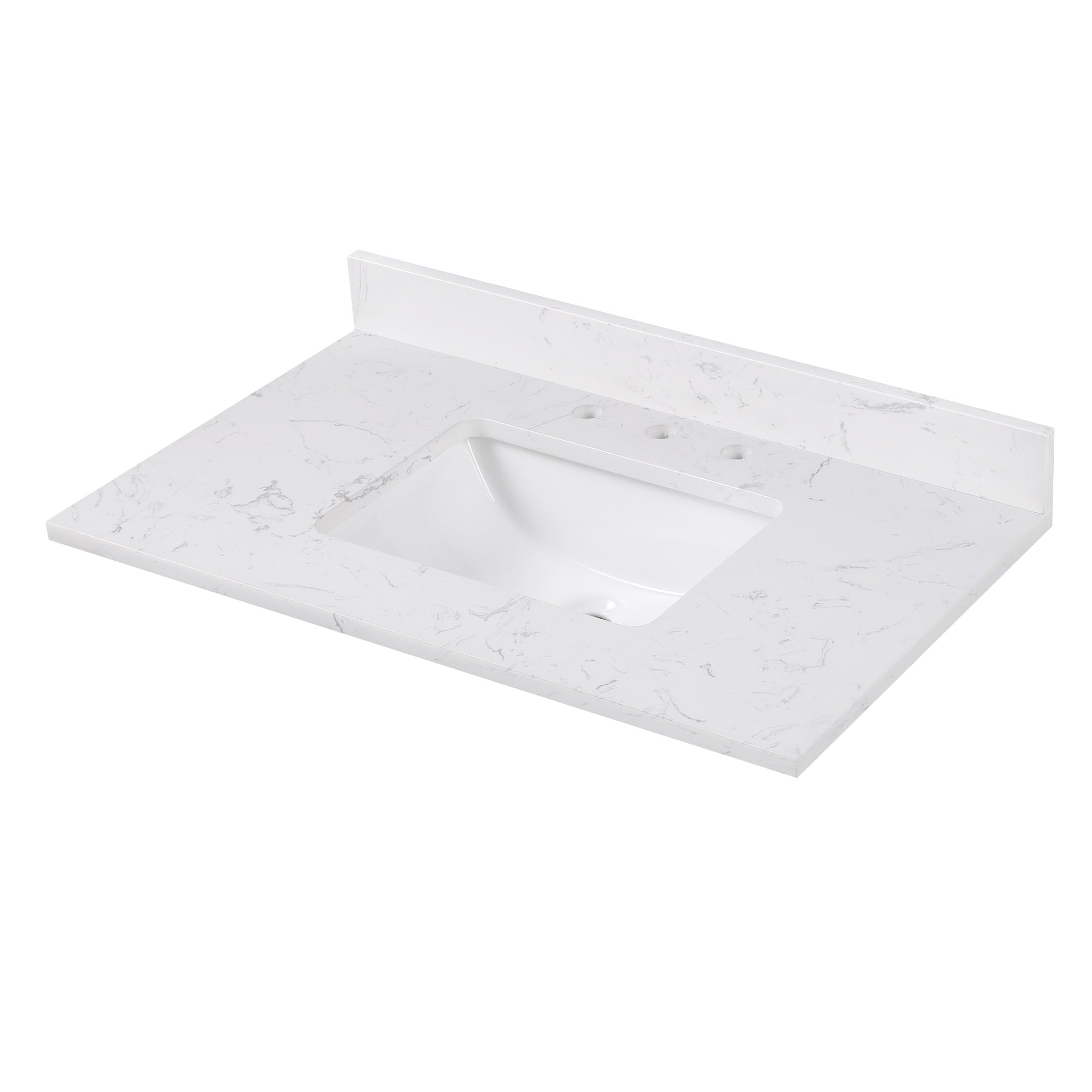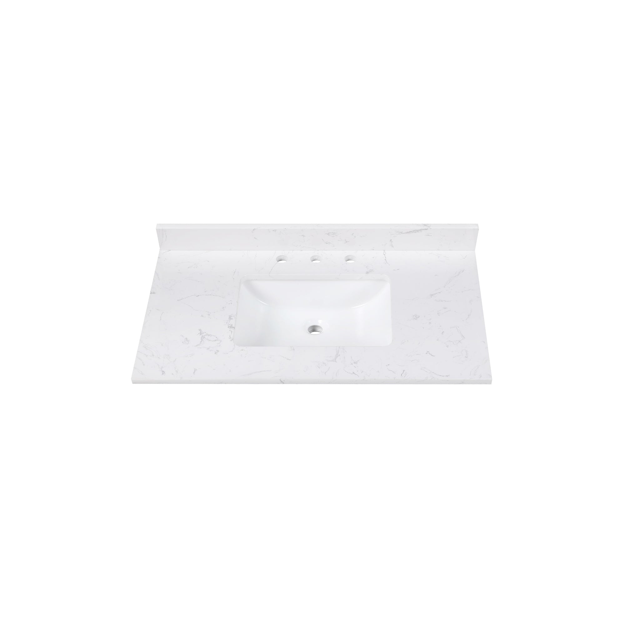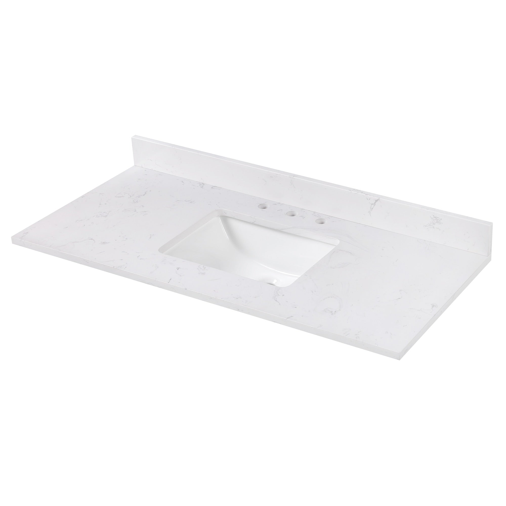 Cala white engineered stone bathroom vanity top will provide you a stunning and clean bathroom with a modern straight edge profile. Easy installation and low maintenance, it also comes with gray veining that mimics Carrara White marble. The vanity top includes a 4-in high back splash and a single rectangular sink. Side splash is sold separately and it can be installed on either left side or right side.