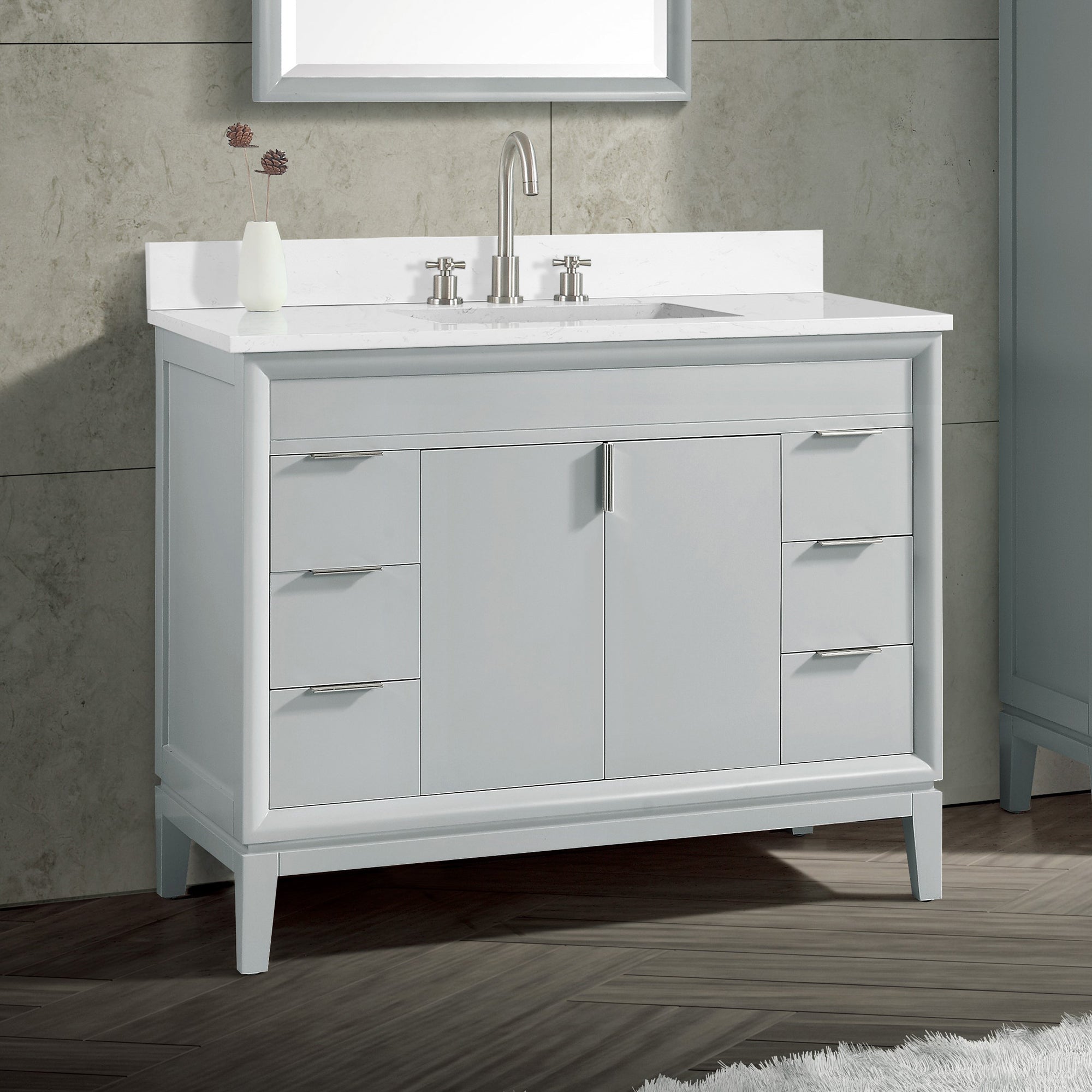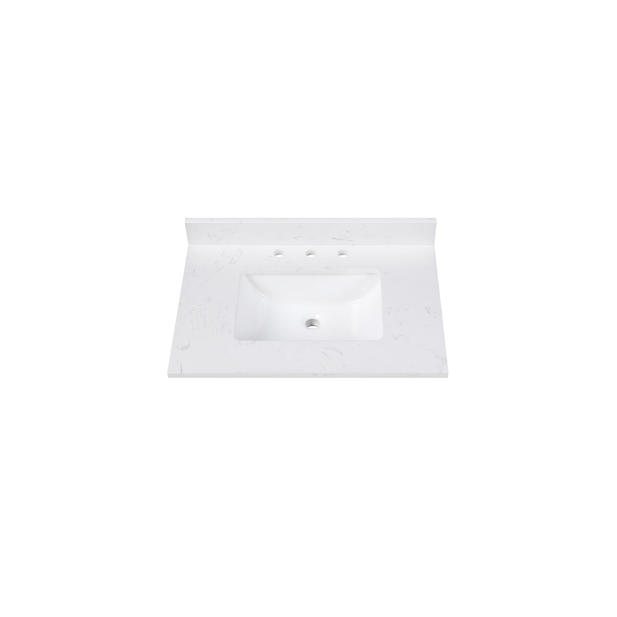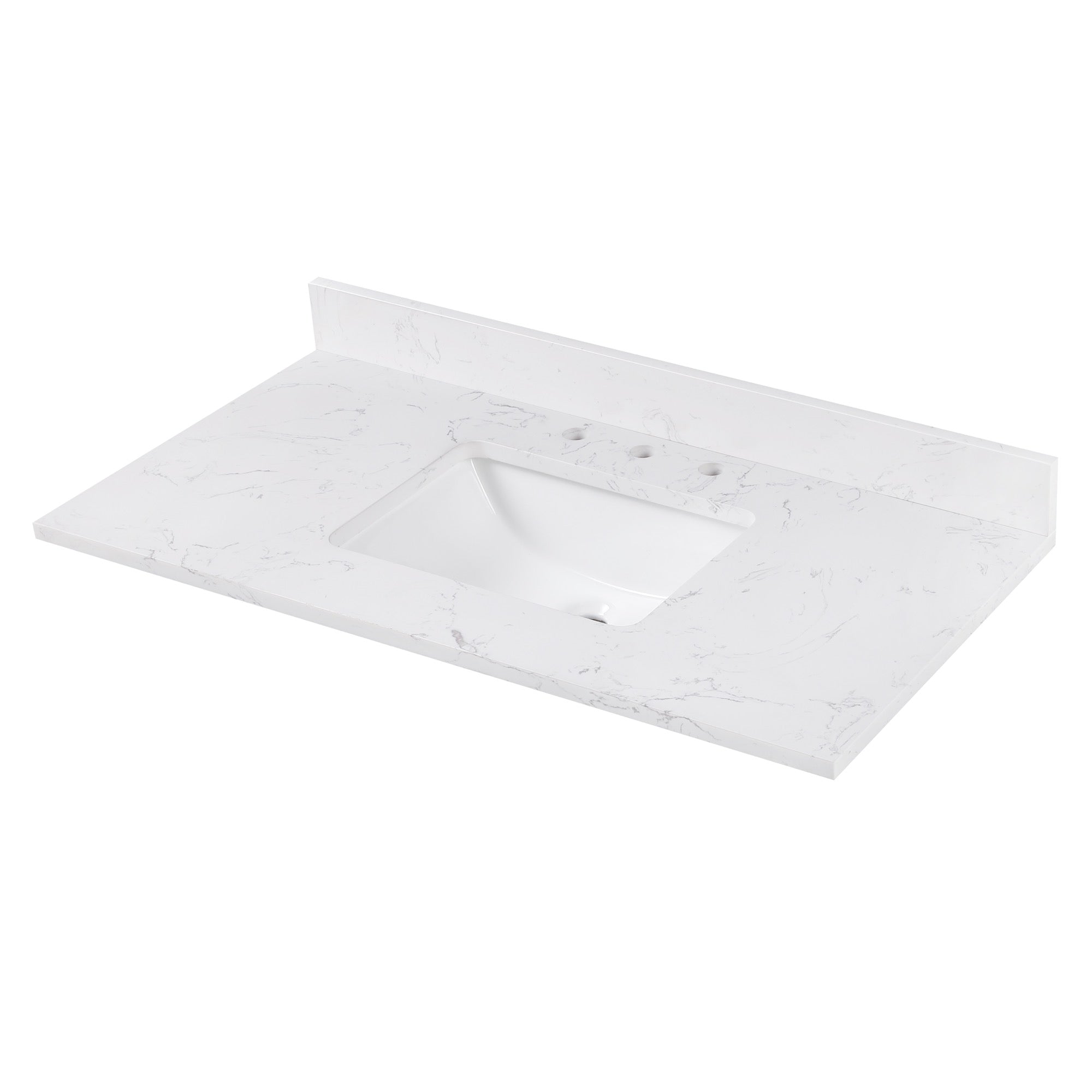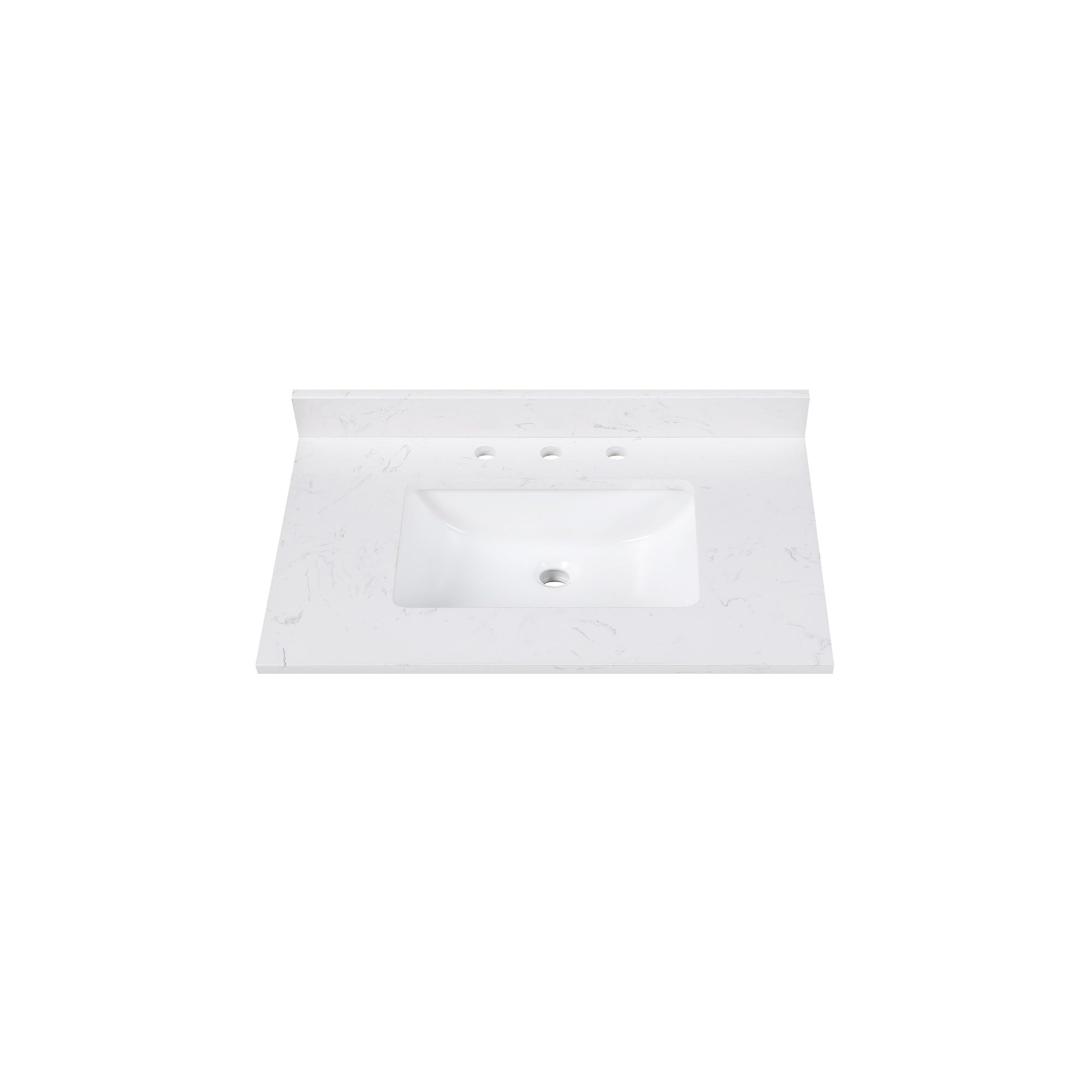 Cala white engineered stone bathroom vanity top will provide you a stunning and clean bathroom with a modern straight edge profile. Easy installation and low maintenance, it also comes with gray veining that mimics Carrara White marble. The vanity top includes a 4-in high back splash and a single rectangular sink. Side splash is sold separately and it can be installed on either left side or right side.