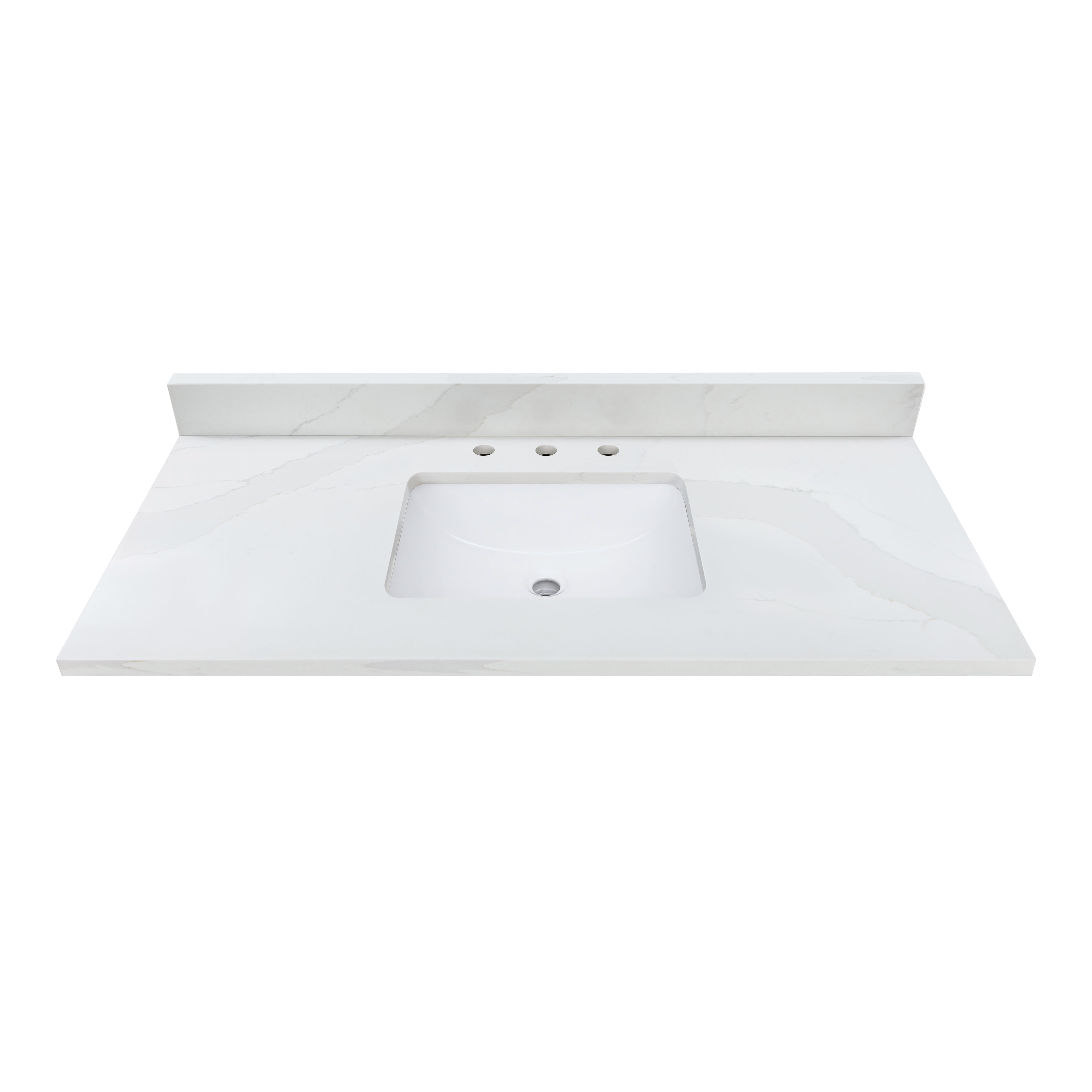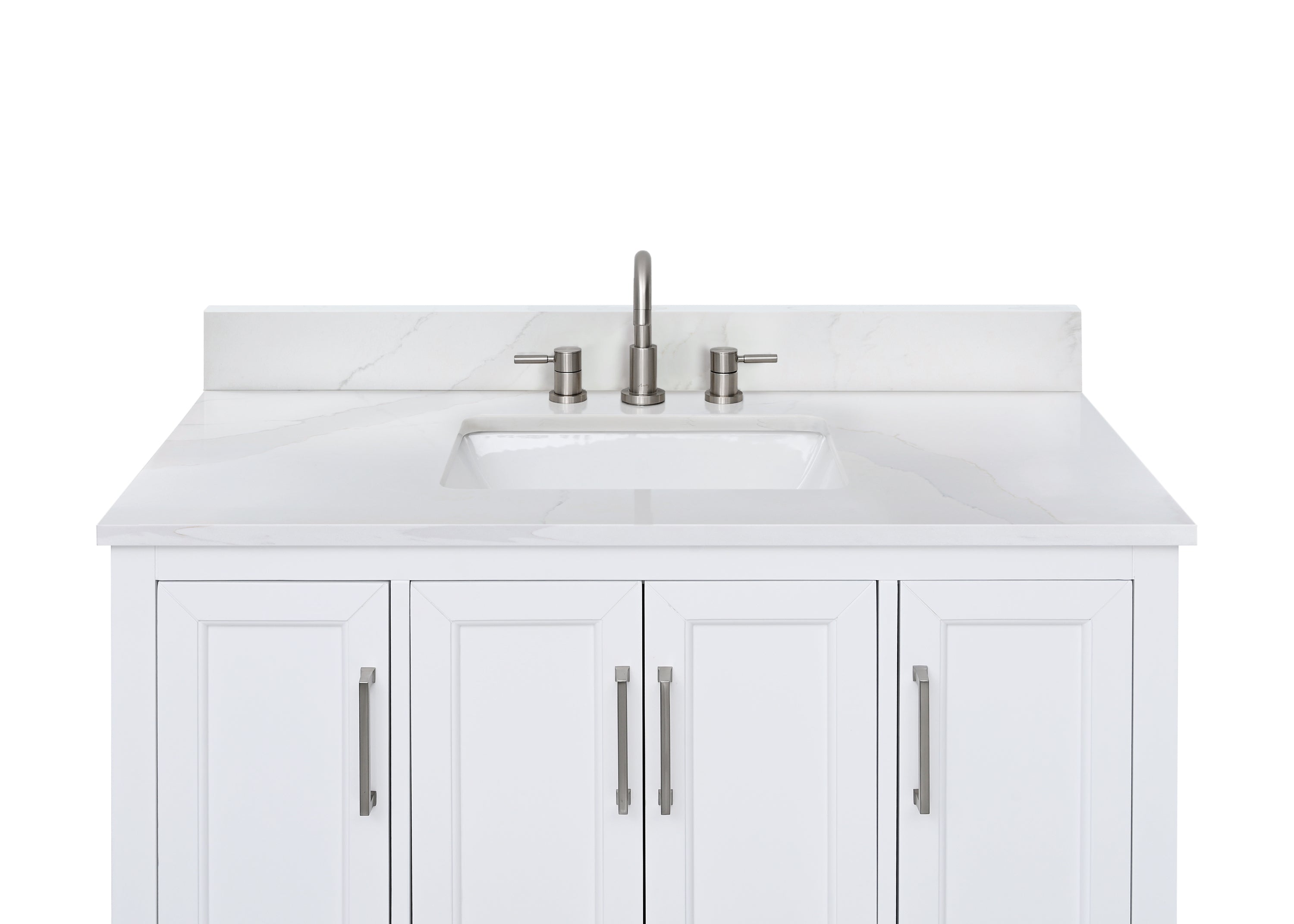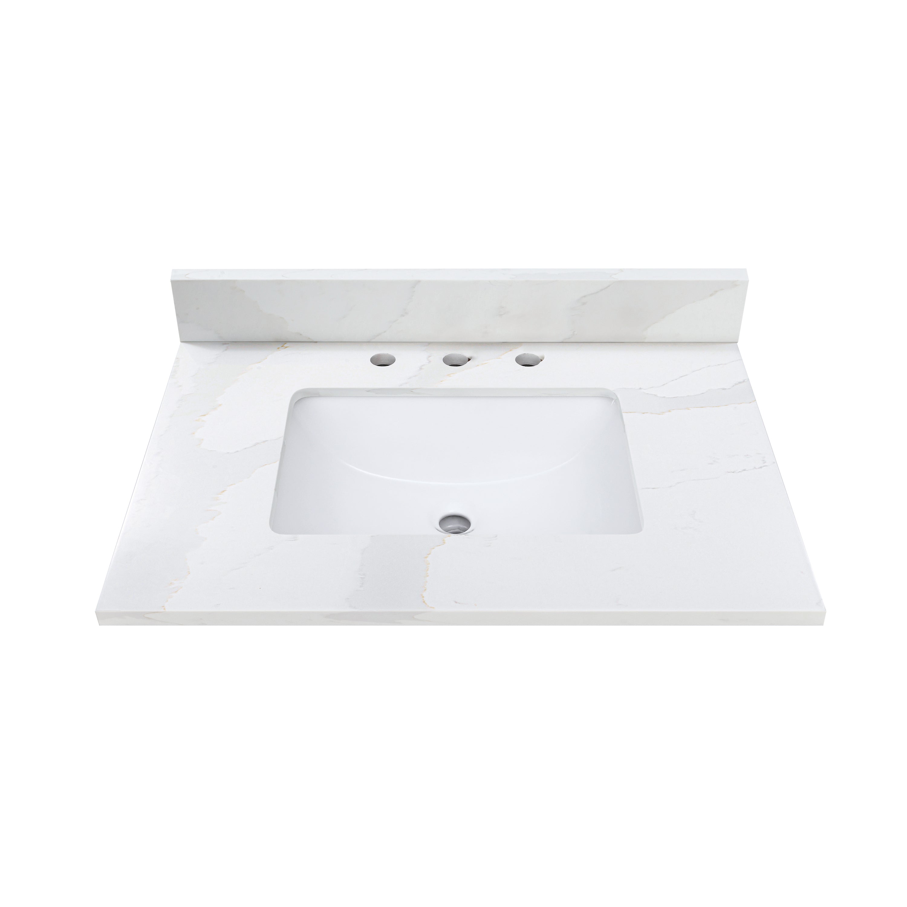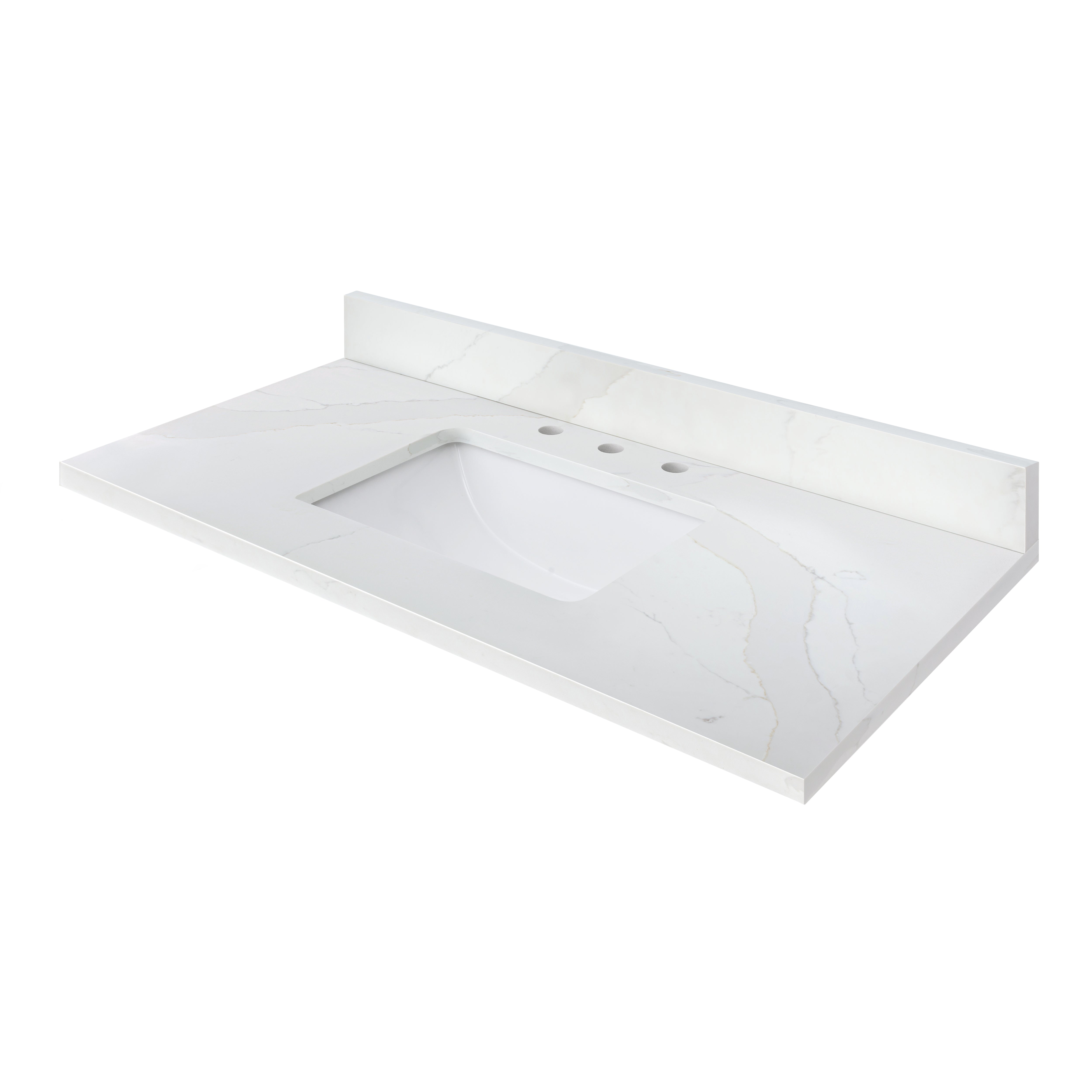 Complete your bathroom vanity with this elegant and durable Calacatta Quartz Top from Avanity. Featuring a pre-installed rectangular sink for a streamlined look and pre-drilled holes for easy faucet installation, nothing could be easier than topping off your vanity with this stunning piece of quartz stone. The top comes with a matching backsplash to help protect walls from any water damage. With a variety of sizes available, Avanity’s Calacatta Quartz top can be used in a variety of bathroom sizes and styles.
