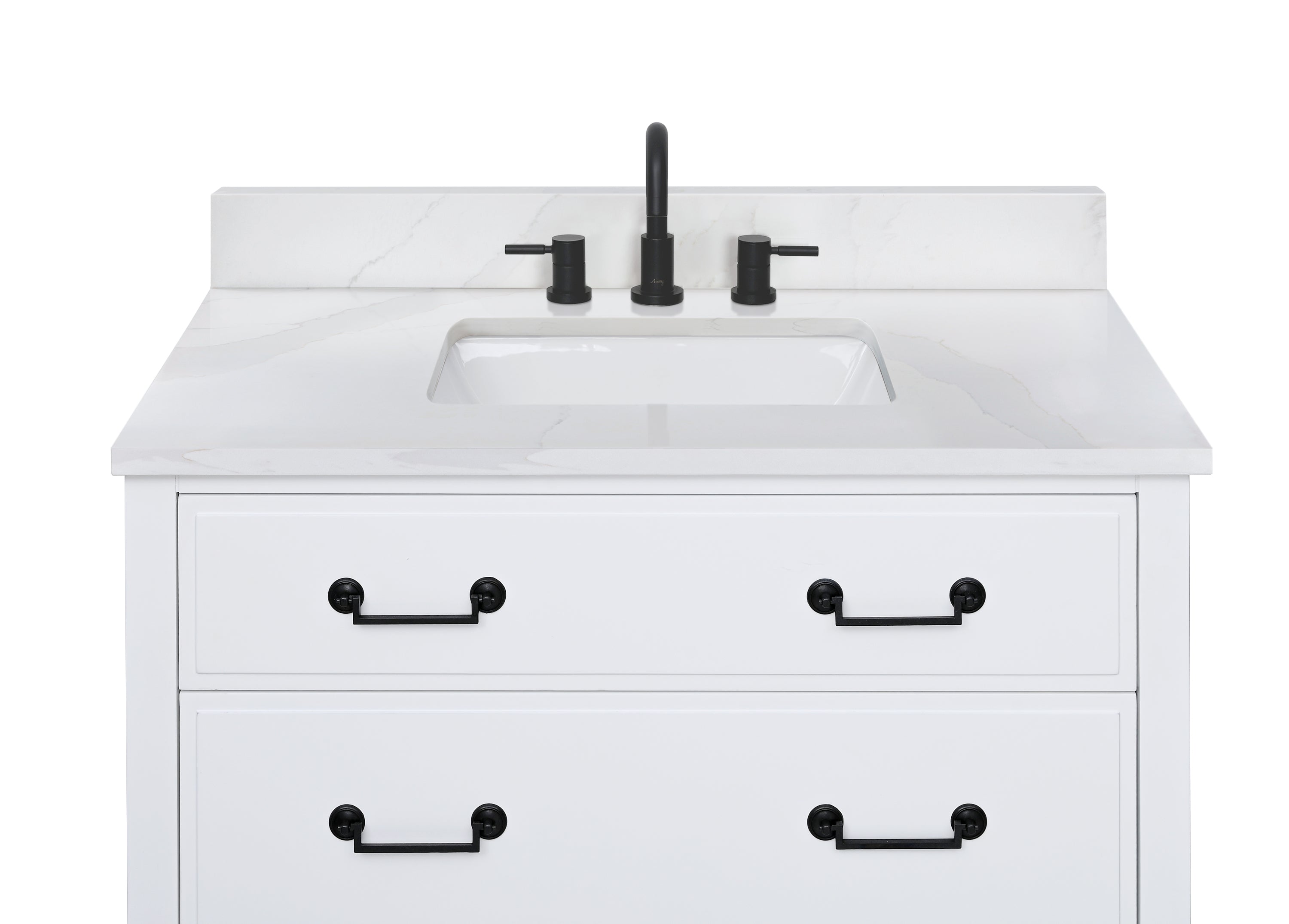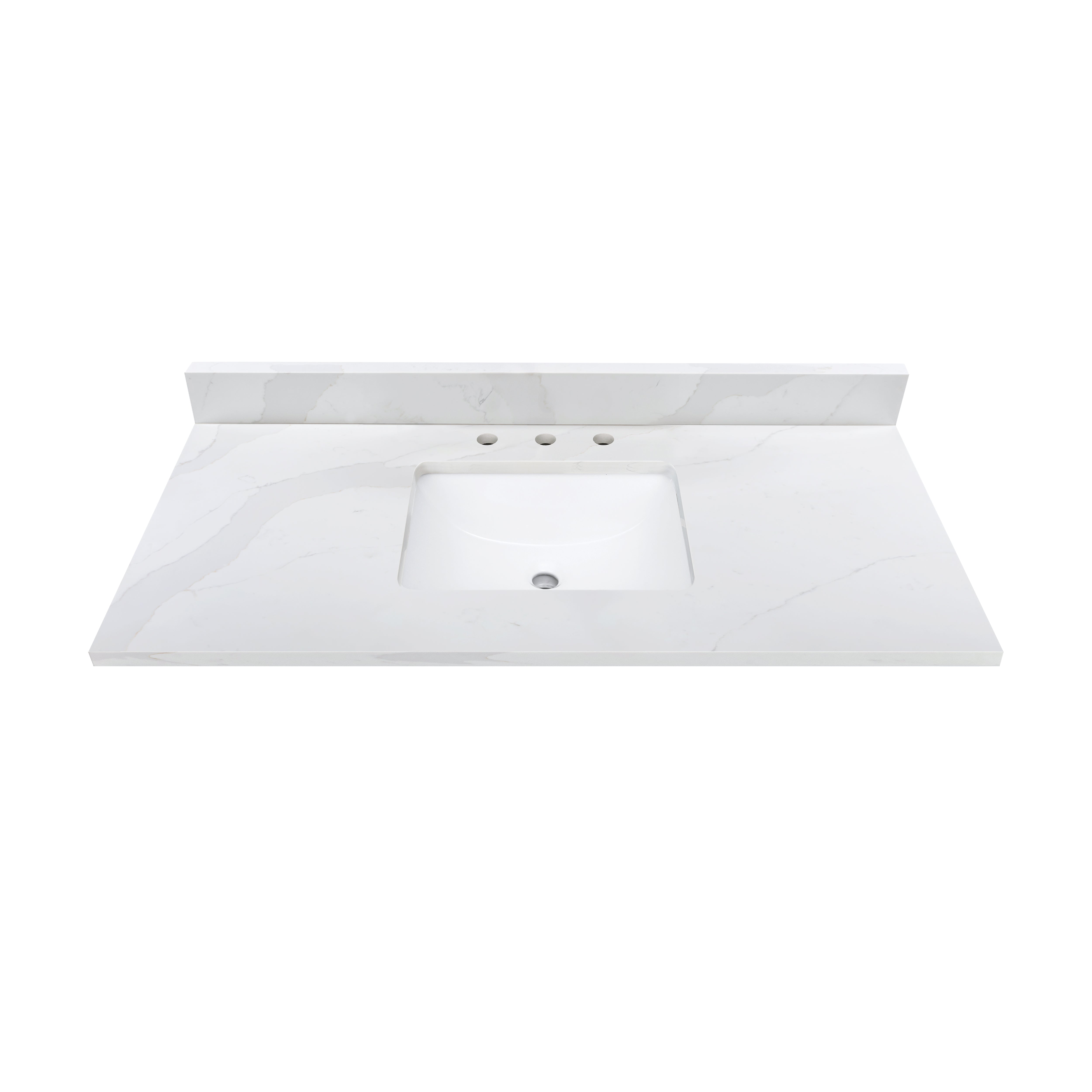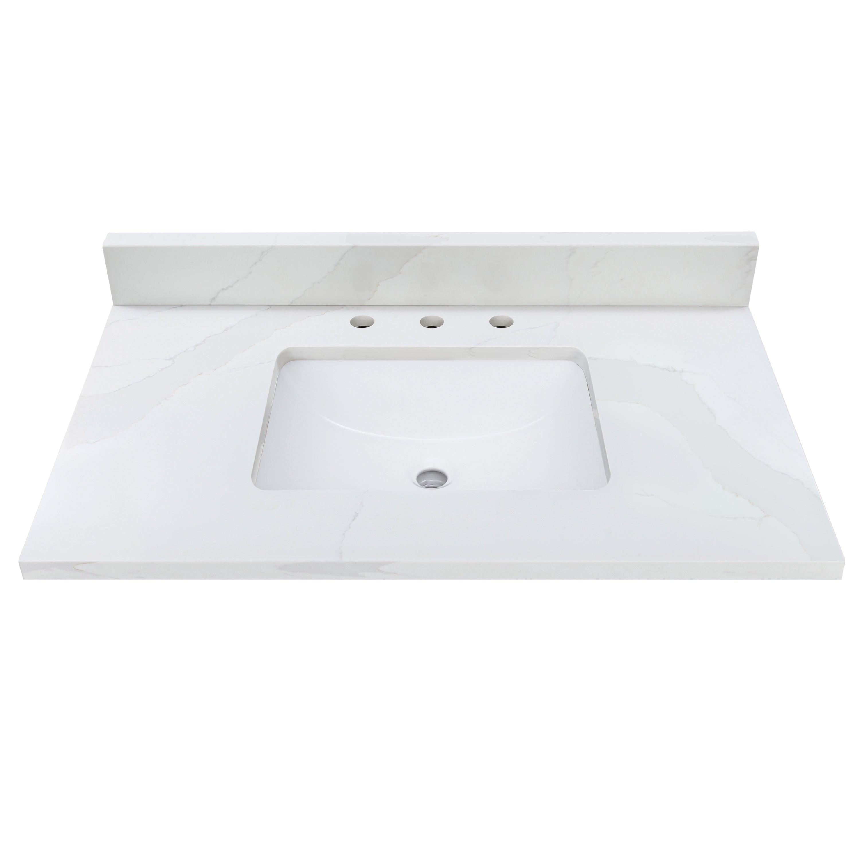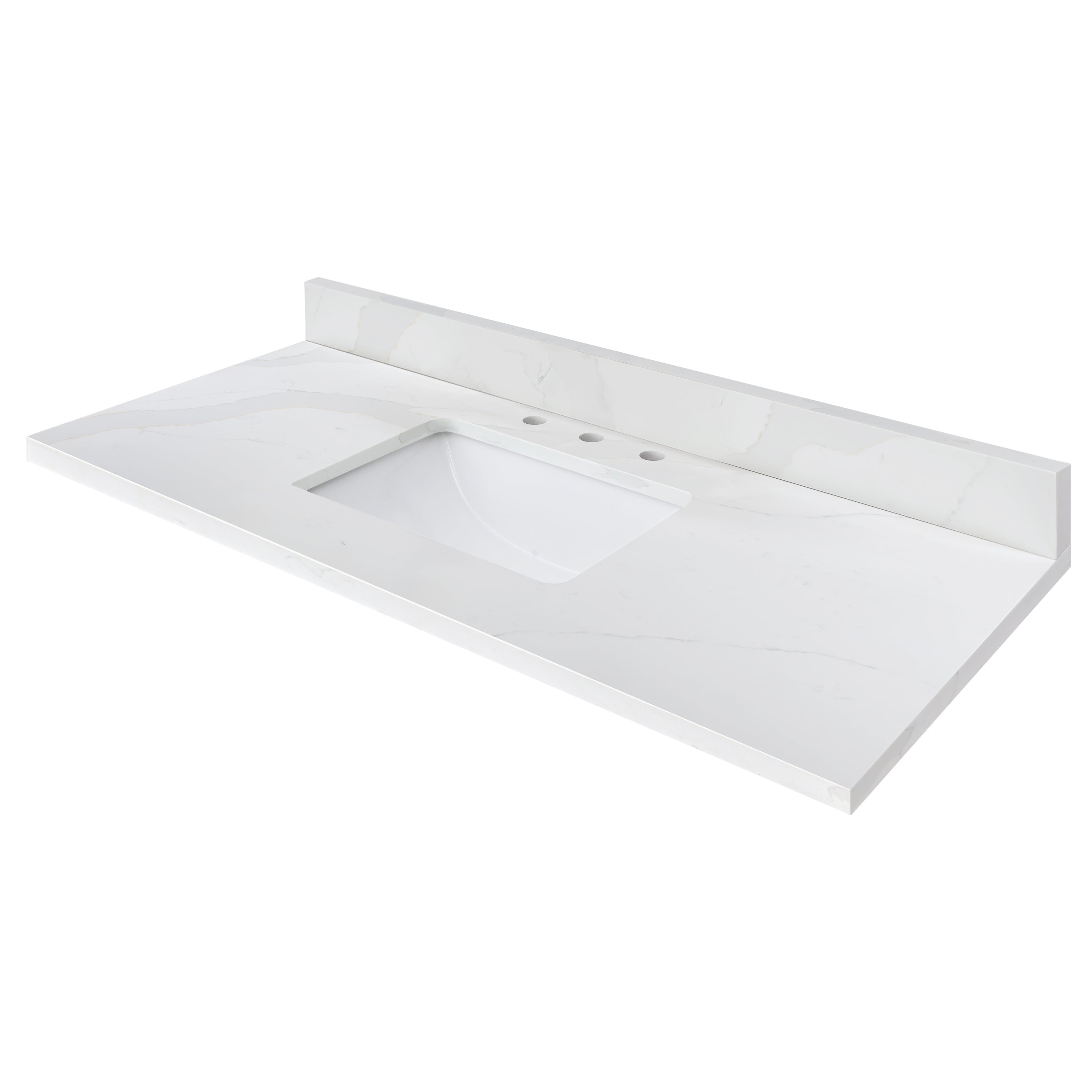 Complete your bathroom vanity with this elegant and durable Calacatta Quartz Top from Avanity. Featuring a pre-installed rectangular sink for a streamlined look and pre-drilled holes for easy faucet installation, nothing could be easier than topping off your vanity with this stunning piece of quartz stone. The top comes with a matching backsplash to help protect walls from any water damage. With a variety of sizes available, Avanity’s Calacatta Quartz top can be used in a variety of bathroom sizes and styles.
