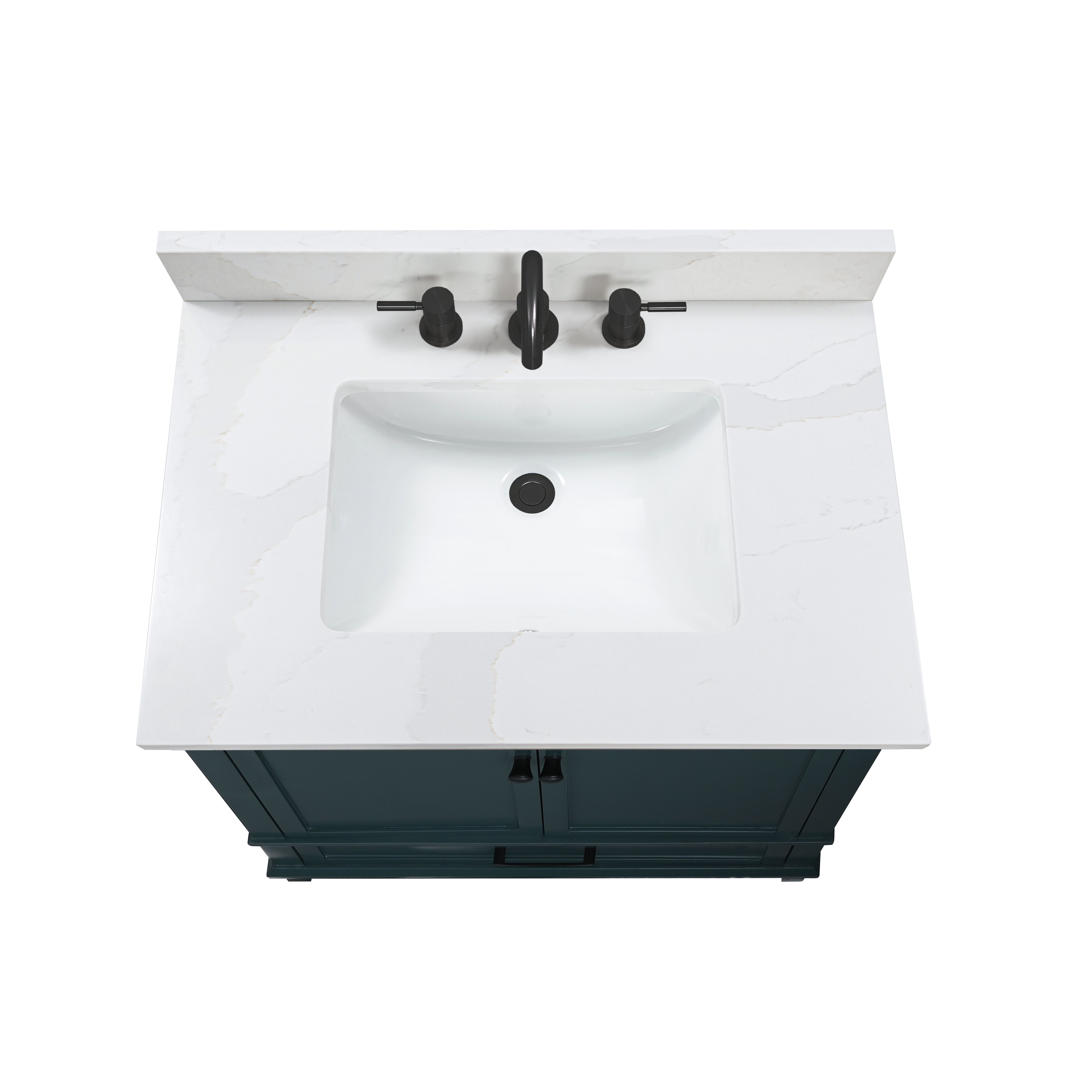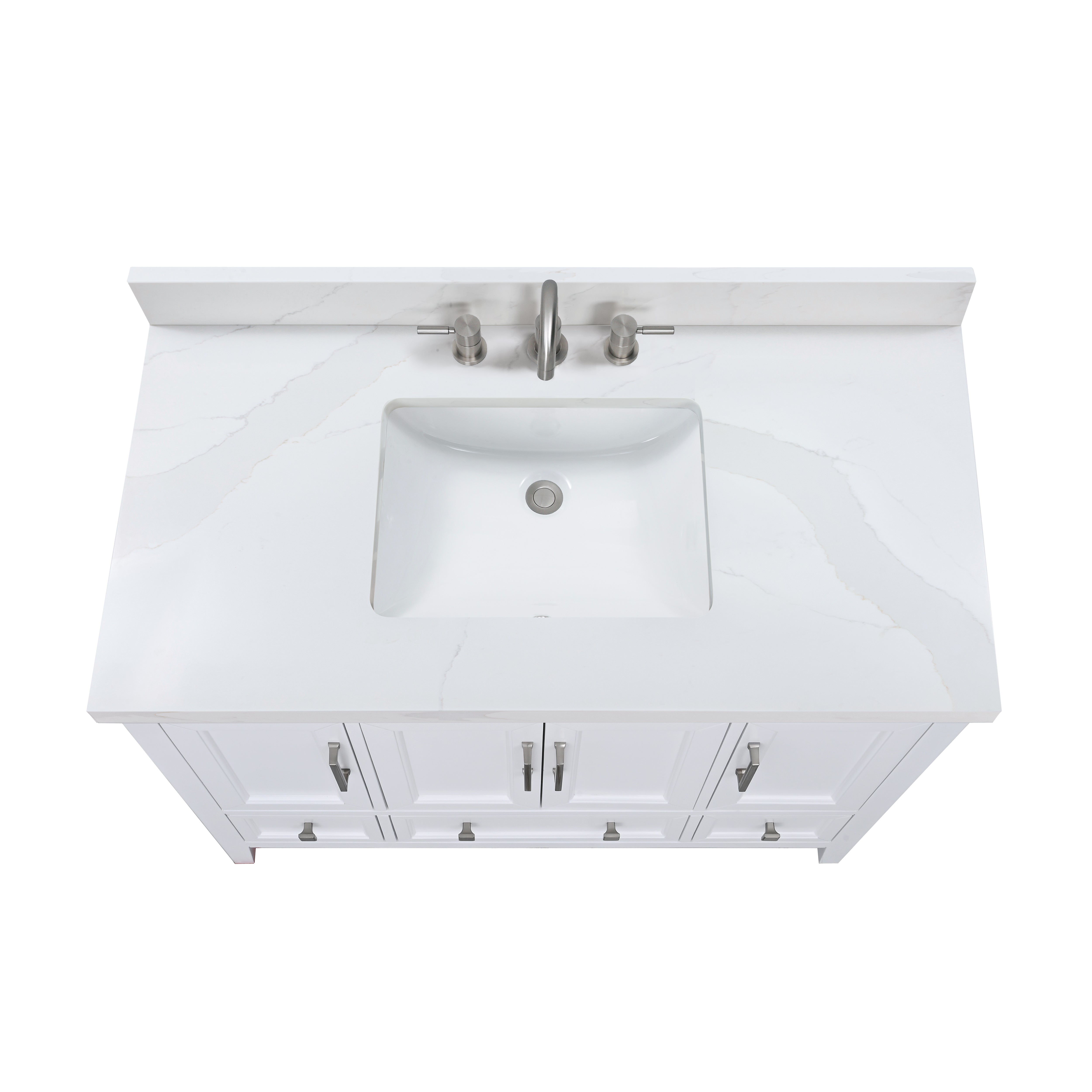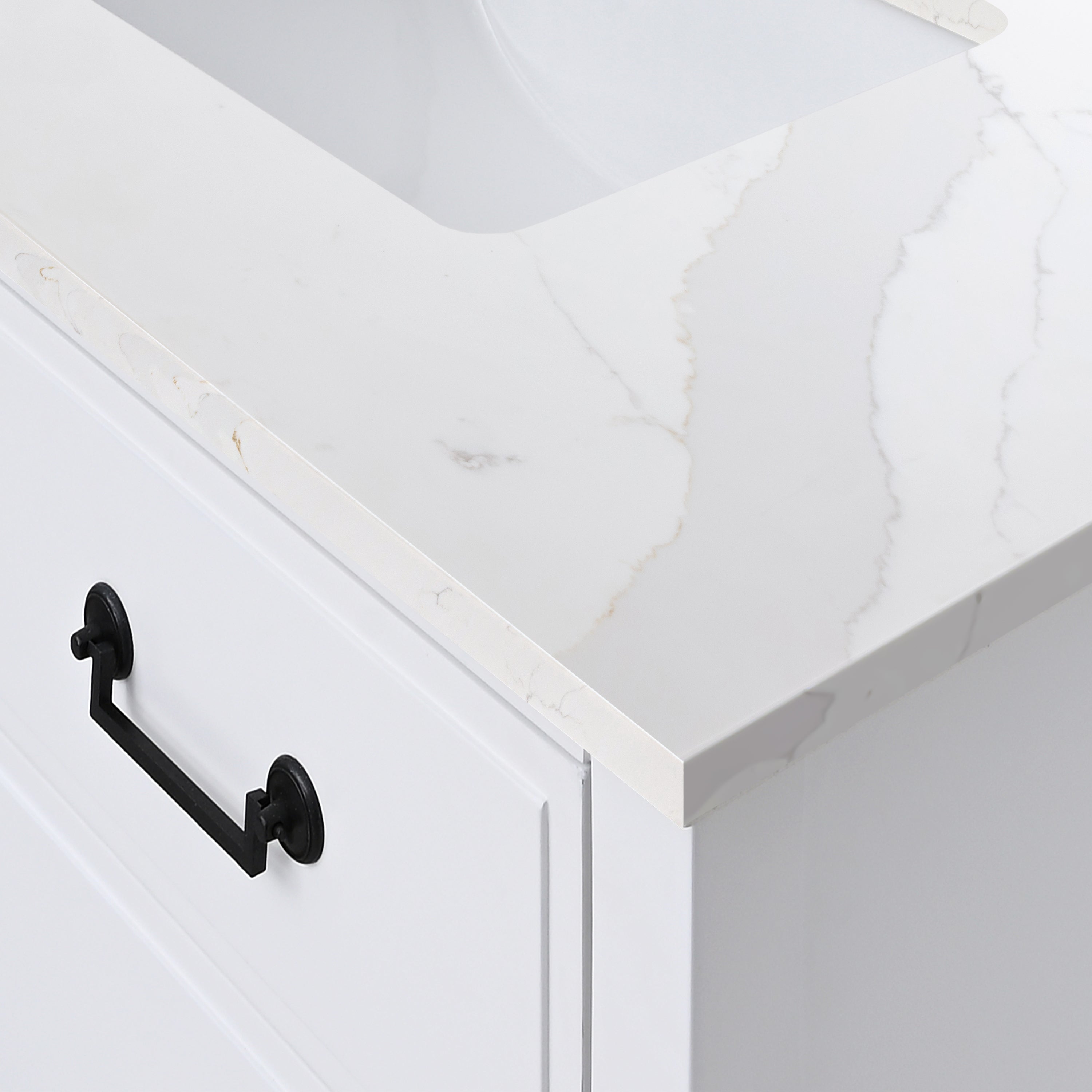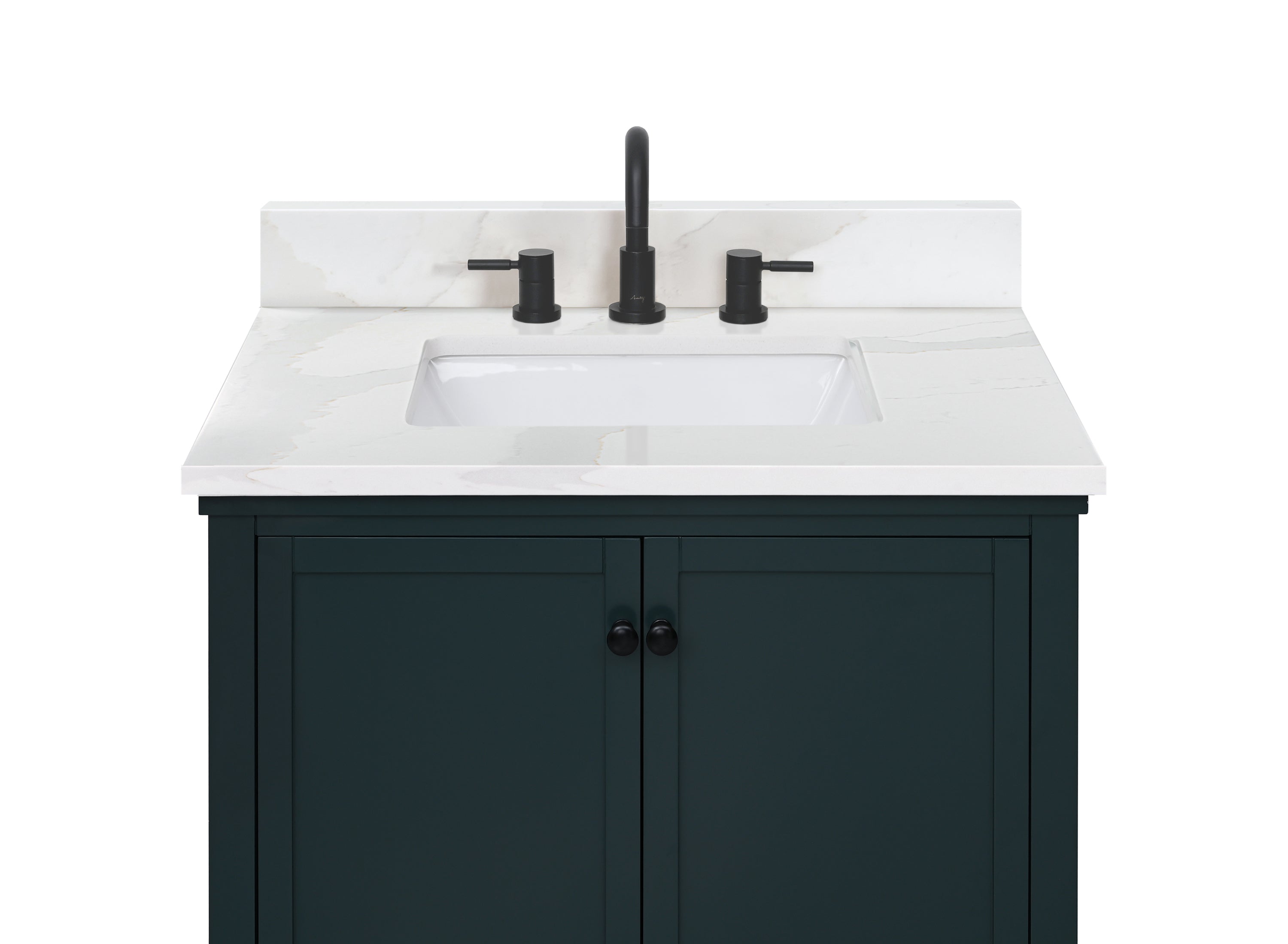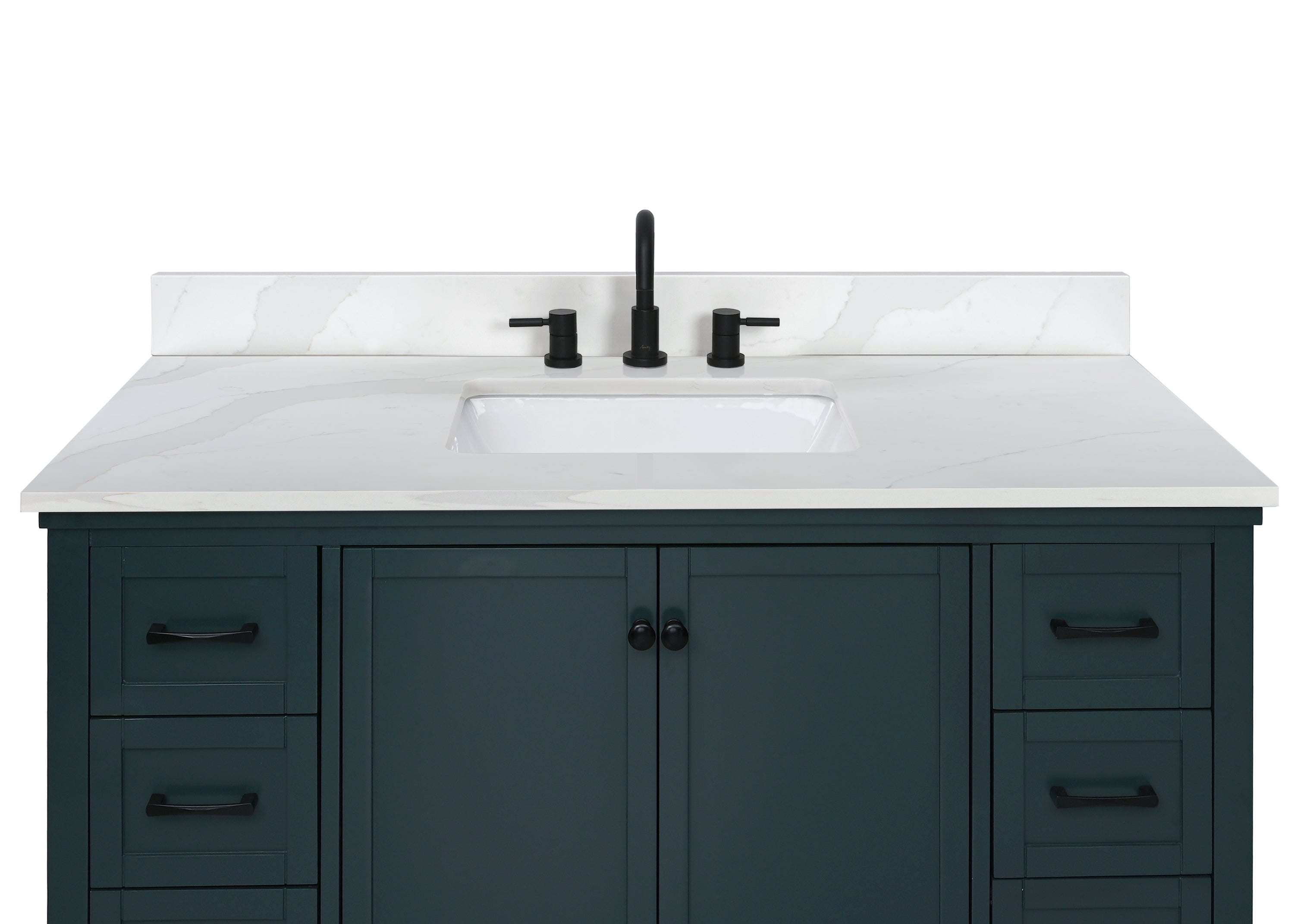 Complete your bathroom vanity with this elegant and durable Calacatta Quartz Top from Avanity. Featuring a pre-installed rectangular sink for a streamlined look and pre-drilled holes for easy faucet installation, nothing could be easier than topping off your vanity with this stunning piece of quartz stone. The top comes with a matching backsplash to help protect walls from any water damage. With a variety of sizes available, Avanity’s Calacatta Quartz top can be used in a variety of bathroom sizes and styles.