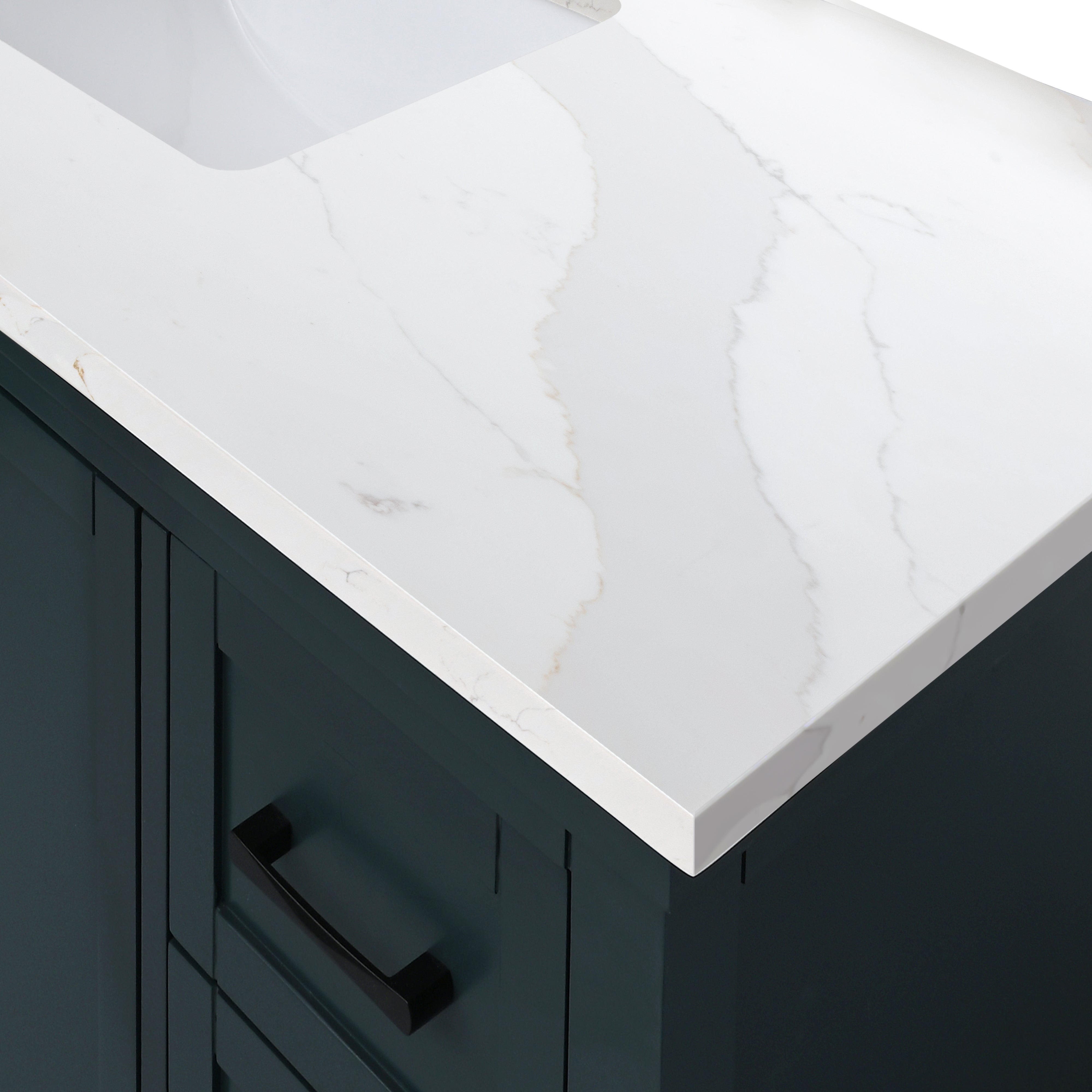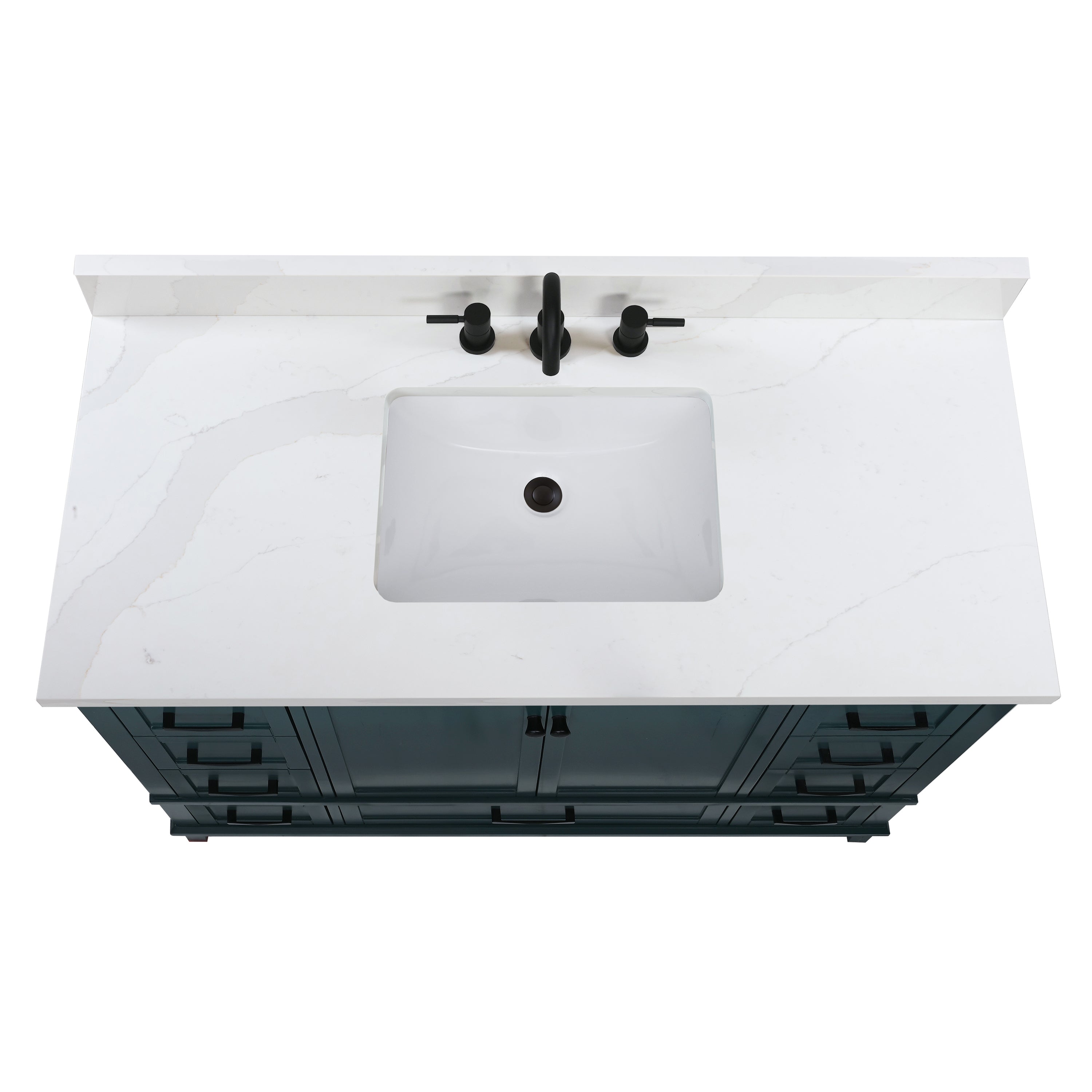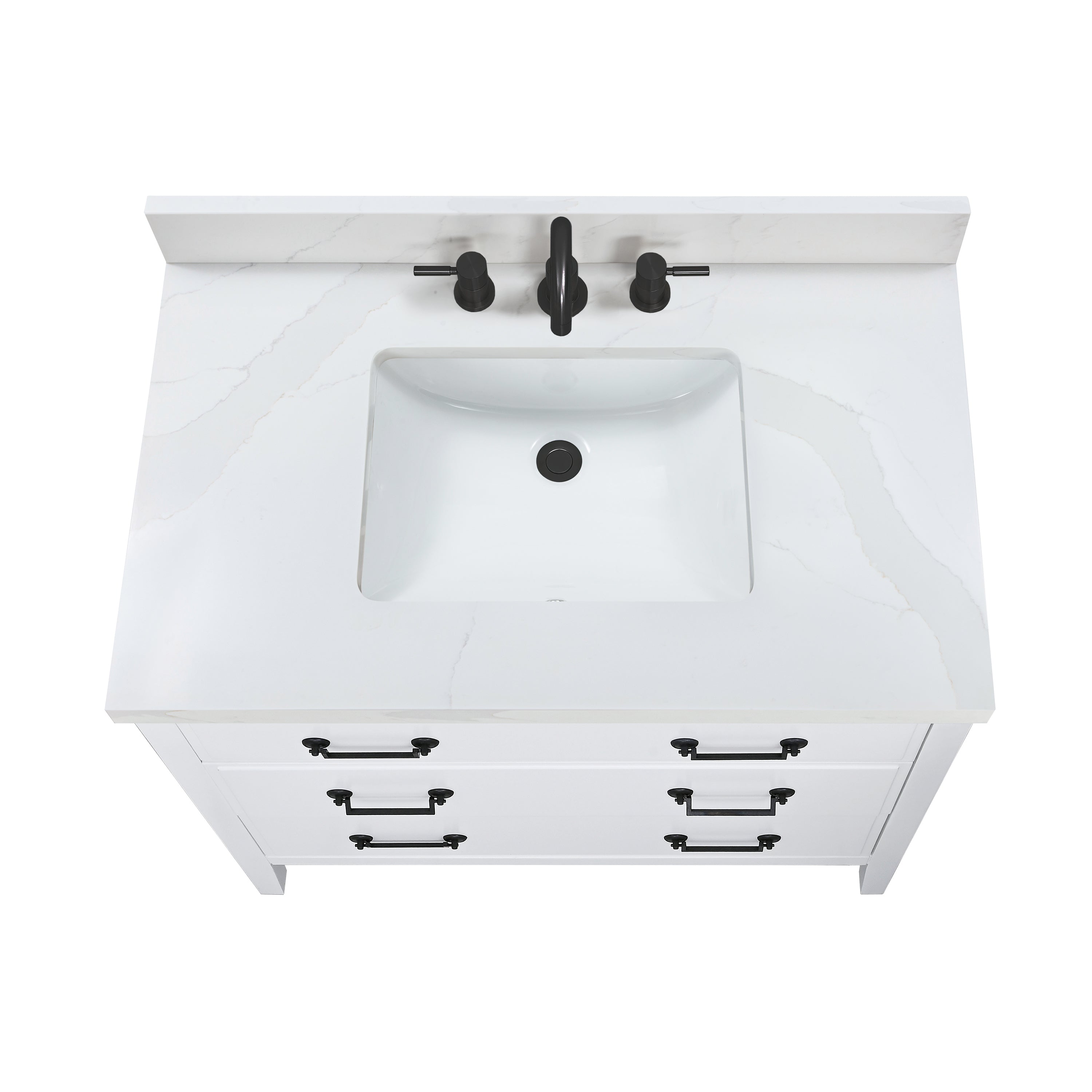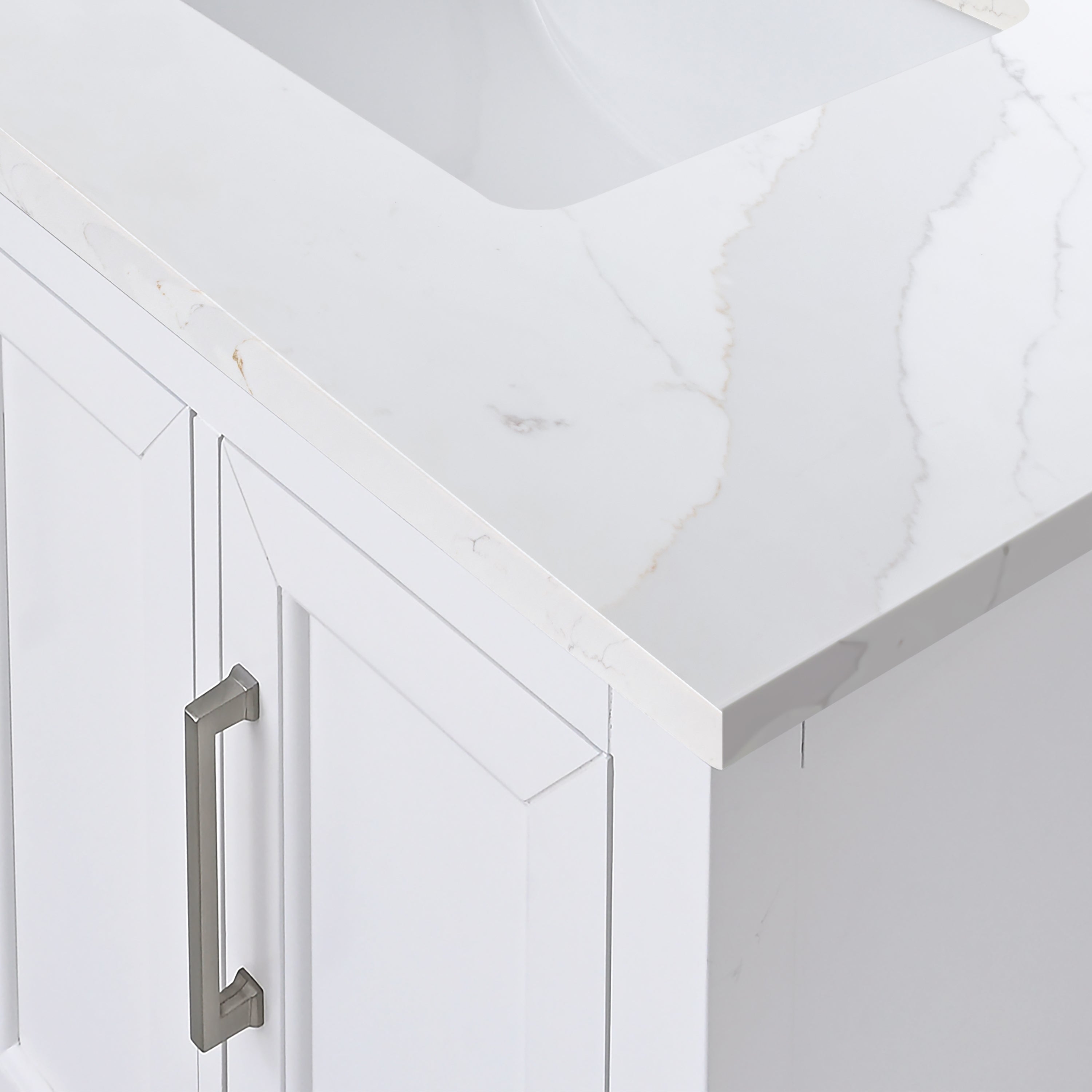 Complete your bathroom vanity with this elegant and durable Calacatta Quartz Top from Avanity. Featuring a pre-installed rectangular sink for a streamlined look and pre-drilled holes for easy faucet installation, nothing could be easier than topping off your vanity with this stunning piece of quartz stone. The top comes with a matching backsplash to help protect walls from any water damage. With a variety of sizes available, Avanity’s Calacatta Quartz top can be used in a variety of bathroom sizes and styles.