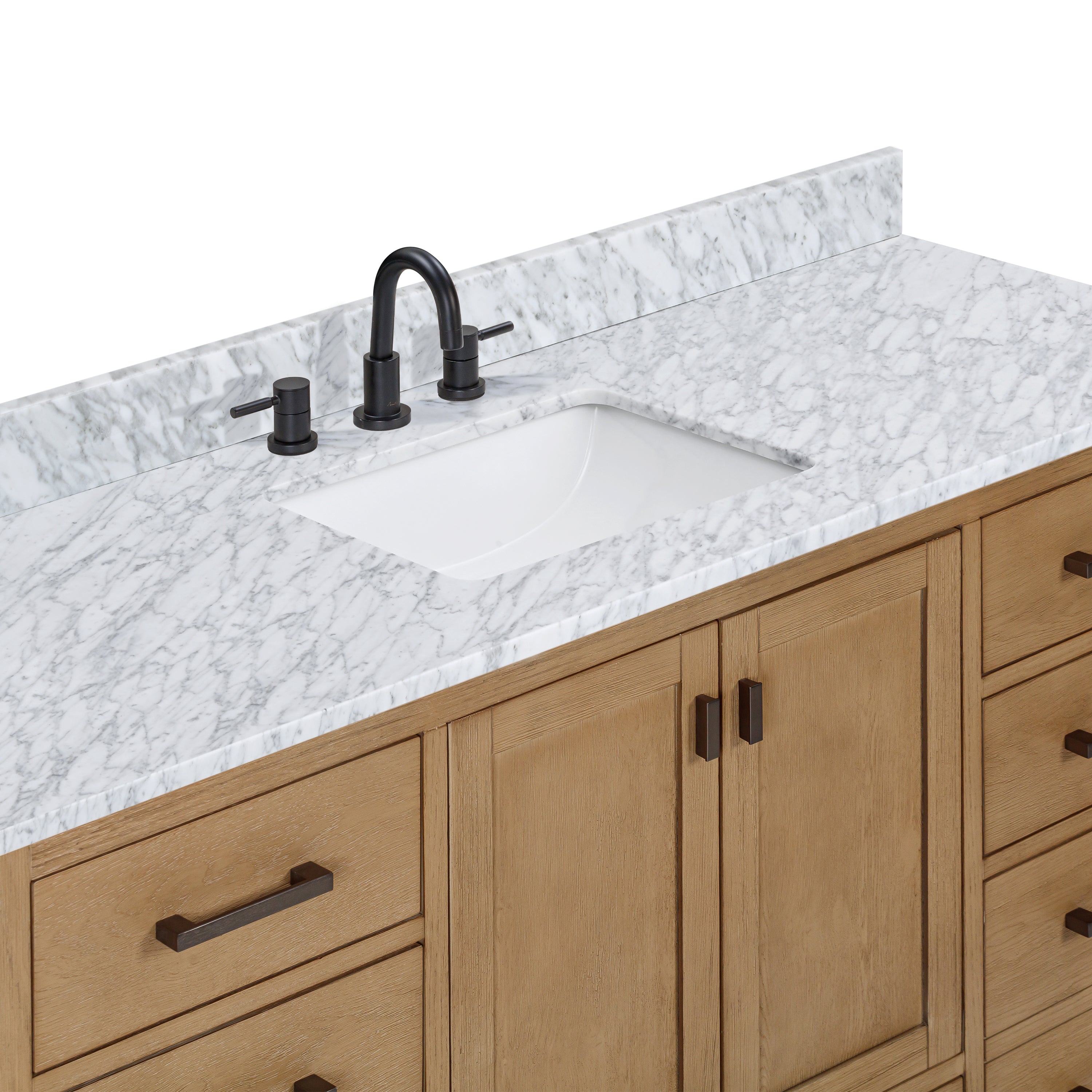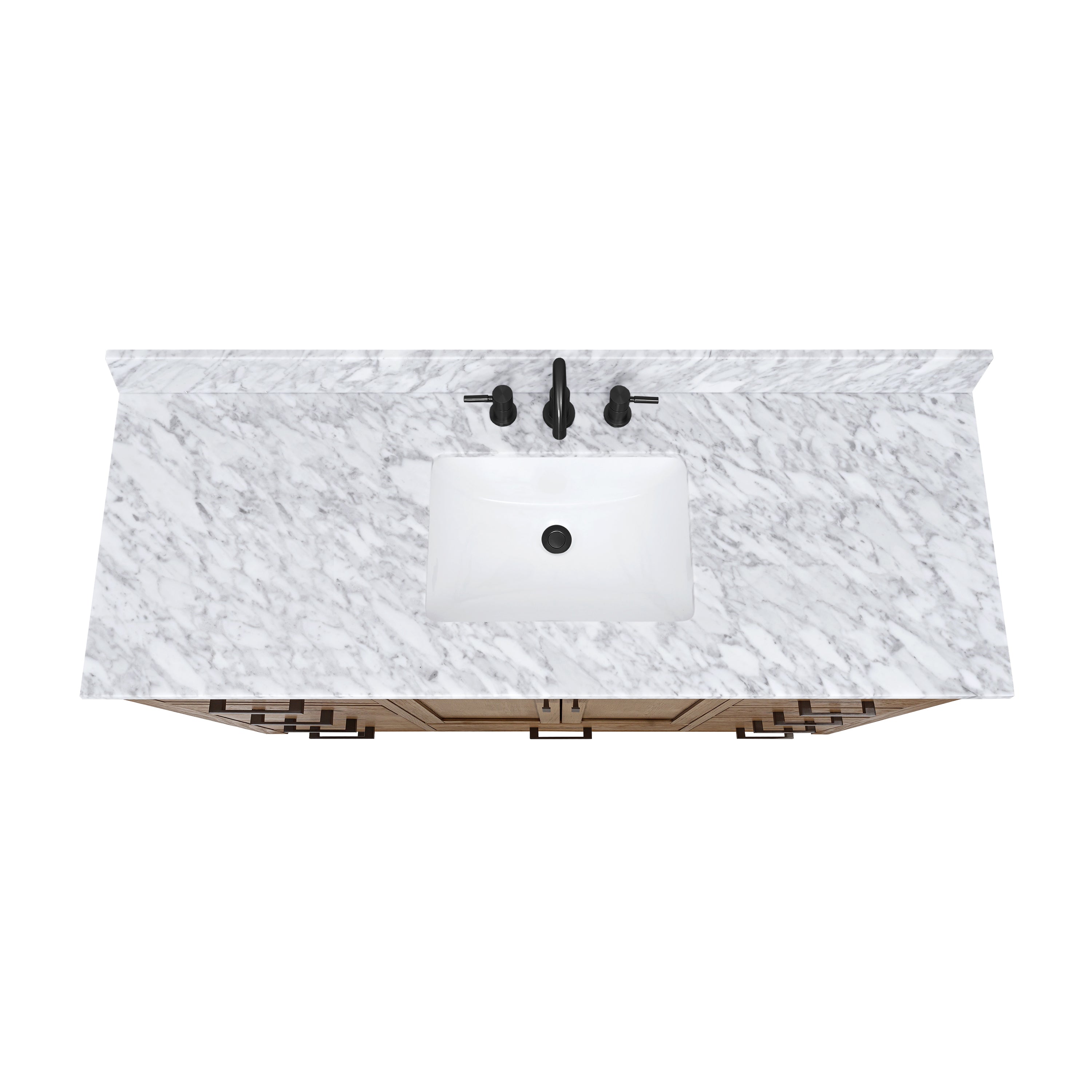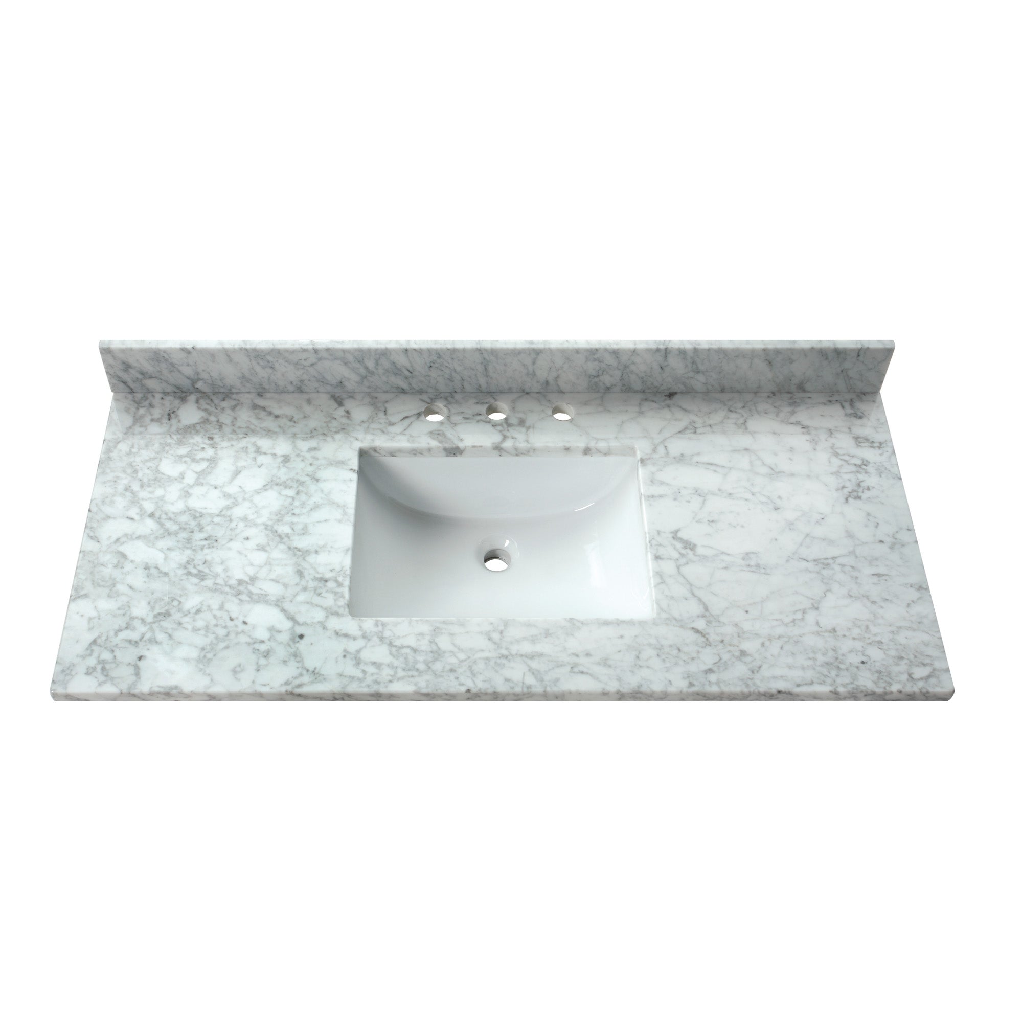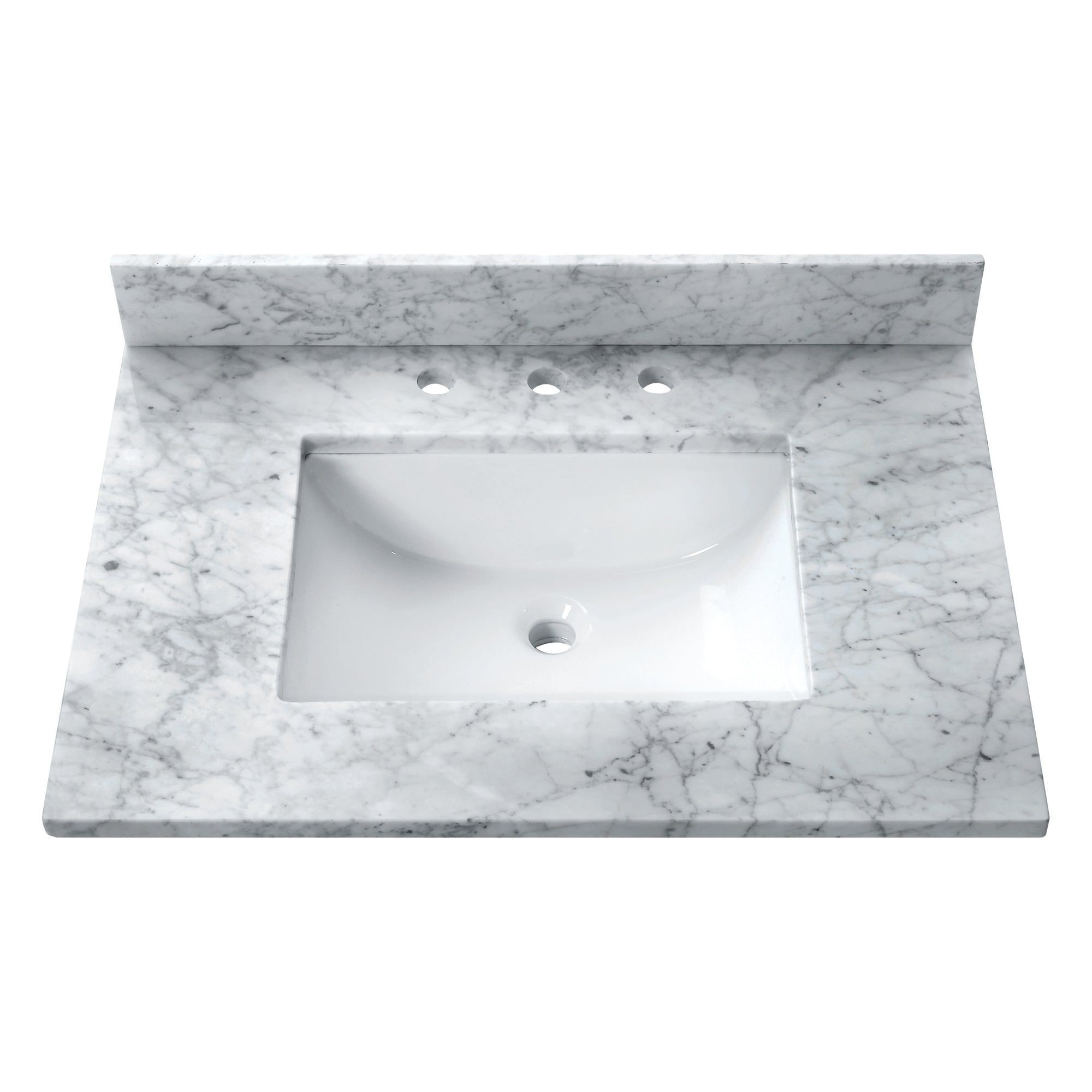 Carrara white natural marble bathroom vanity top will provide you a stunning and luxurious bathroom. Natural gray veining adds uniqueness to each piece and the straight edge profile offers a modern look. Easy installation and care. The vanity top includes a 4-in high back splash and a single rectangular sink. Side splash is sold separately and it can be installed on either left side or right side.
