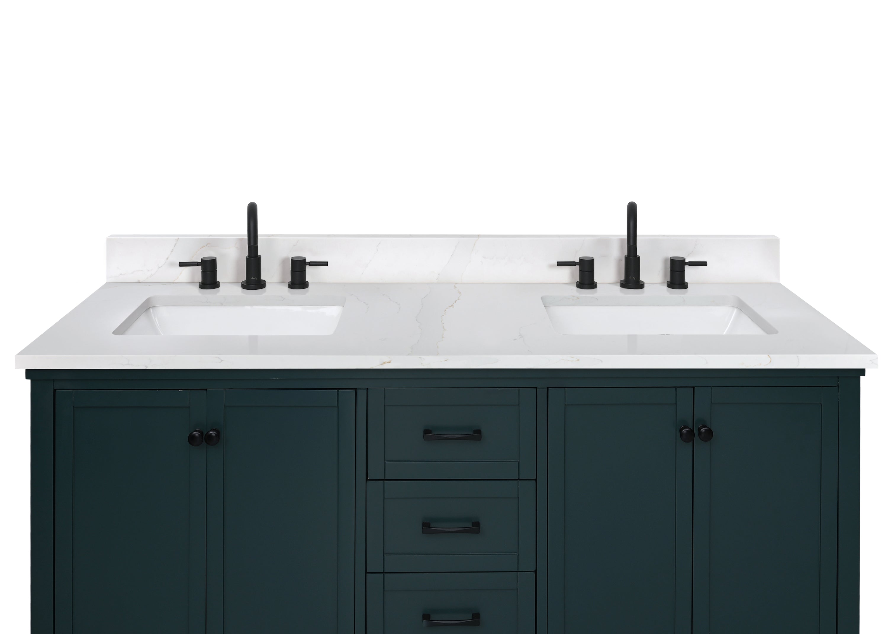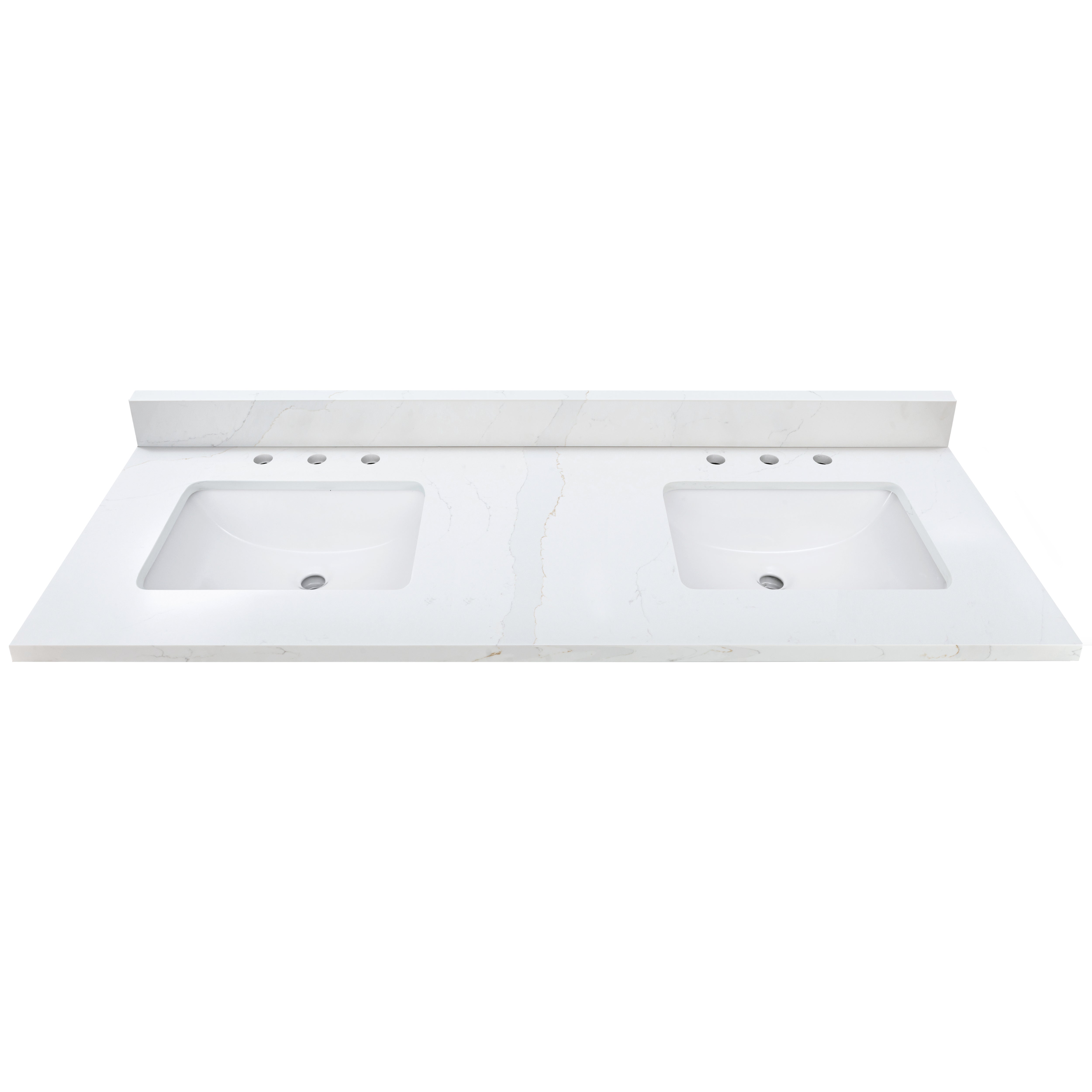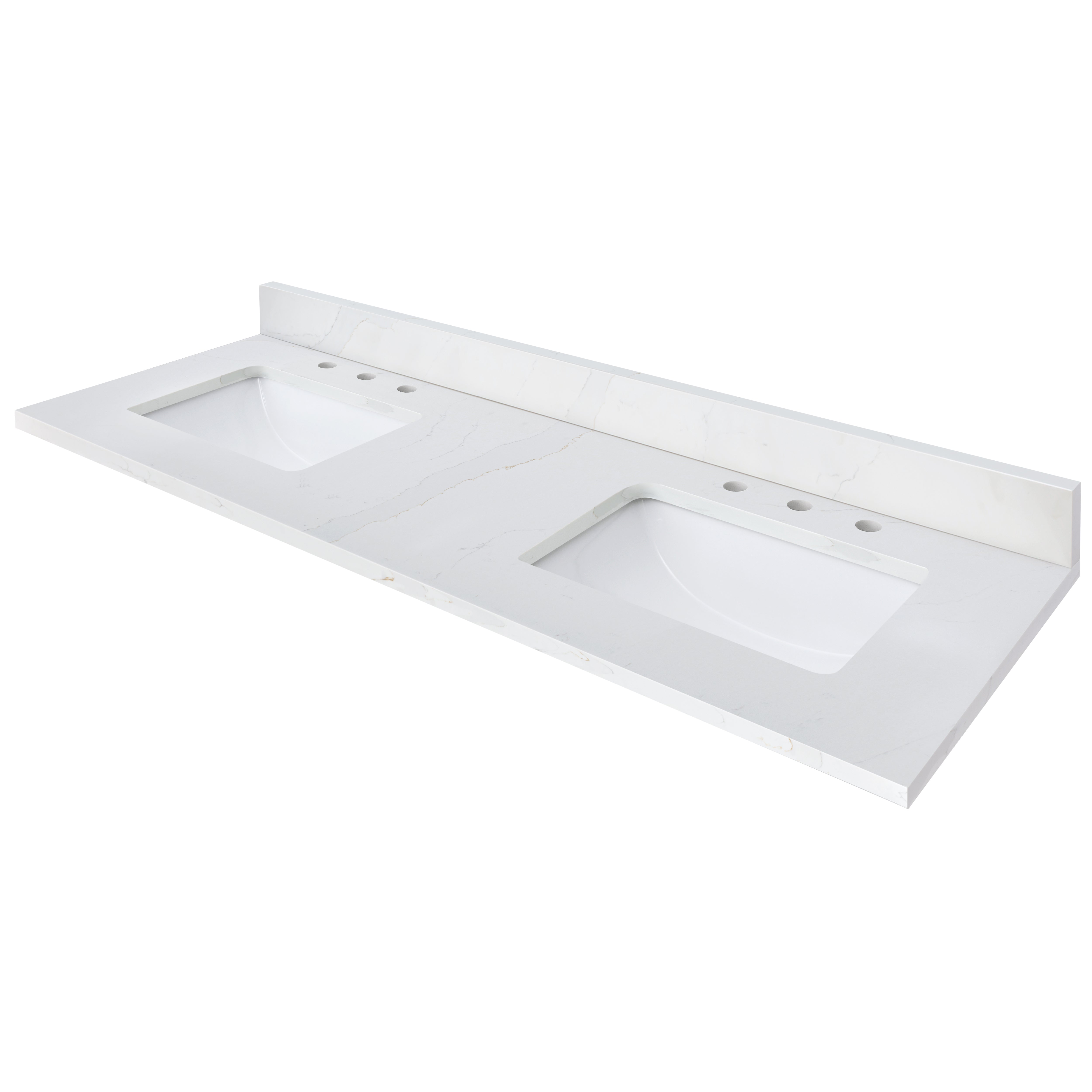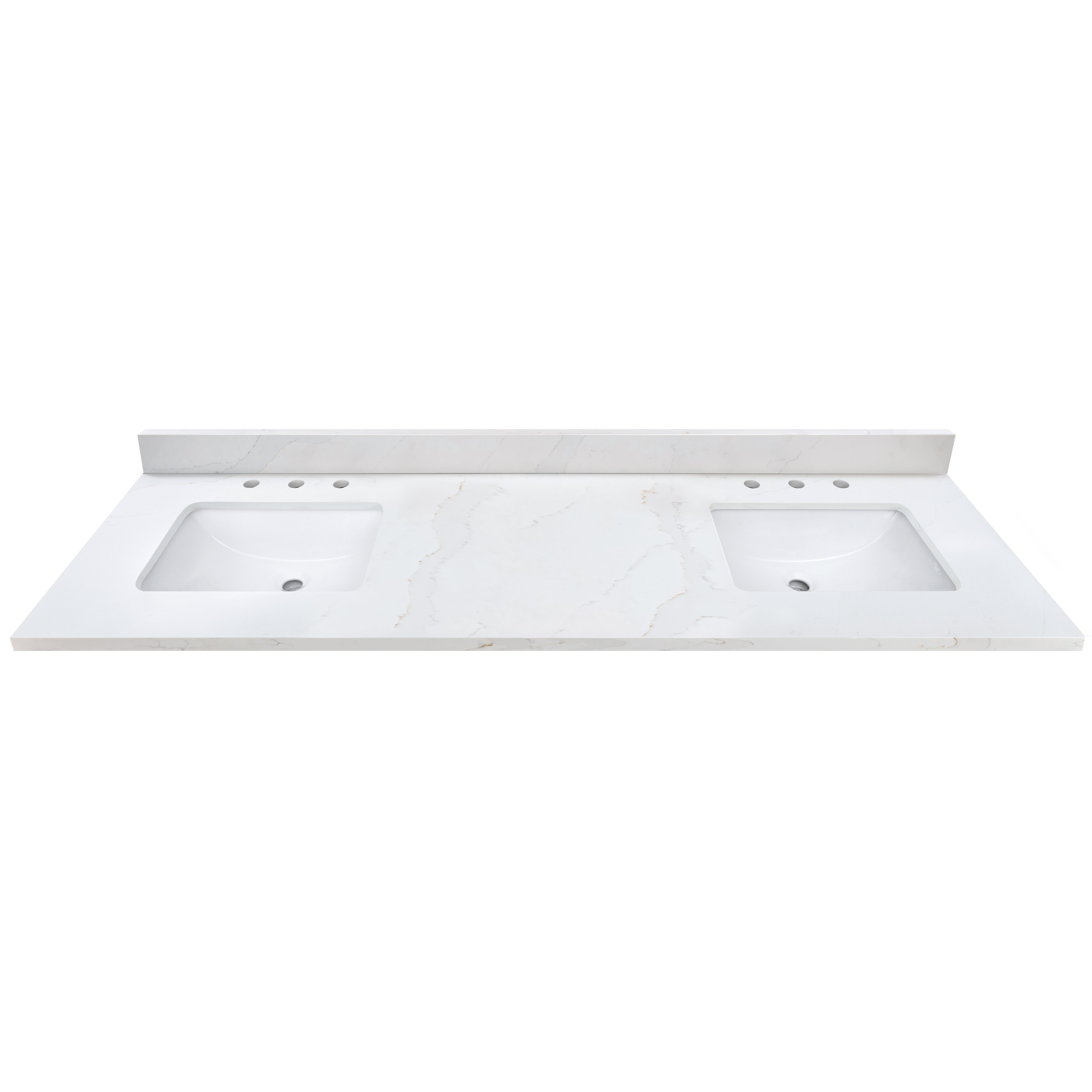 Complete your bathroom vanity with this elegant and durable Calacatta Quartz Top from Avanity. Featuring dual pre-installed rectangular sinks for a streamlined look and pre-drilled holes for easy faucet installation, nothing could be easier than topping off your vanity with this stunning piece of quartz stone. The top comes with a matching backsplash to help protect walls from any water damage. With a variety of sizes available, Avanity’s Calacatta Quartz top can be used in a variety of bathroom sizes and styles.