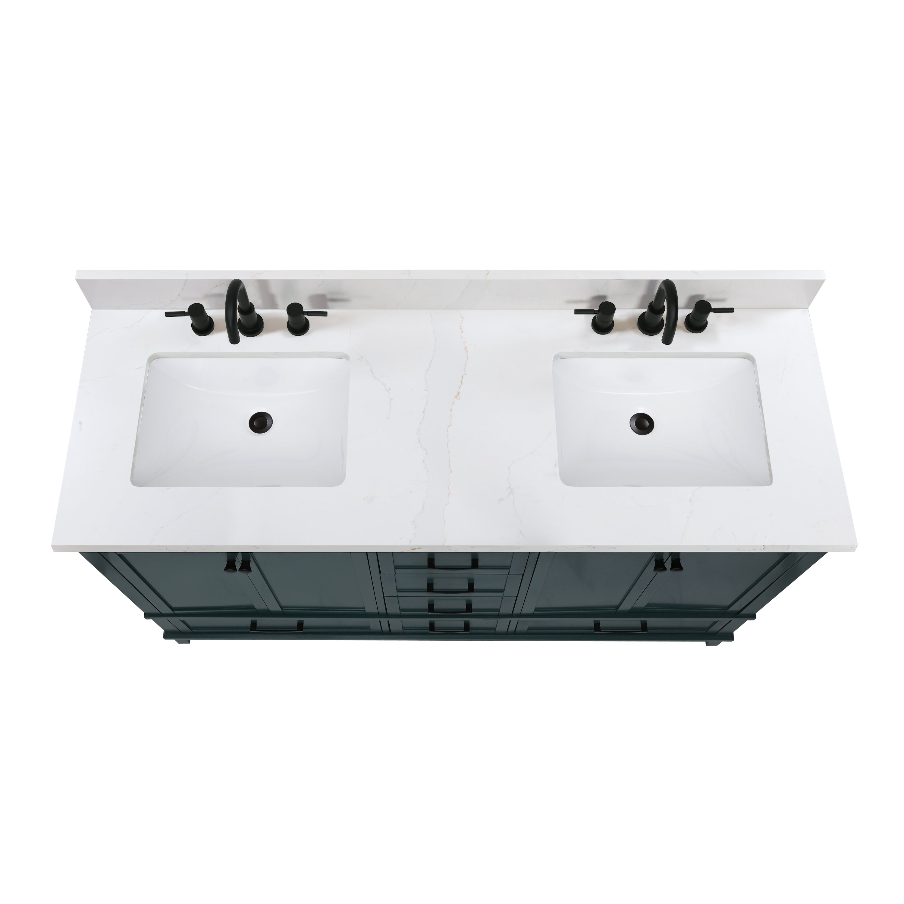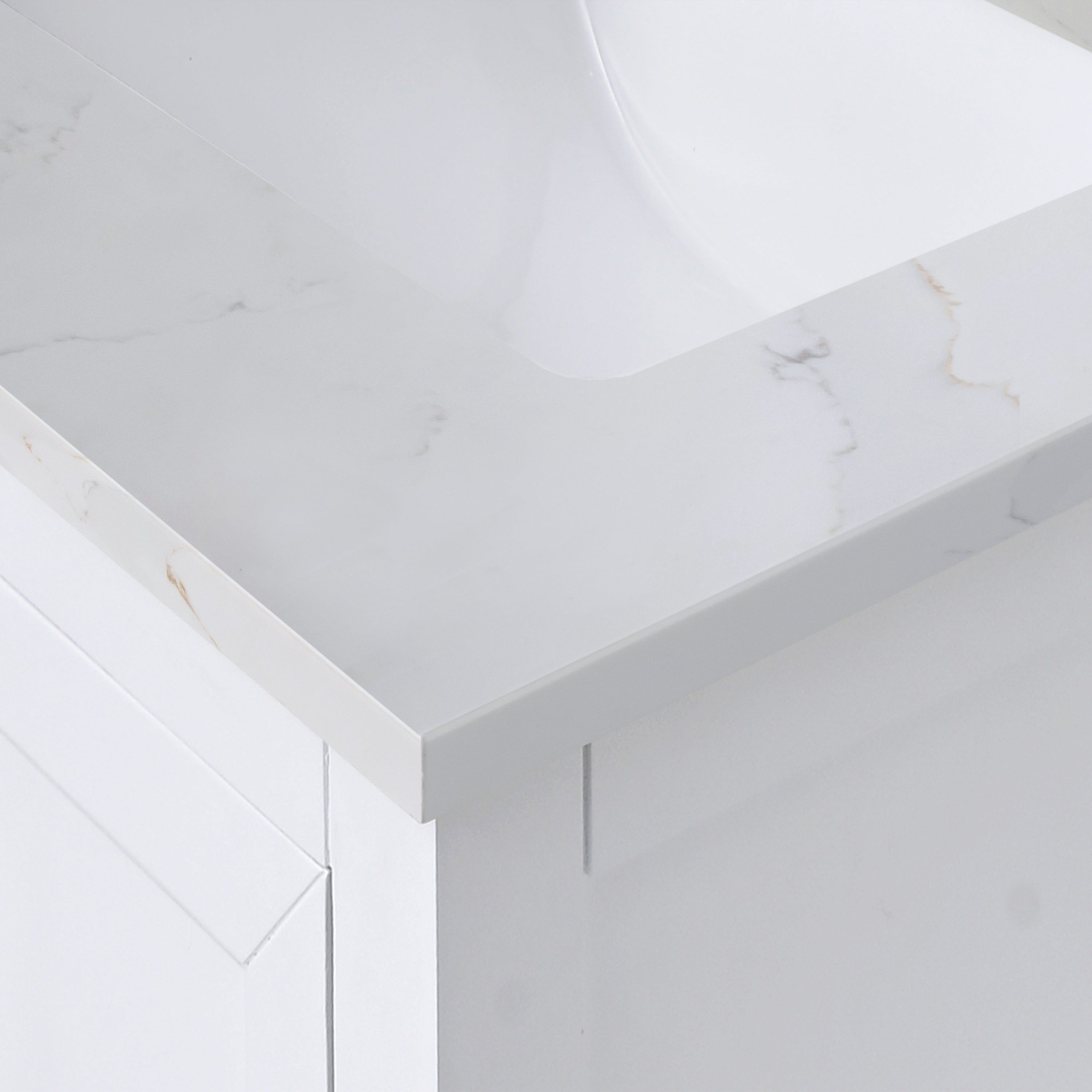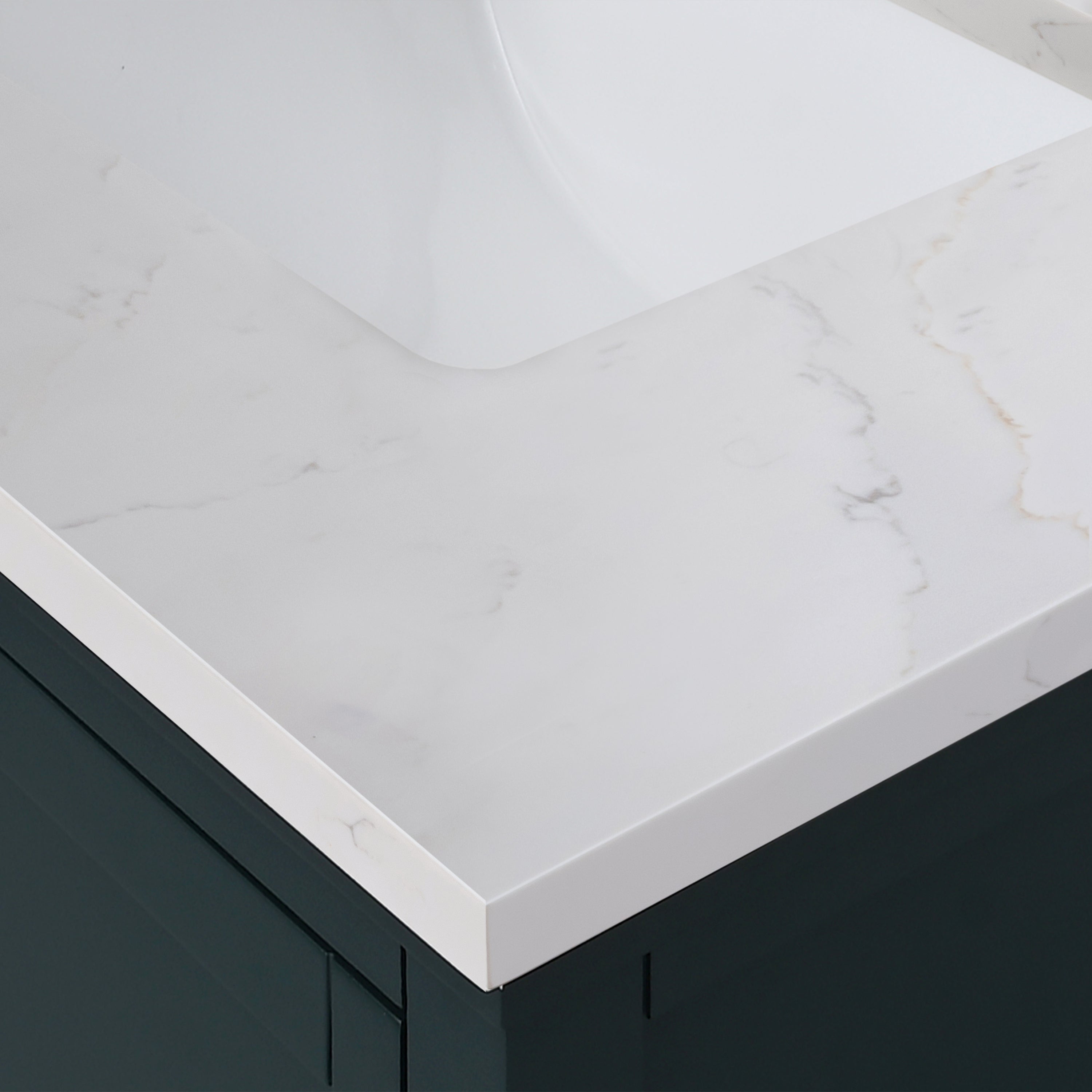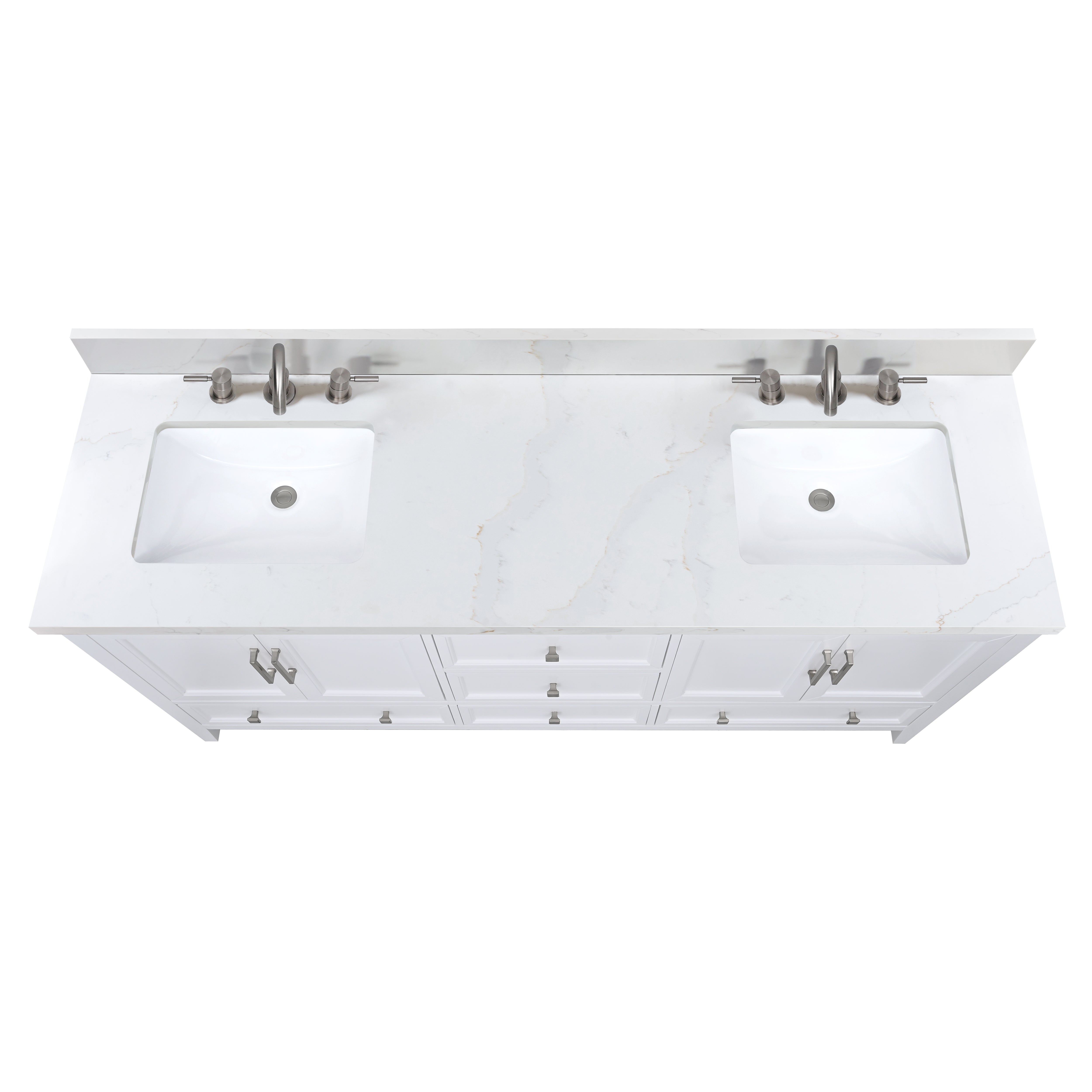 Complete your bathroom vanity with this elegant and durable Calacatta Quartz Top from Avanity. Featuring dual pre-installed rectangular sinks for a streamlined look and pre-drilled holes for easy faucet installation, nothing could be easier than topping off your vanity with this stunning piece of quartz stone. The top comes with a matching backsplash to help protect walls from any water damage. With a variety of sizes available, Avanity’s Calacatta Quartz top can be used in a variety of bathroom sizes and styles.