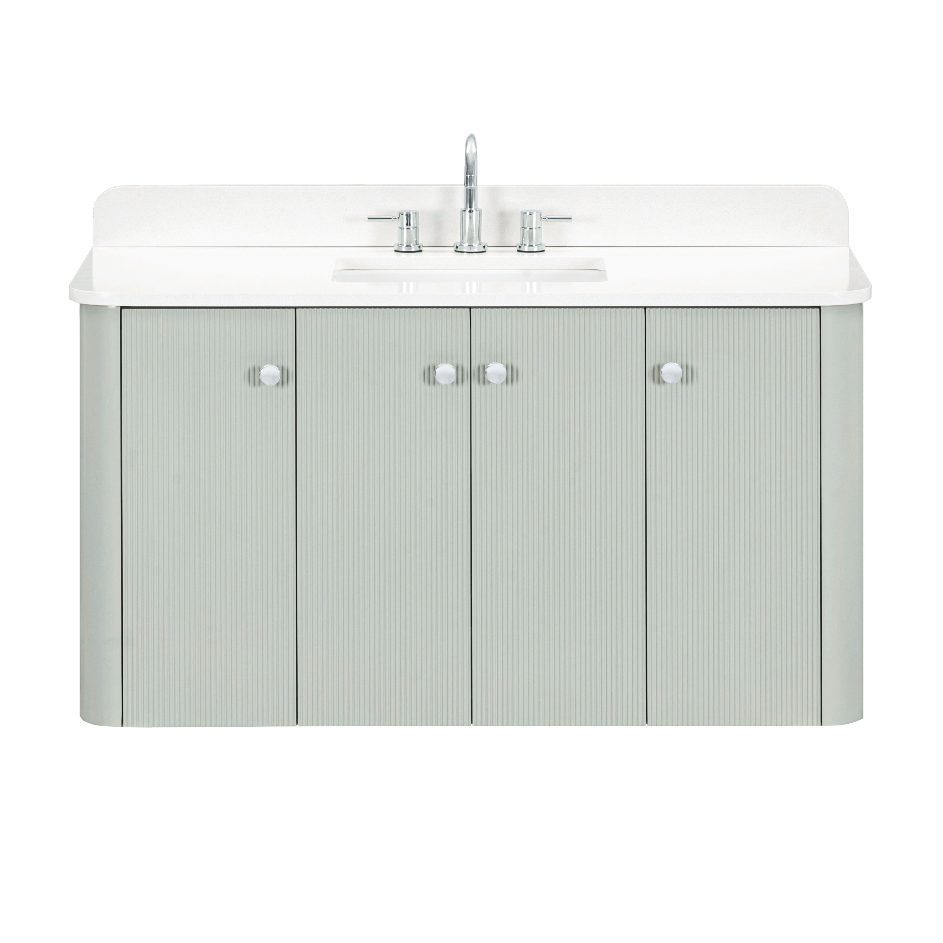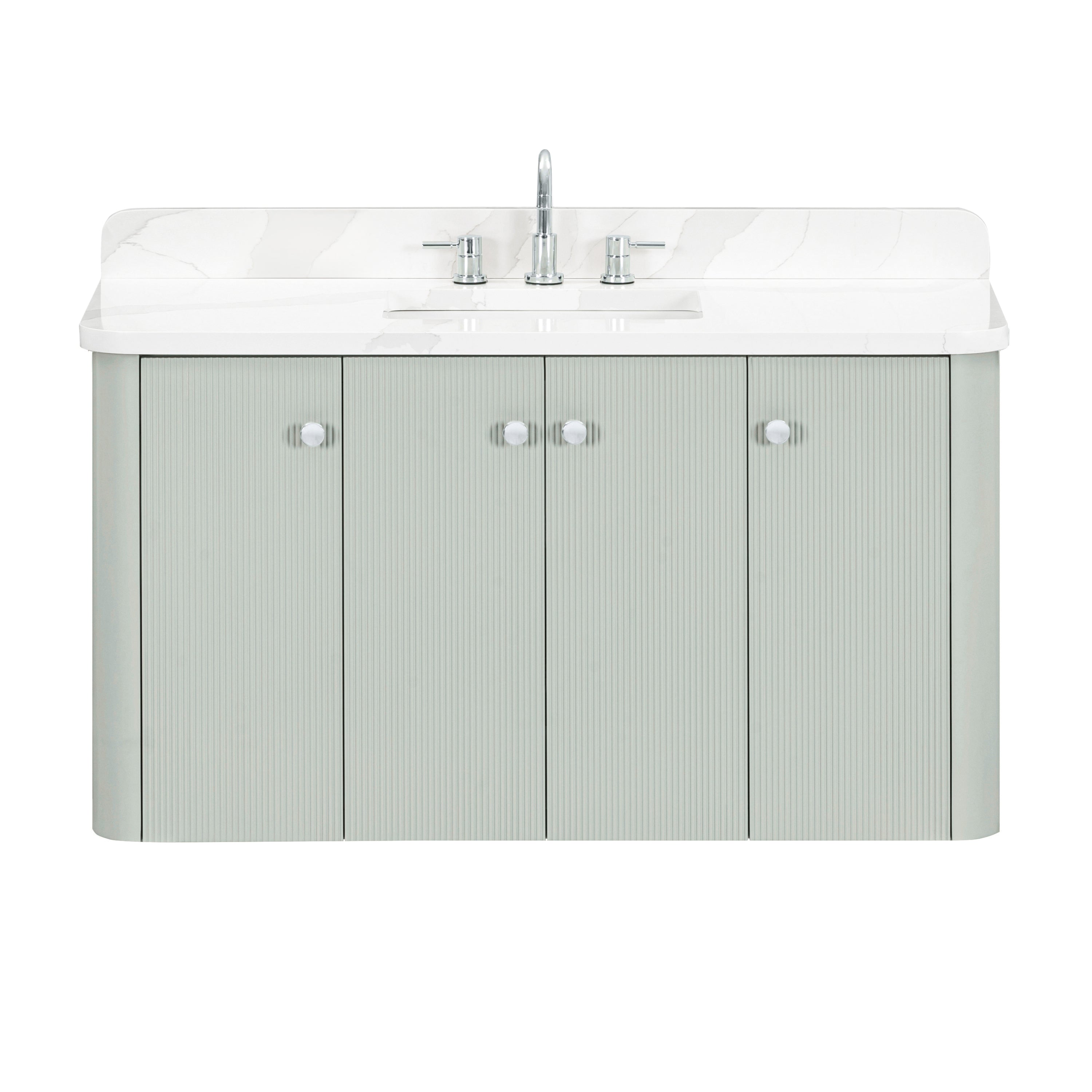The Haley Collection showcases a light green finish with reeded-texture doors, adding depth and elegance. Rounded corners create a soft, fluid profile, while the solid wood frame enhances durability and adds design contrast. Integrated power strip with USB outlets included for convenience. A perfect fusion of artistry and practicality, Haley brings smart sophistication to any bathroom space.
