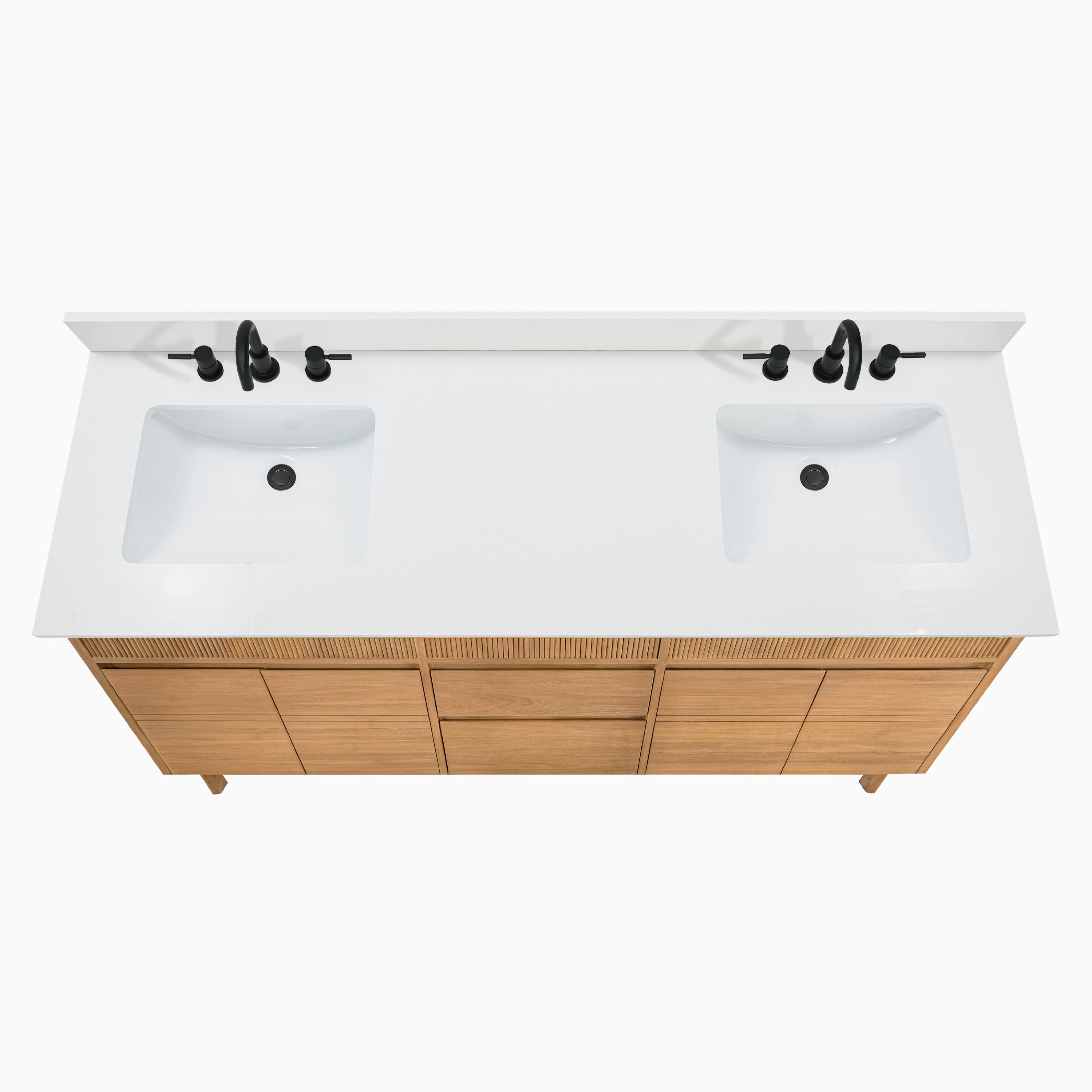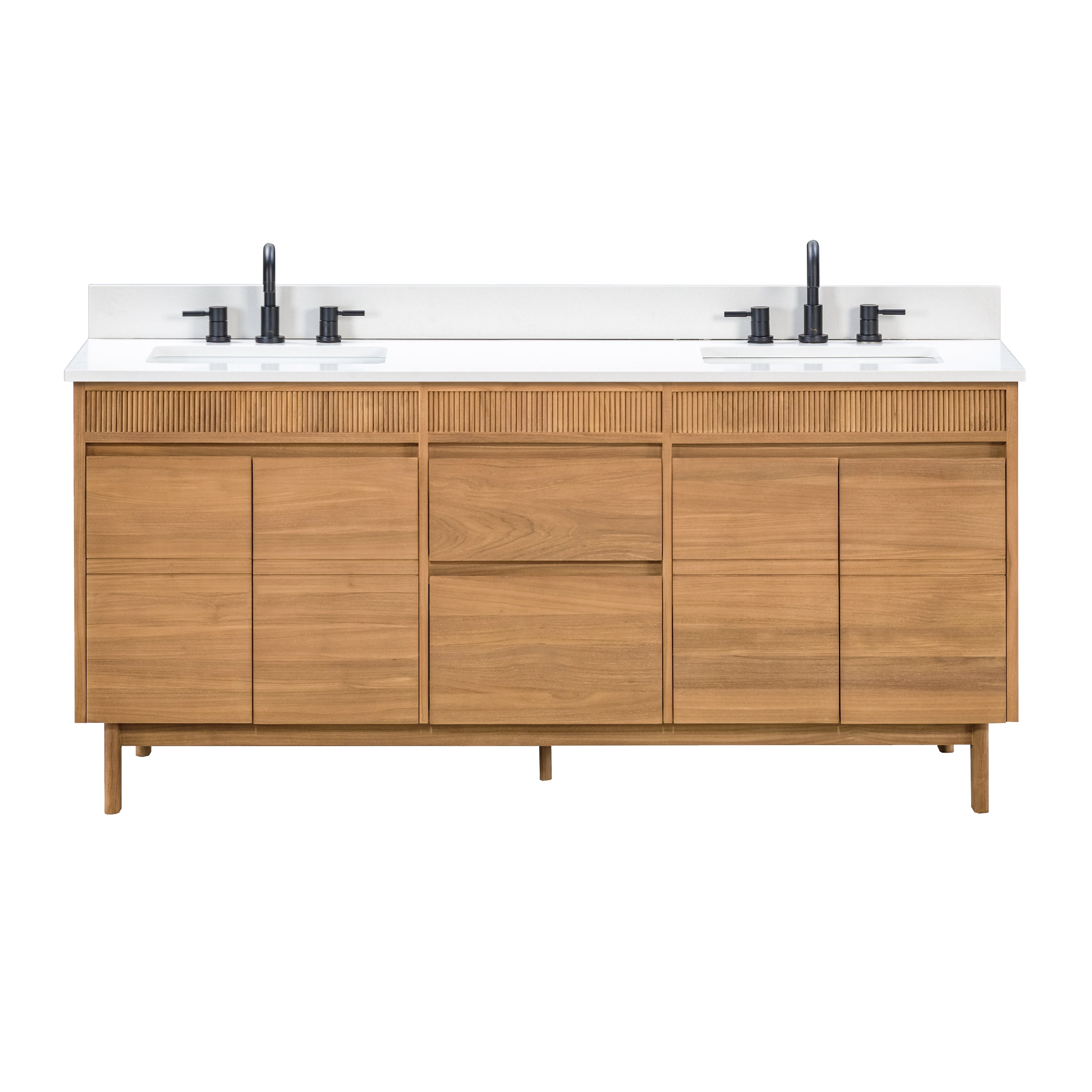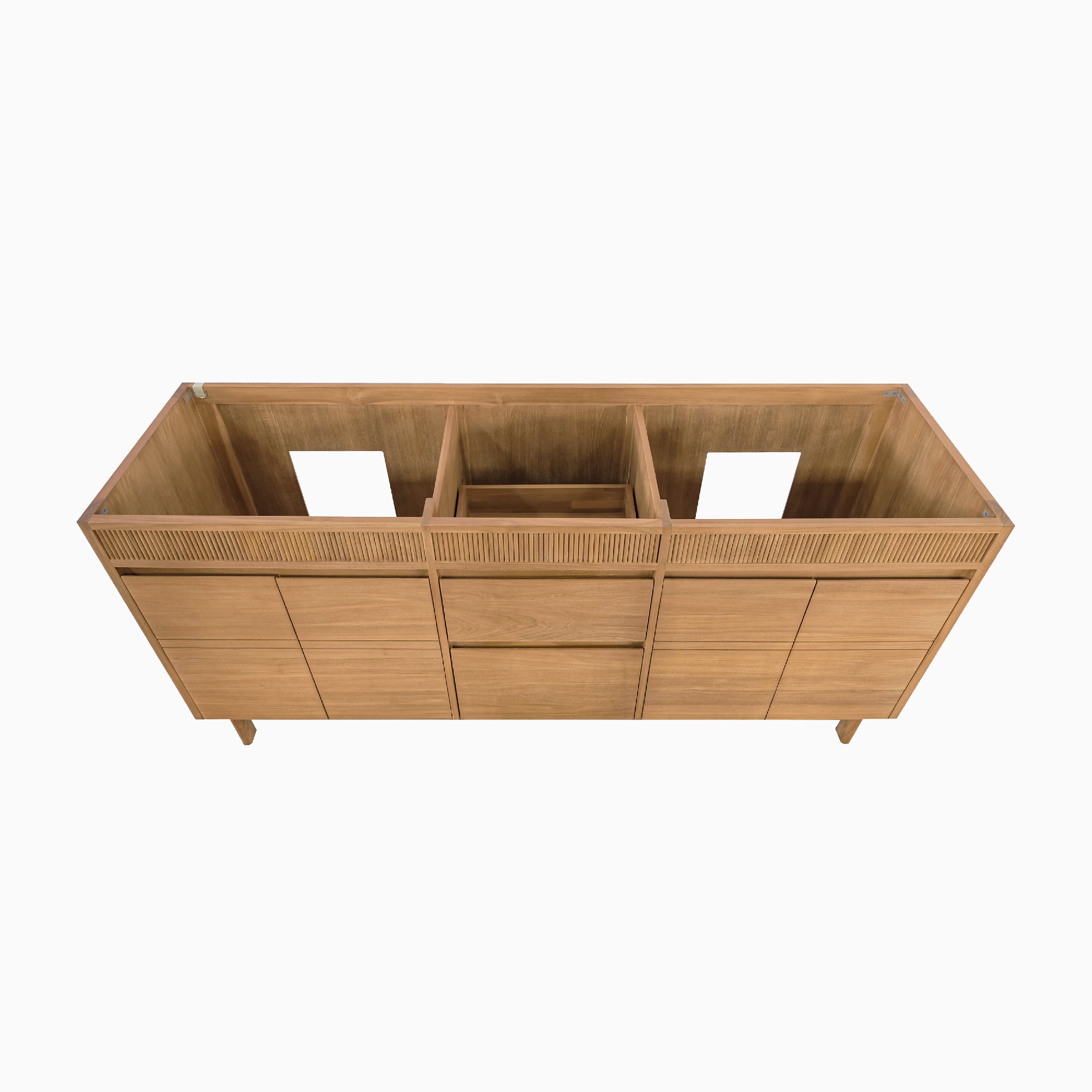 The Kayla Collection delivers the timeless beauty and durability of solid teak wood to a classic vanity design. Known for its rich grain and natural moisture resistance, teak ensures long-lasting performance in humid environments. A solid teak wood frame provides exceptional stability, while the minimalist flat-panel design keeps the look clean and modern. Subtle reeding details in the apron add texture and contrast, elevating the vanity’s refined aesthetic. Thoughtfully crafted for both function and style, Kayla brings sophistication to any bathroom.