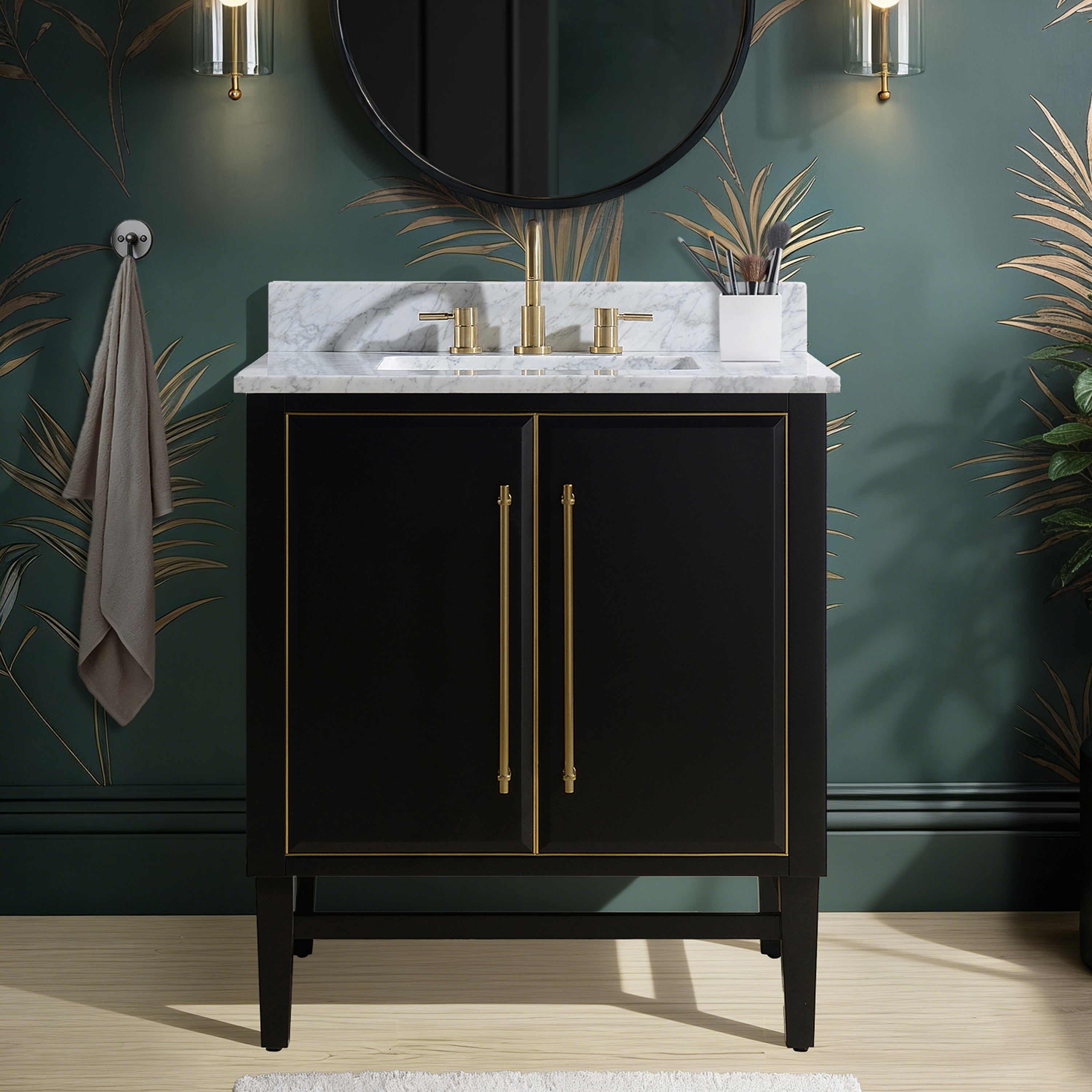 Inspired by the inherent luxury of Art Deco, the 30-in Mason vanity embraces the aesthetic of modern elegance. The extra-long matte gold or brushed silver hardware captures the eye with vertical lines. The stunning black finish commands attention in any bathroom setting. Solid wood frames, metal trim, soft-close glides and solid wood drawer box with dividers speak to Mason’s quality. Pair the cabinet with the matching mirror to complete the look. For a beautiful vanity that boasts a wealth of fine details, make it Mason.