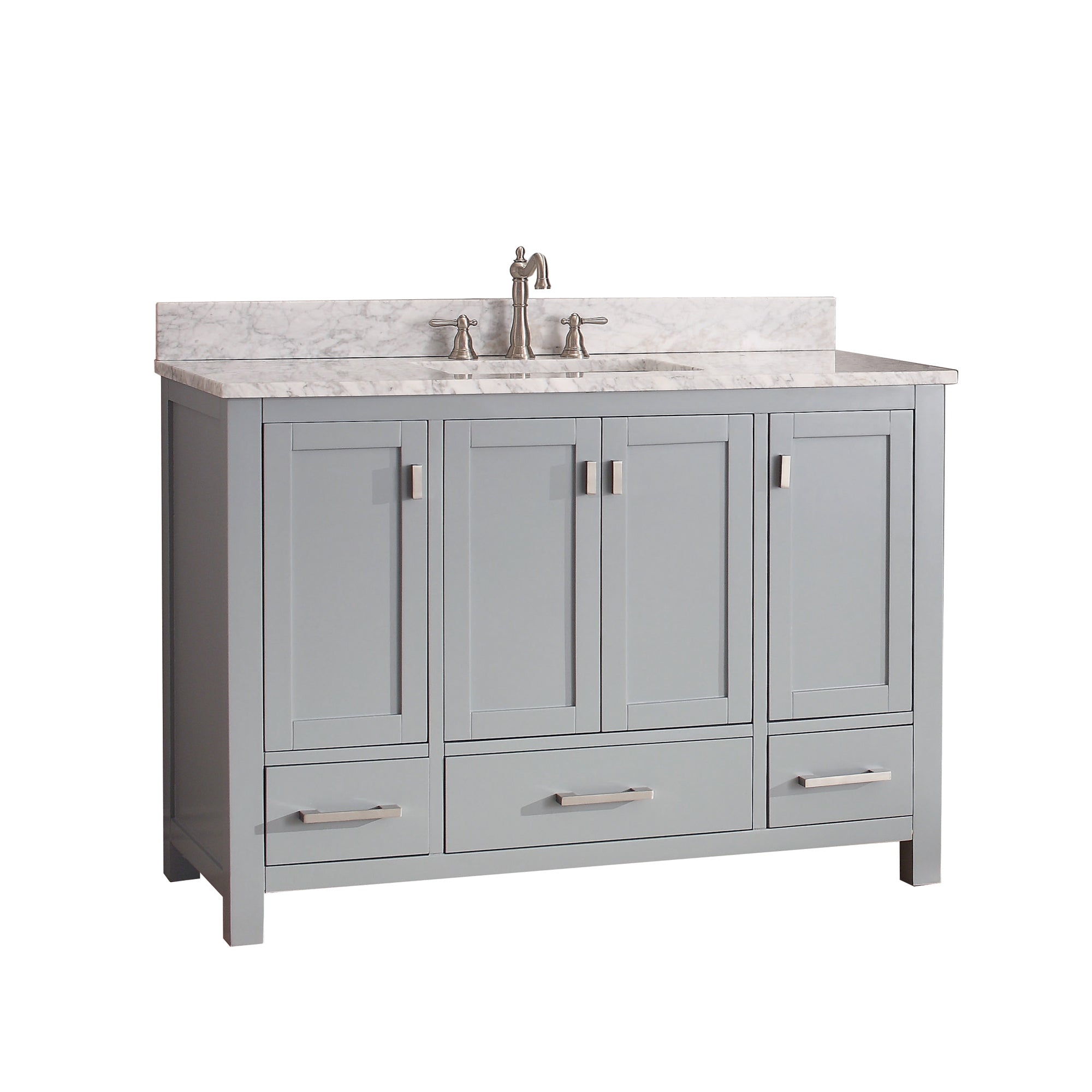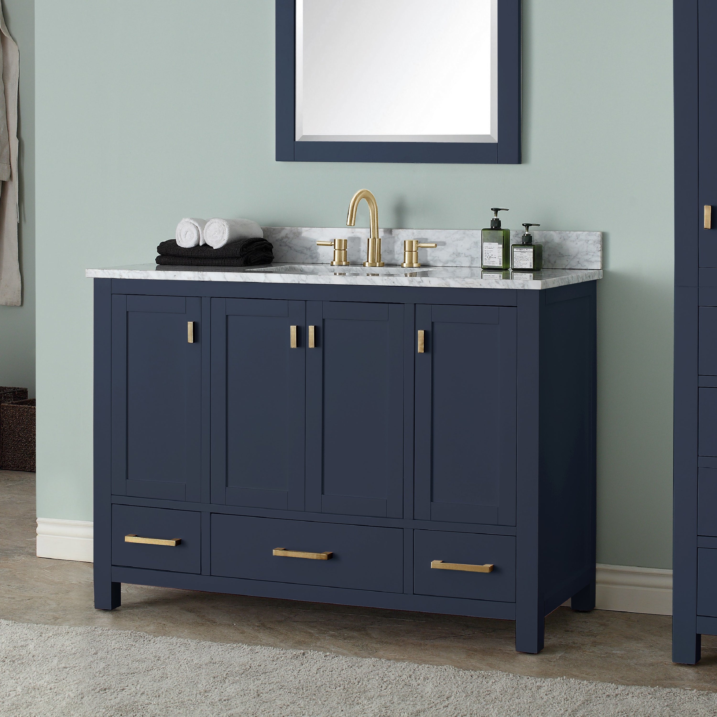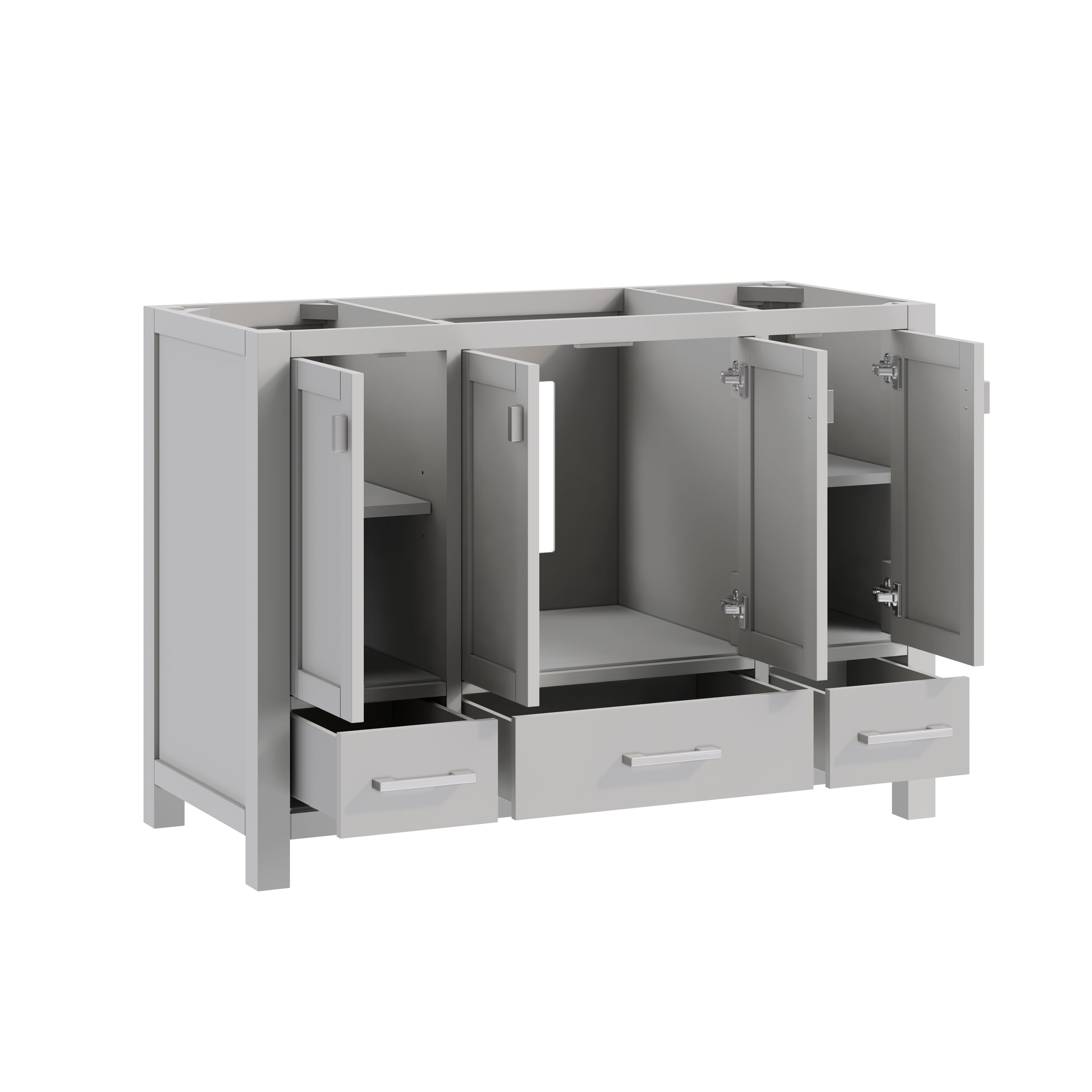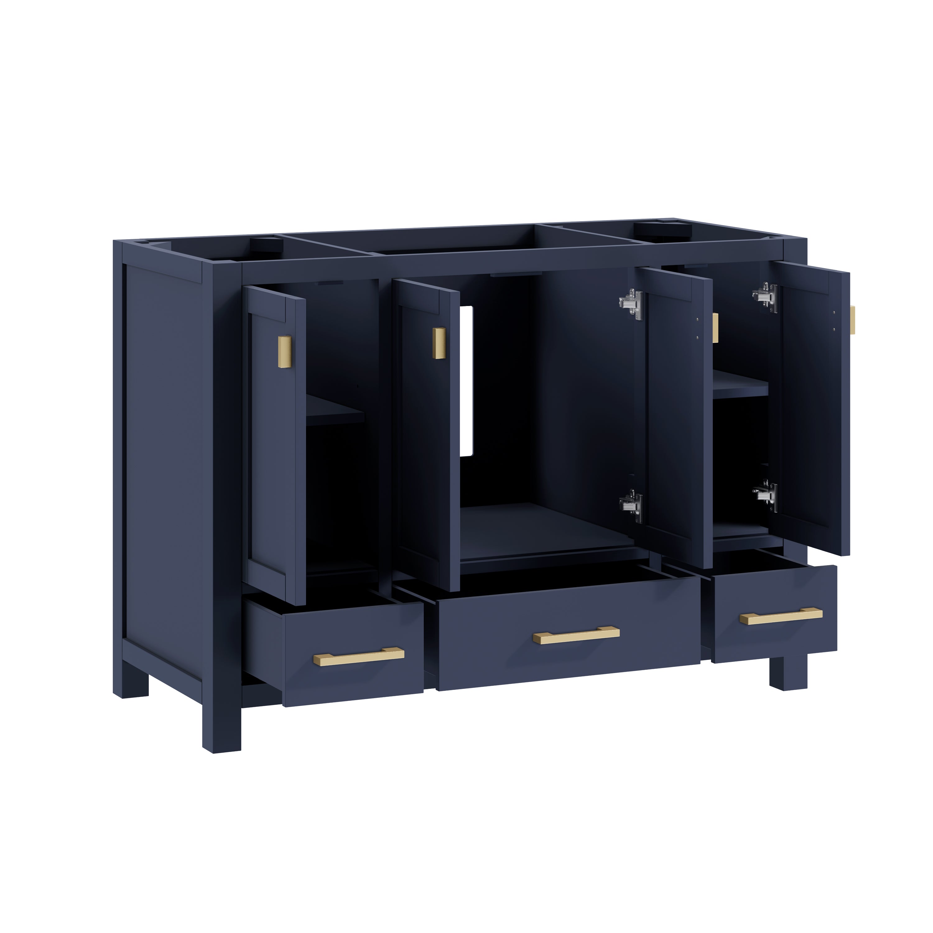 - Ample storage with 3 full-extension drawers, and 4 soft-close cabinet doors