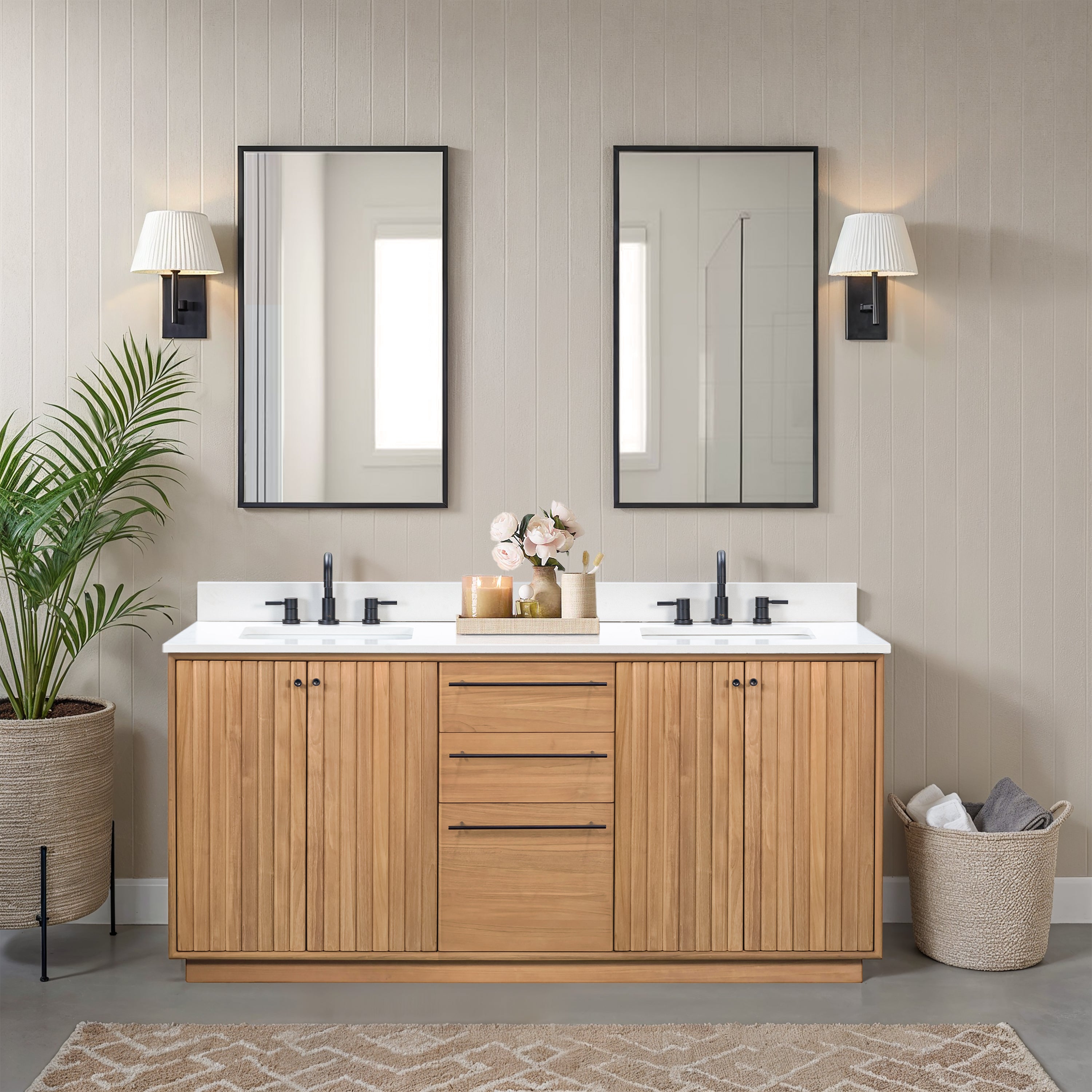 The Parker Collection brings the natural beauty and durability of solid teak wood, renowned for its rich grain and moisture resistance, to your bathroom space. Vertical door detailing contrasts with flat drawer panels, creating visual interest. Sleek black hardware, including oversized handles, adds a modern edge. A recessed toe-kick gives the illusion of a floating vanity for a light, airy feel. Parker adds sophistication to any bathroom while ensuring long-lasting performance in humid environments.