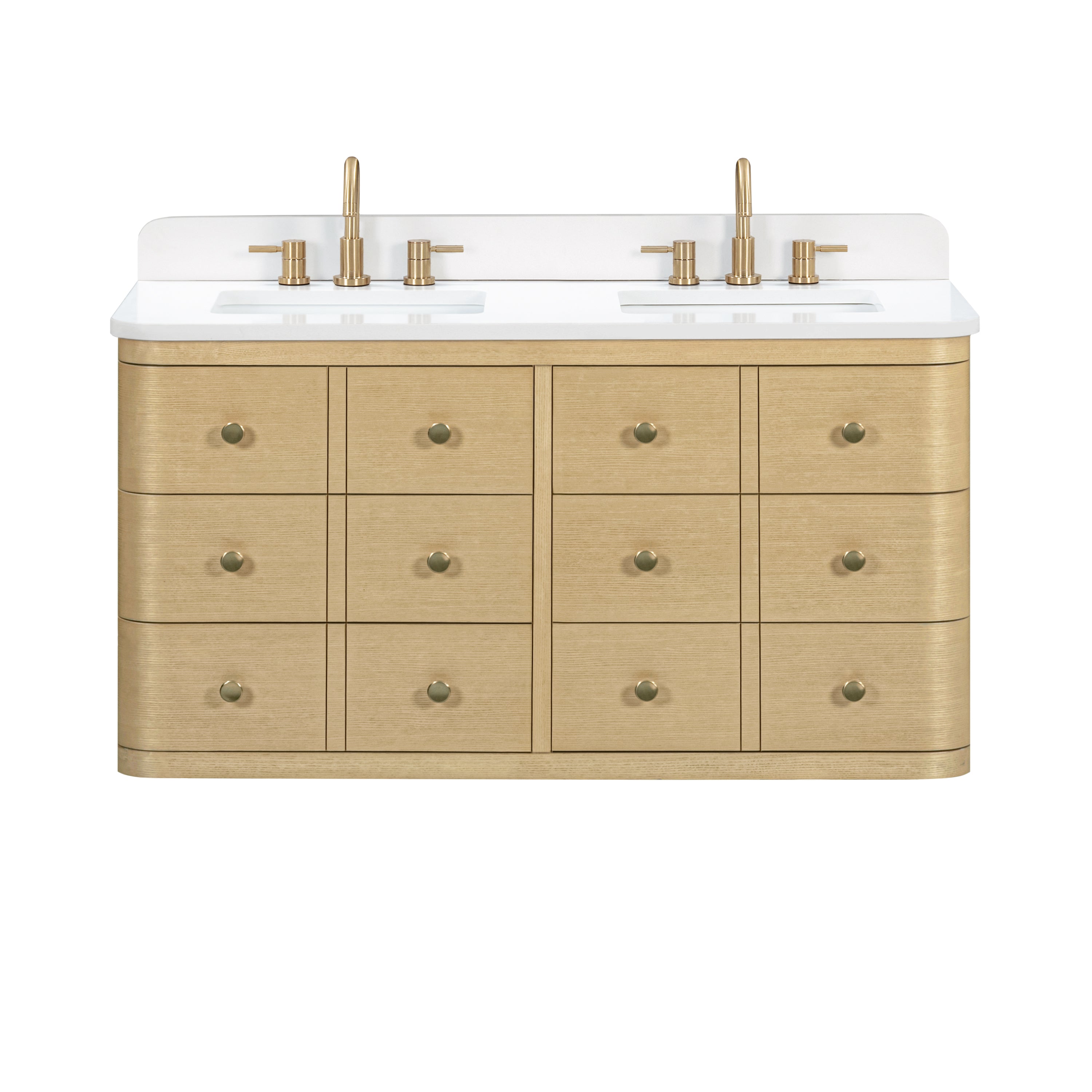 The Serena Collection displays a warm light oak finish with elegant gold hardware. Organic curves, inspired by midcentury design, blend seamlessly with an apothecary-style cabinet, offering ample storage and striking visual appeal. Integrated power strip with USB outlets included for convenience. Seamlessly balancing style and practicality, Serena promises to be the cornerstone of any bathroom space.