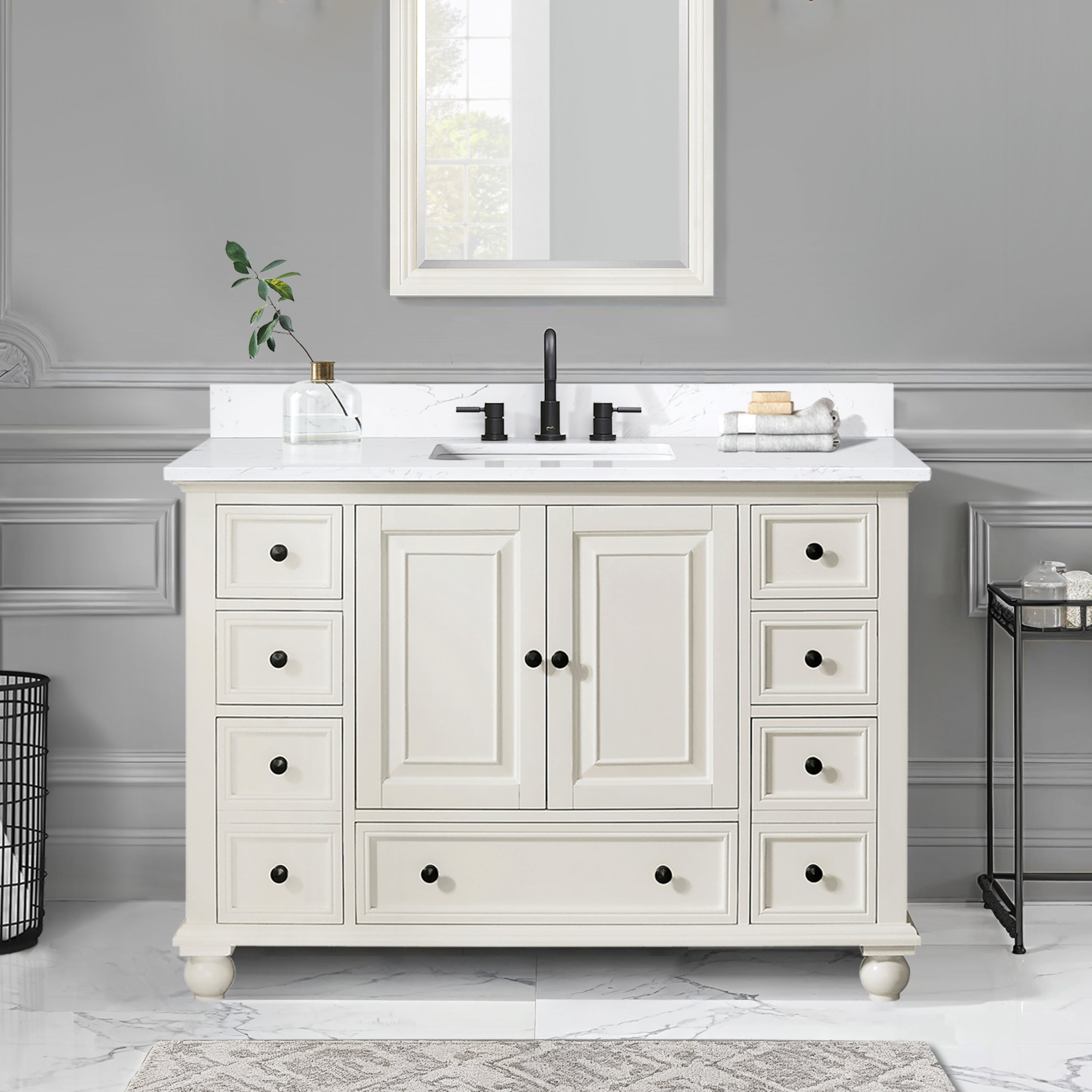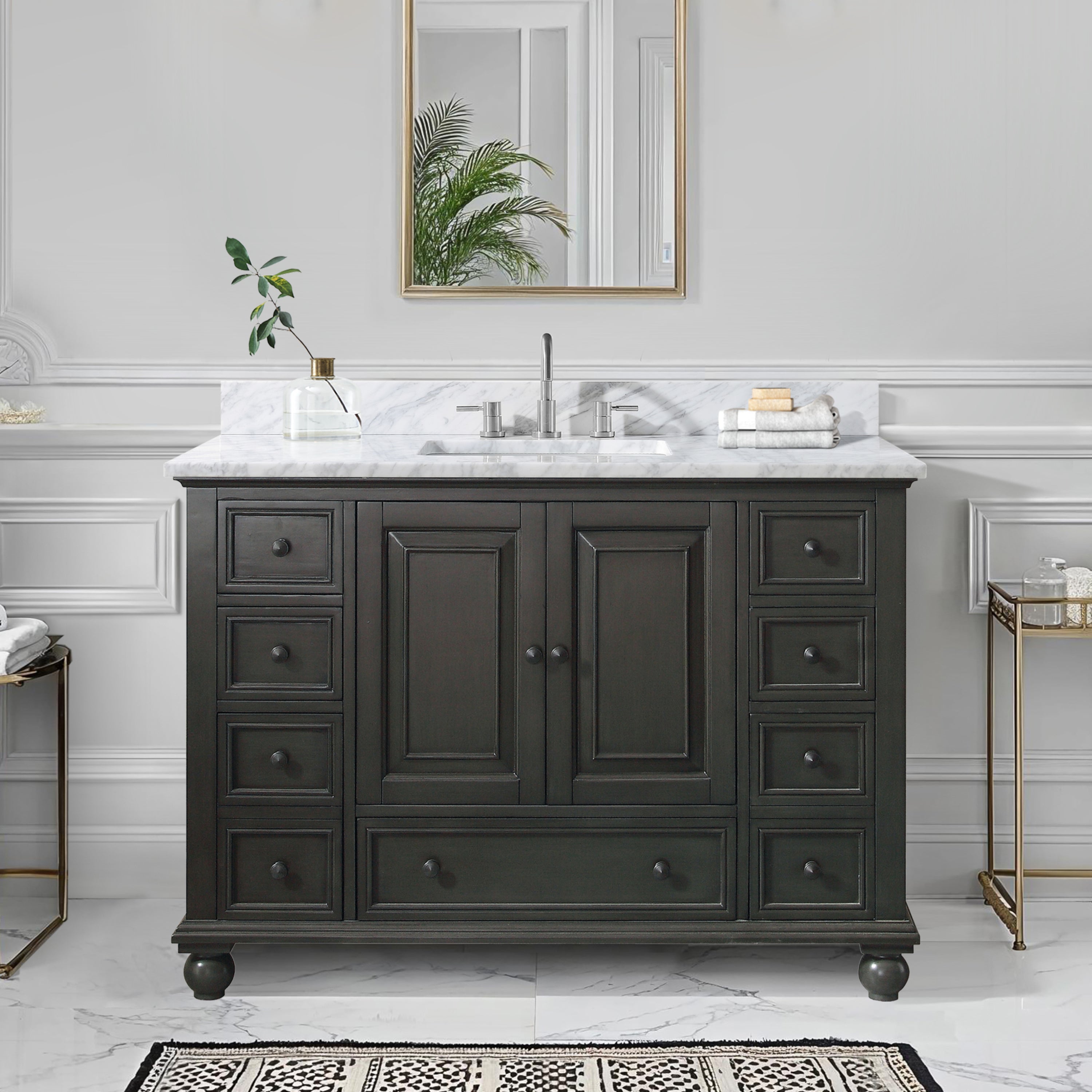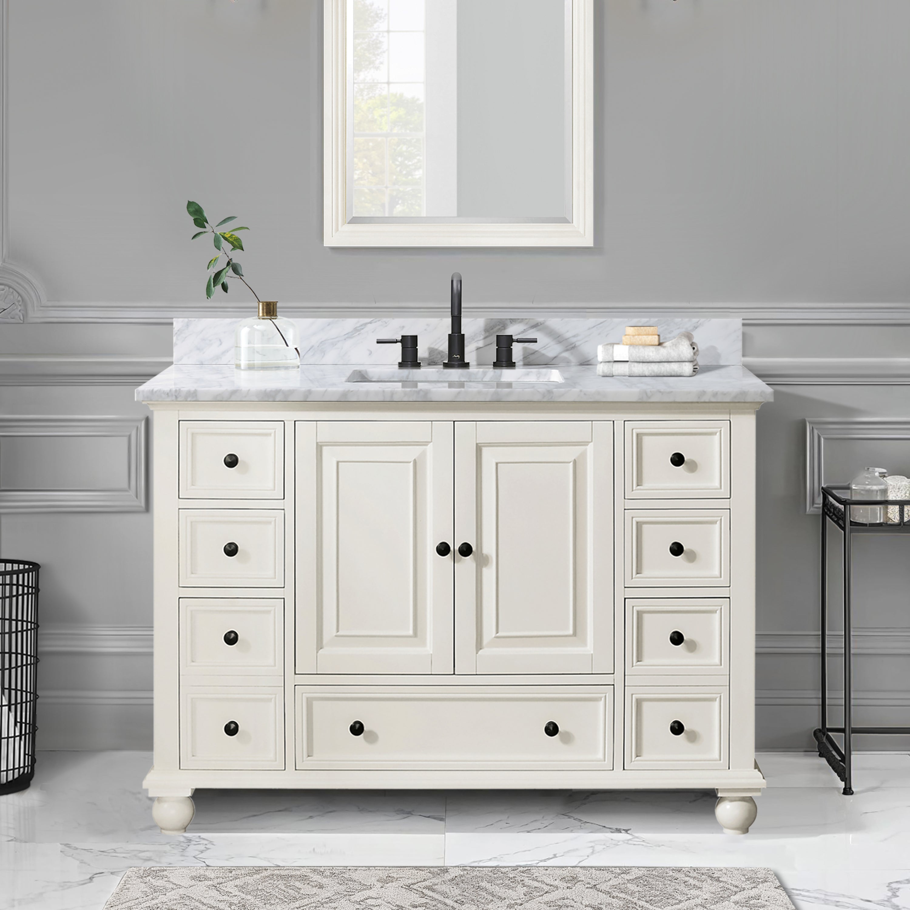 Classical in style, the Thompson vanity boasts a timeless appeal that will enhance the beauty of any bathroom. Tasteful detailing enriches the sophisticated aesthetic that includes the choice of either a Charcoal Glaze or French White finish. A solid wood frame, dovetail construction and Black Bronze hardware speak to the quality craftsmanship of this collection.